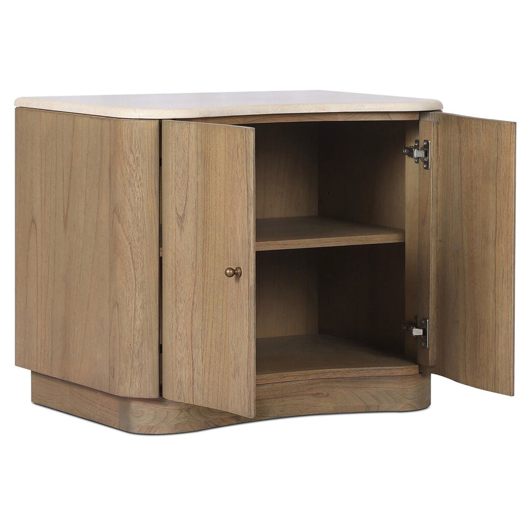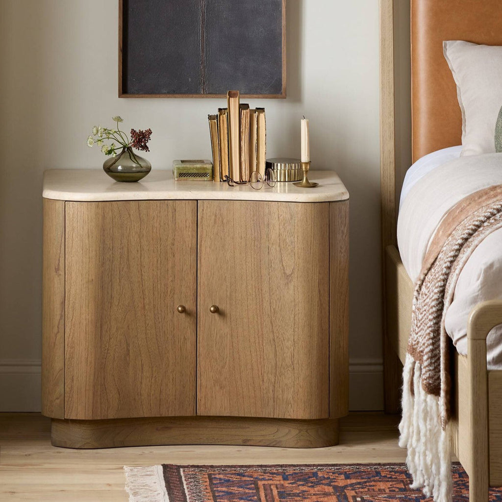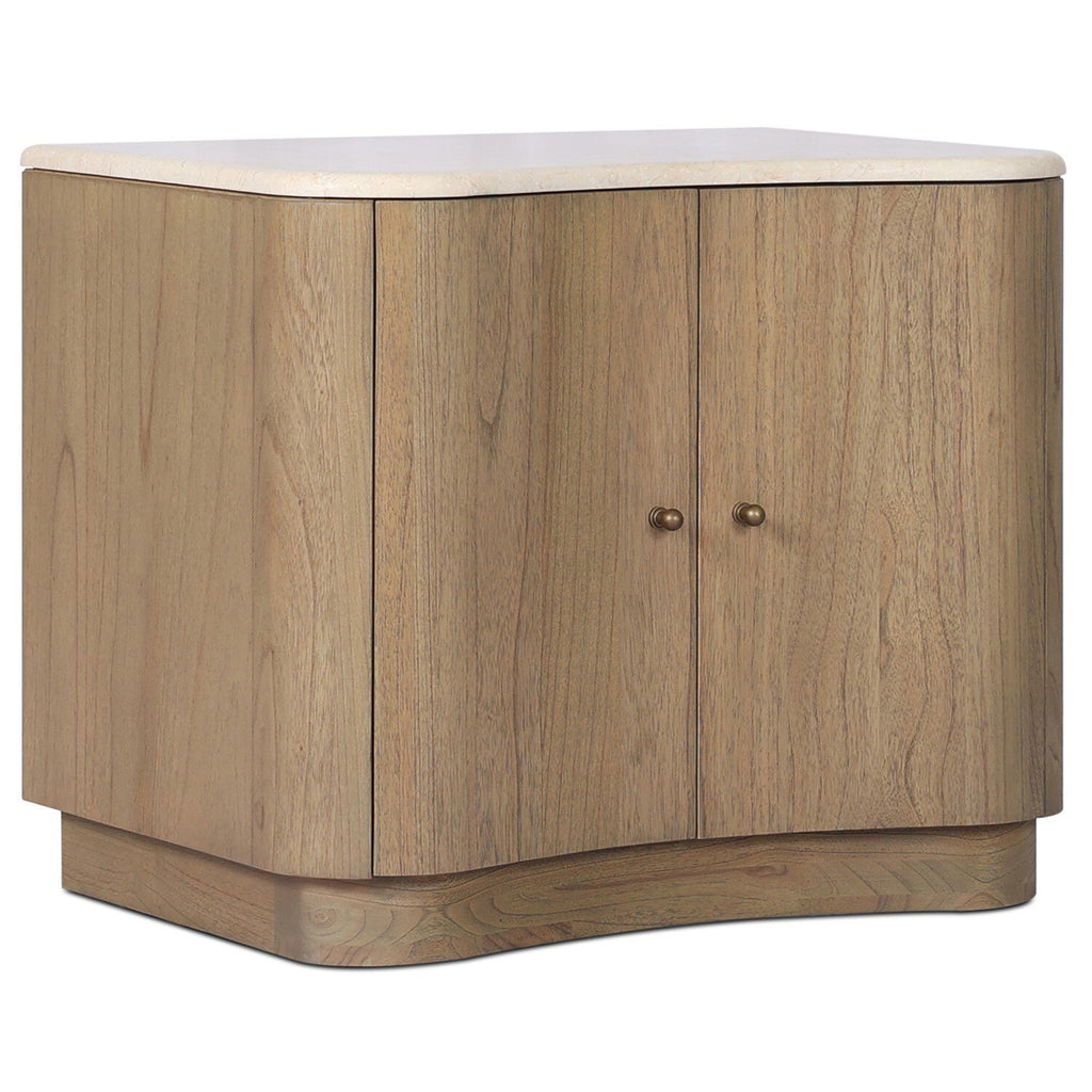 Fluid contours give shape to this solid mindi nightstand, topped with a creamy marbled top. Two doors with knobbed pulls open to inset shelves for organized bedside storage.