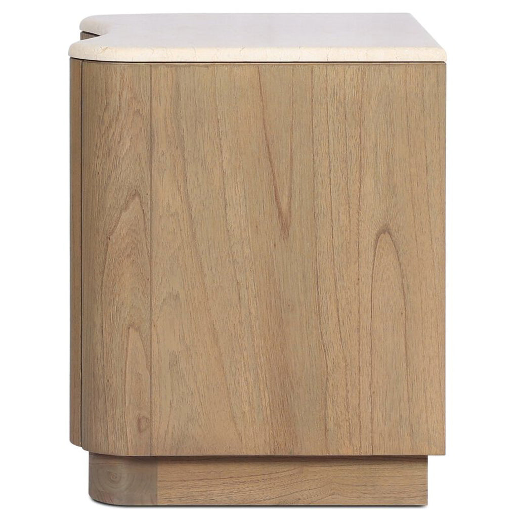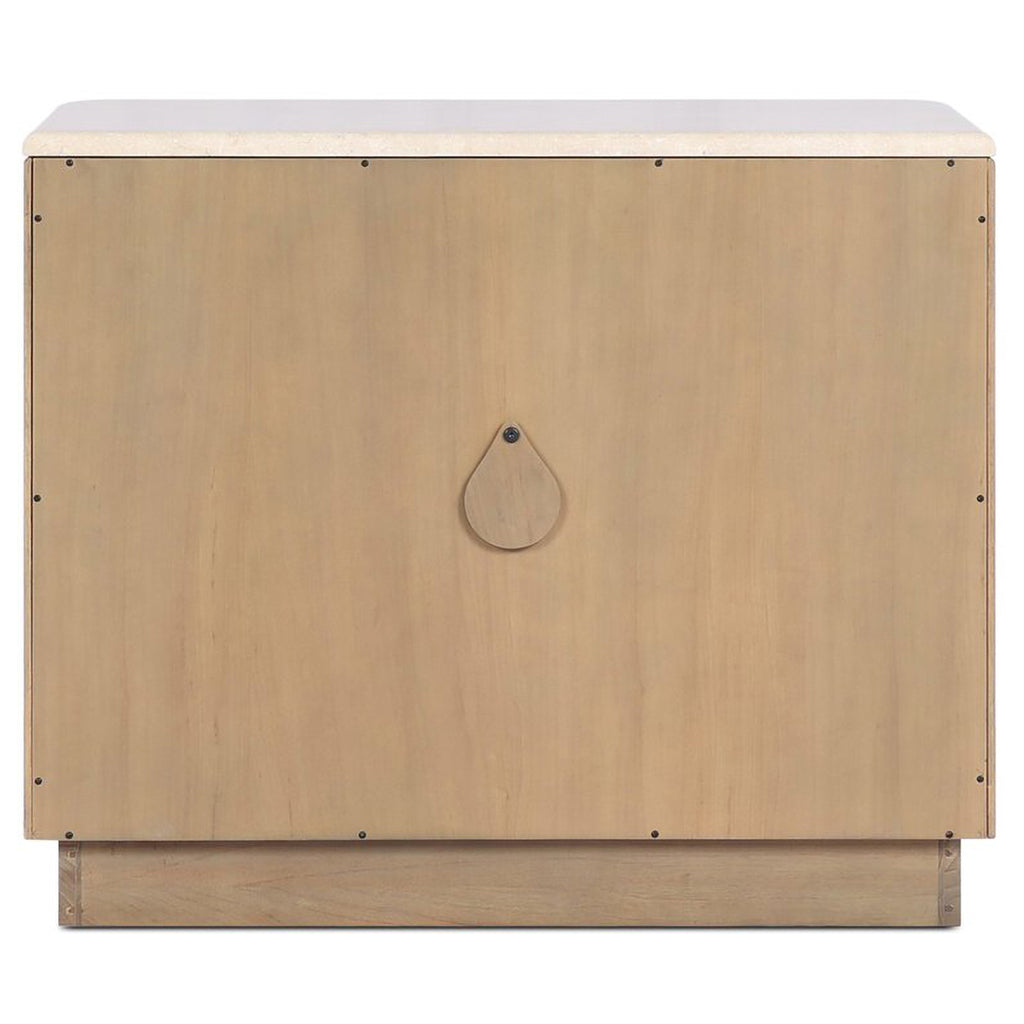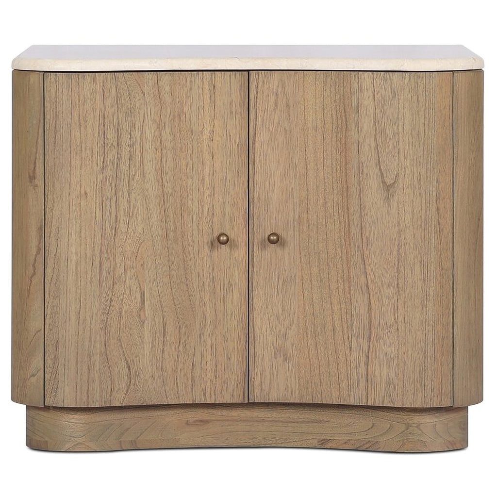 Fluid contours give shape to this solid mindi nightstand, topped with a creamy marbled top. Two doors with knobbed pulls open to inset shelves for organized bedside storage.
