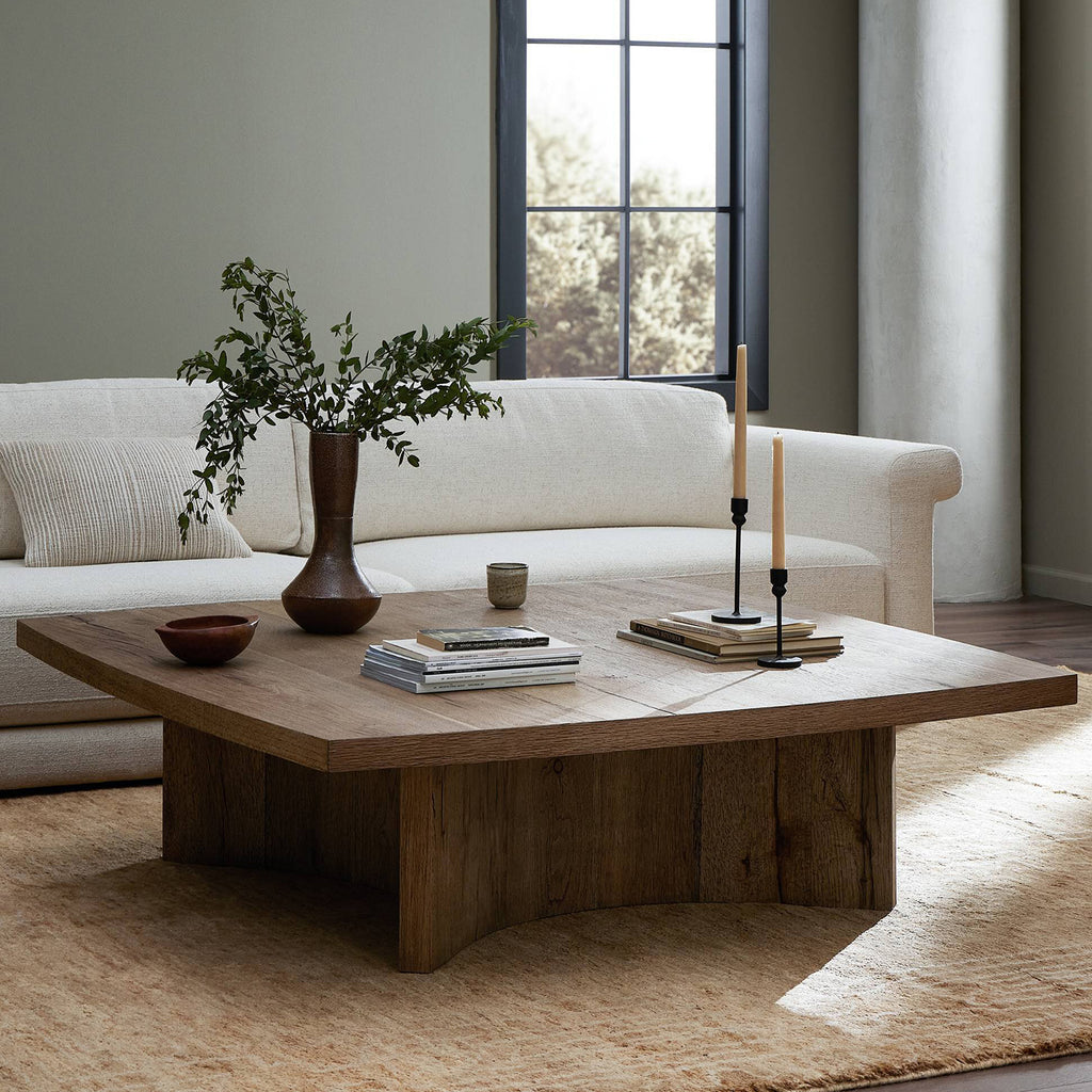 Structured lines and a light, rustic finish complete this squared coffee table of thick oak veneer.