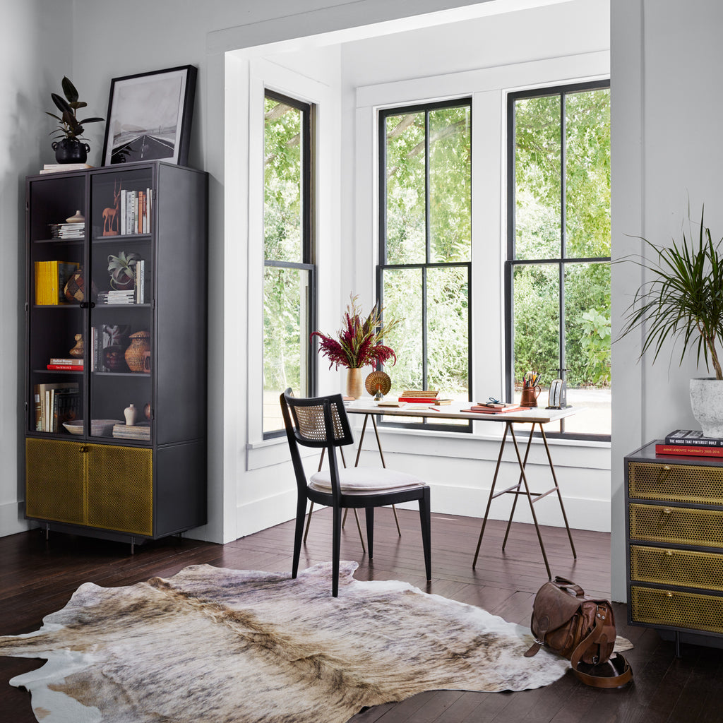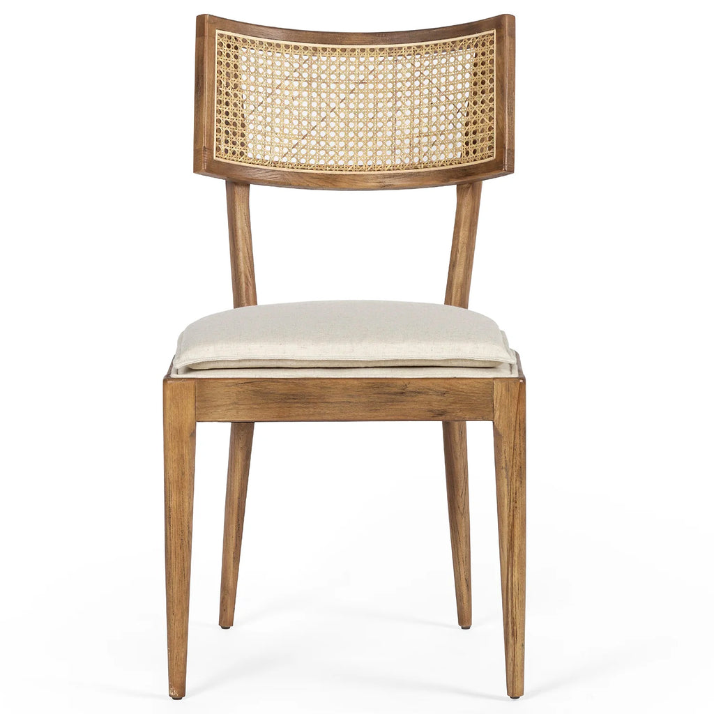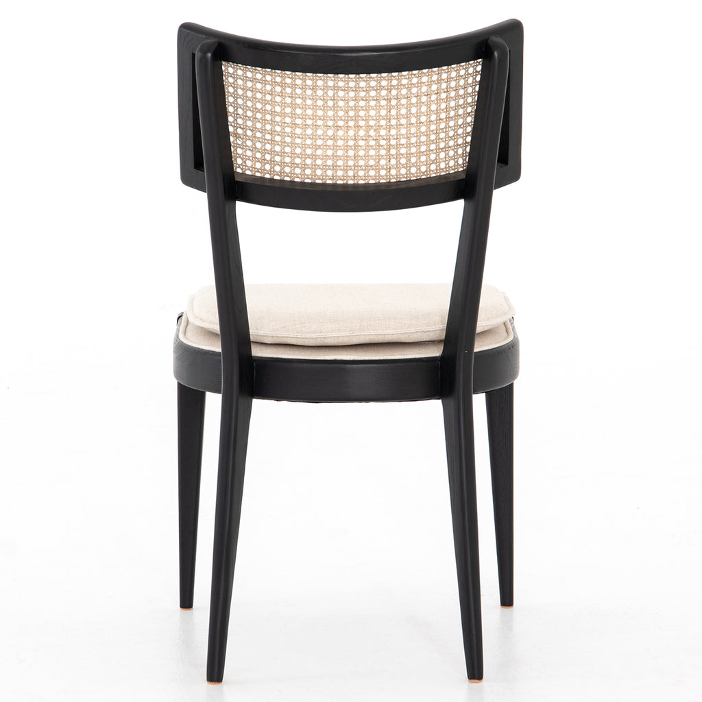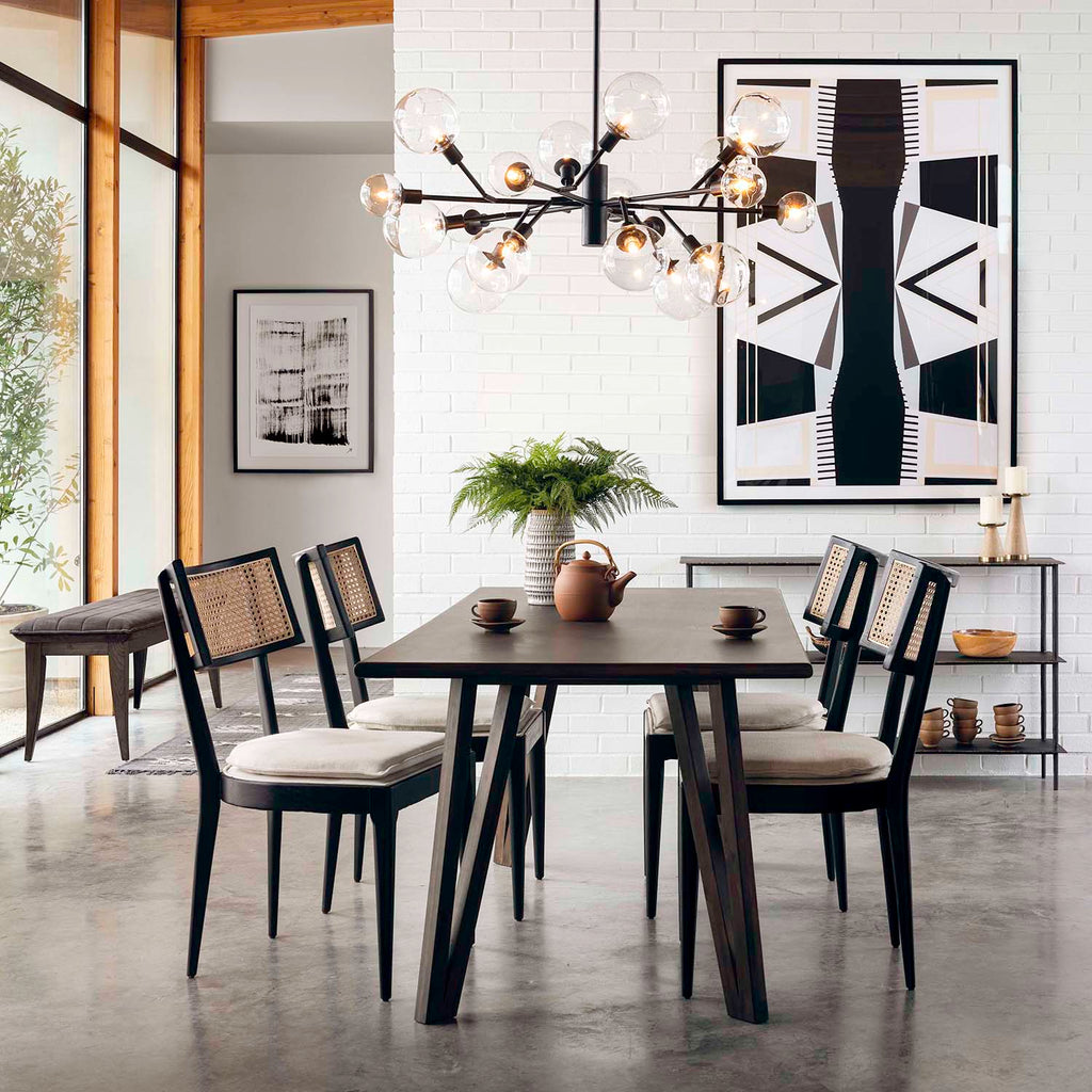 Resolutely modern, Four Hands furniture collection mixes materials and influences for a fresh, inspired look. Mixed materials refresh retro dining style. Brushed ebony or toasted nettlewood frames a textural inlay of natural cane, for perfect contrast. Neutral high-performance linen-blend seating for modern sensibility.