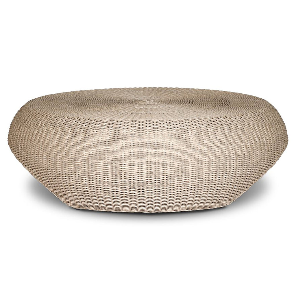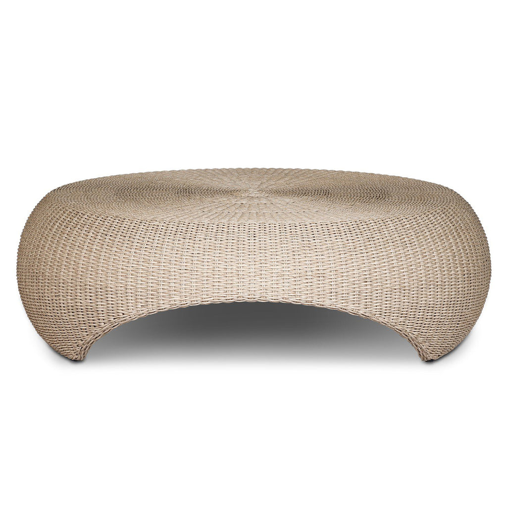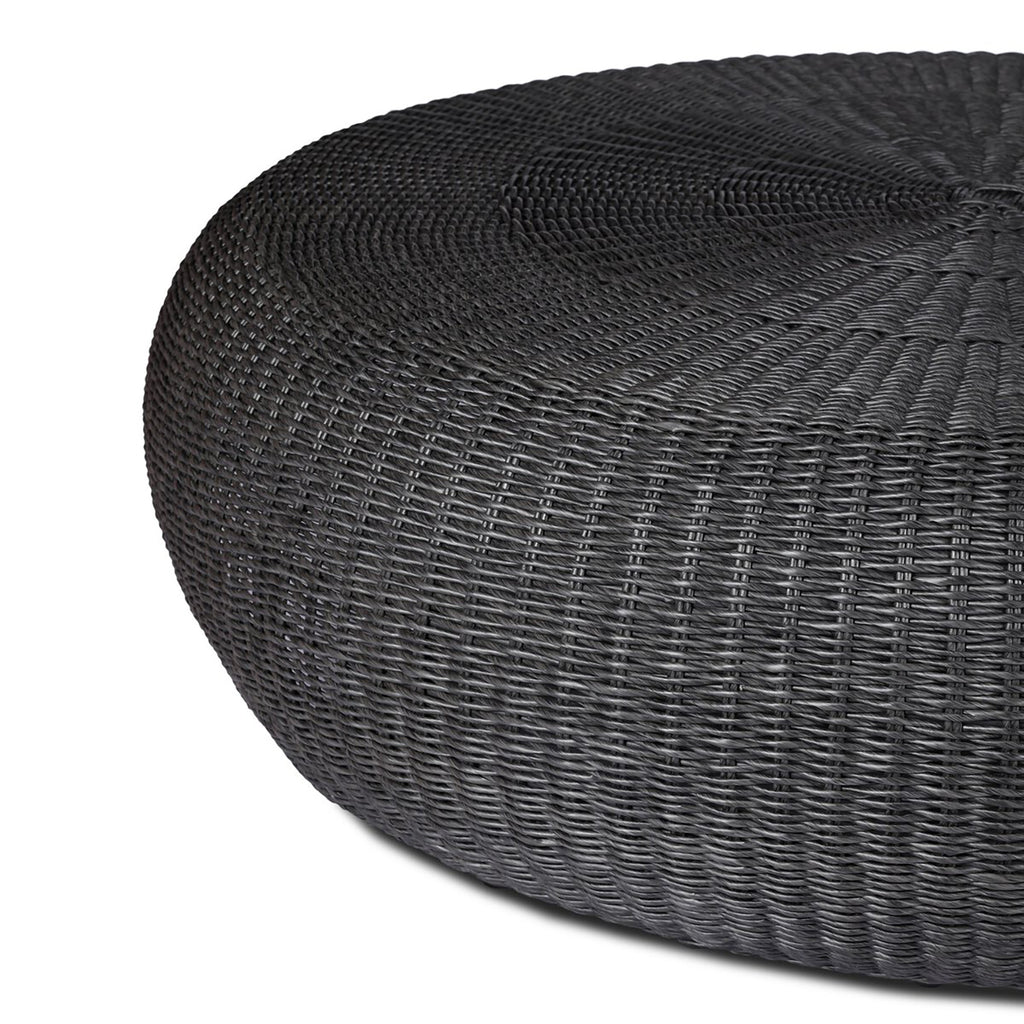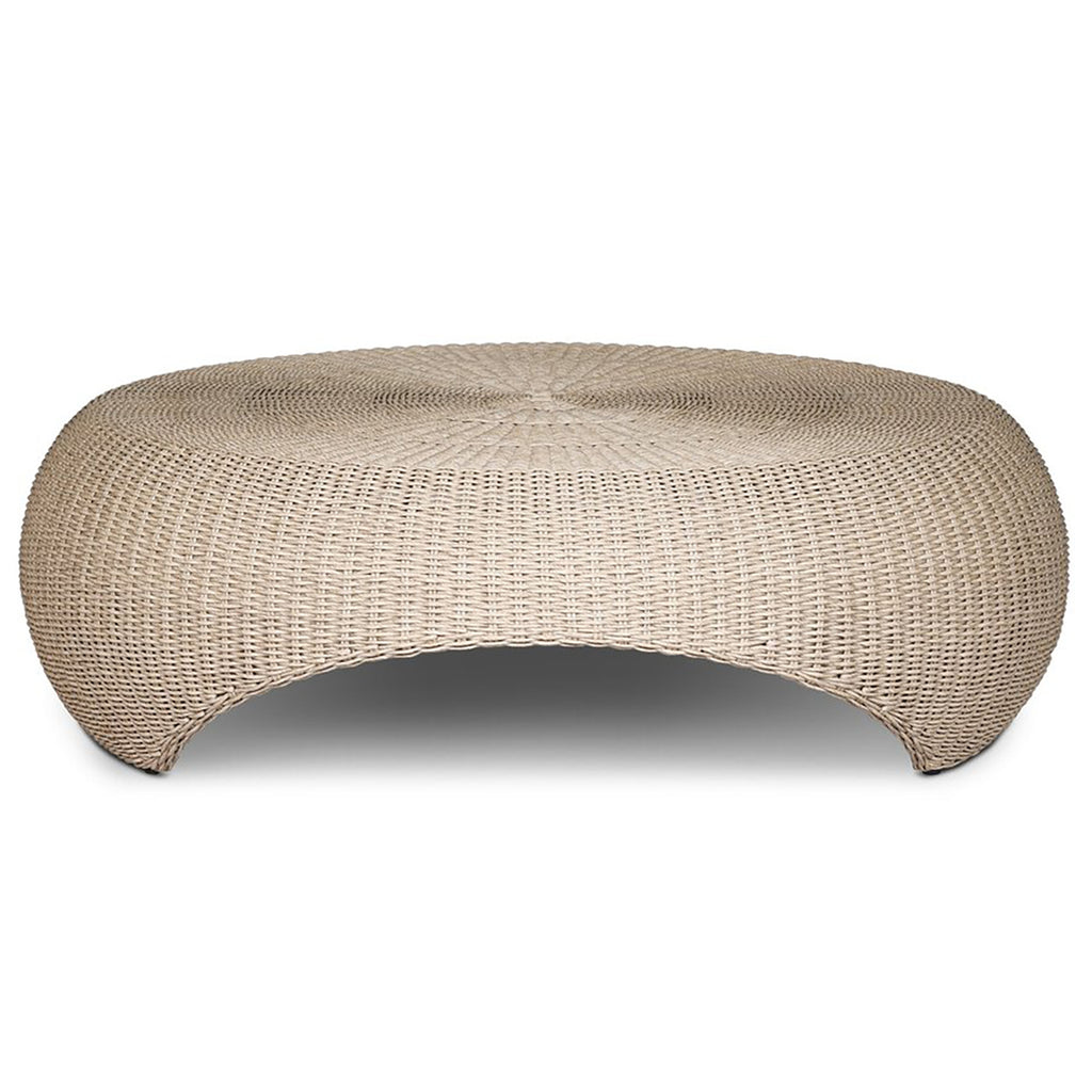 A classic round outdoor coffee table — with a twist. Fully woven and featuring bulbous sides and a round cutout detail for added dimension. Cover or store indoors during inclement weather and when not in use.