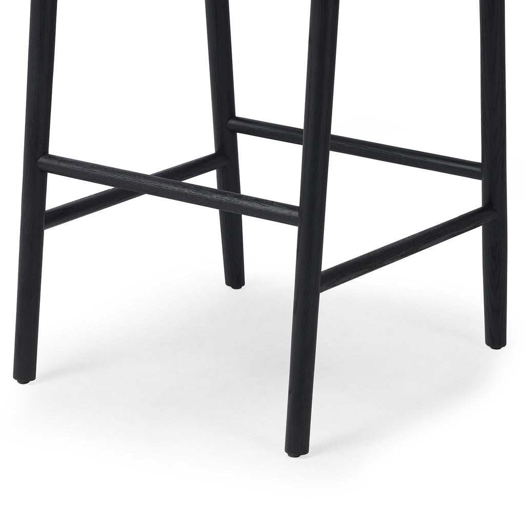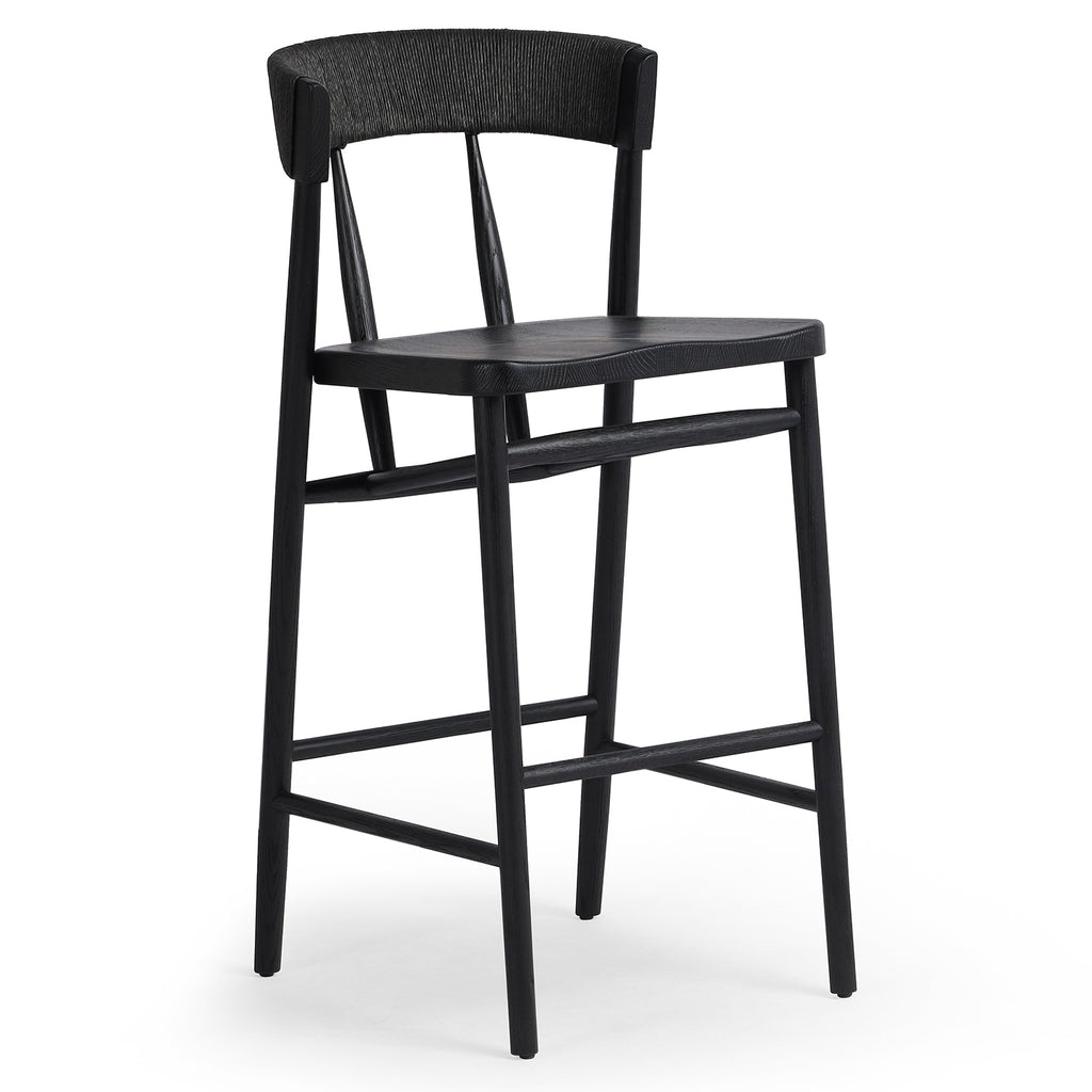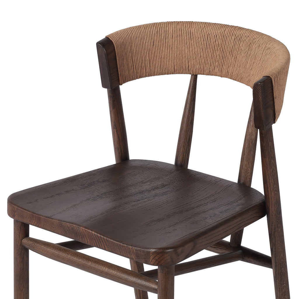 A solid oak bar stool defined by tapered legs and framing gives an updated look to the classic whistler chair. Finished with a paper rush wrapped detail on the back.