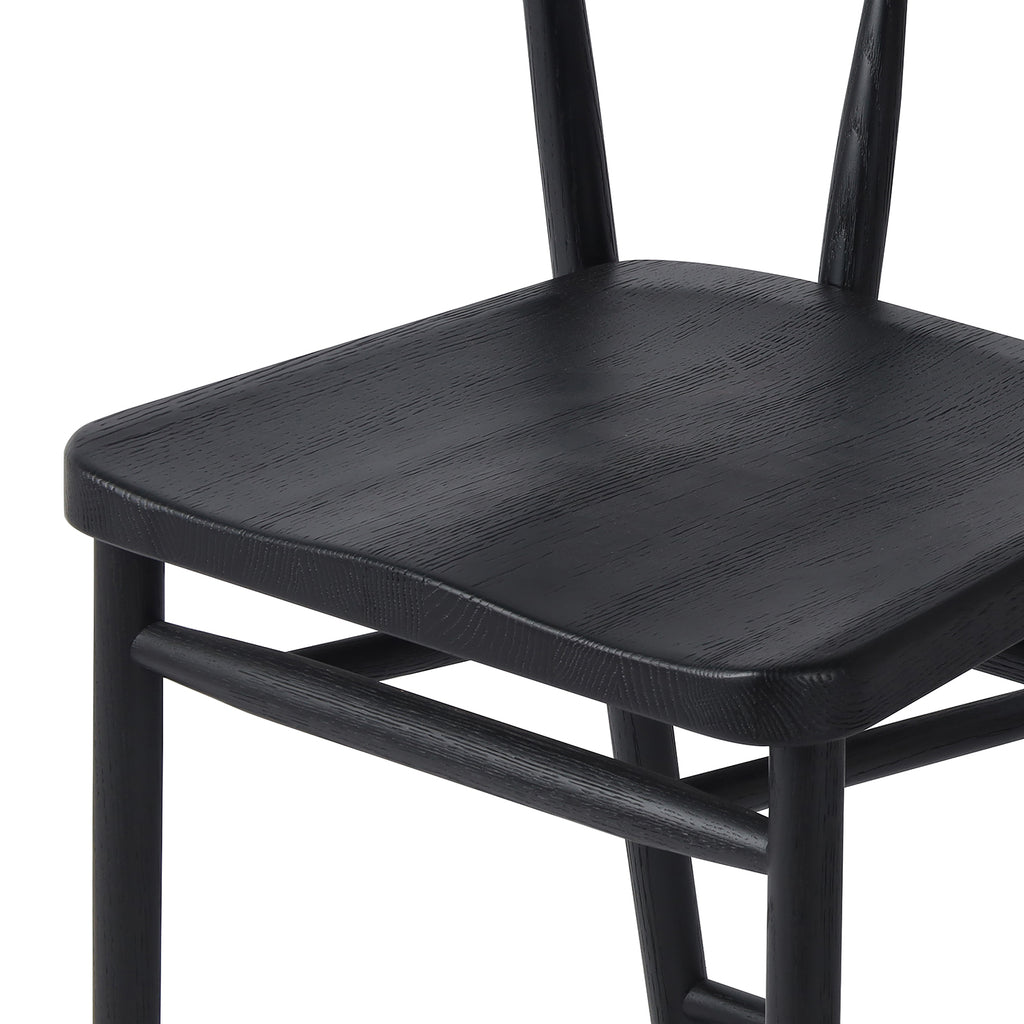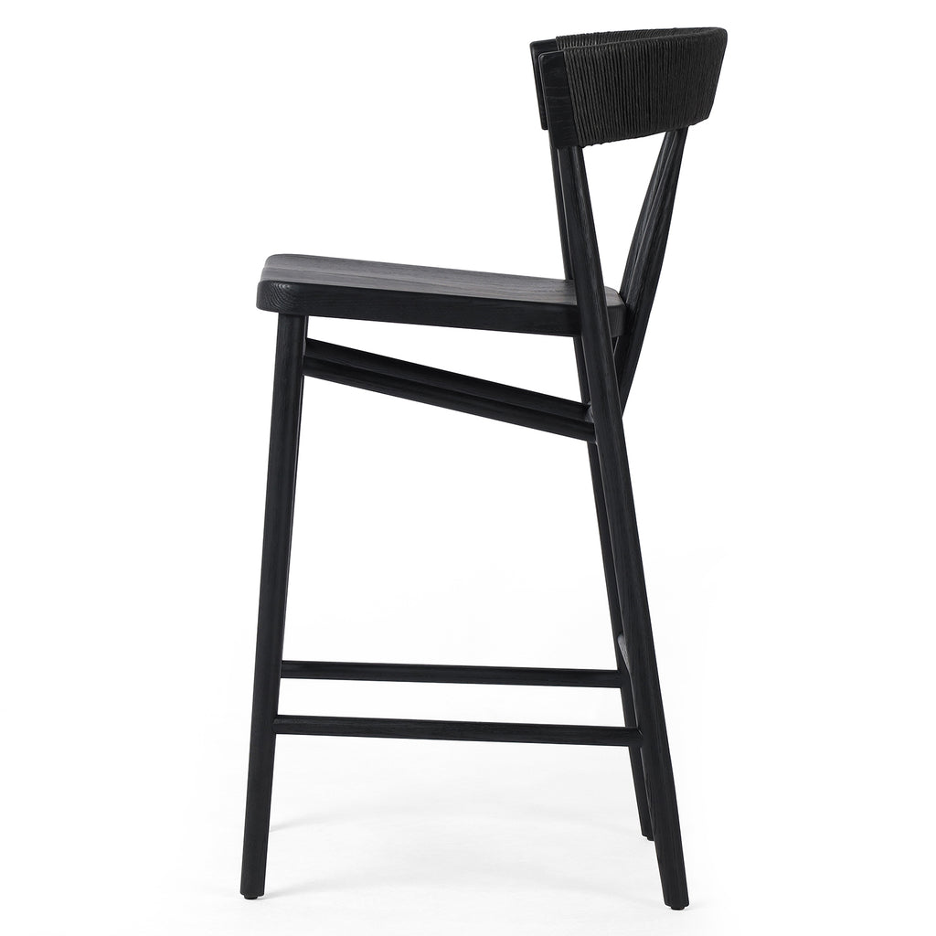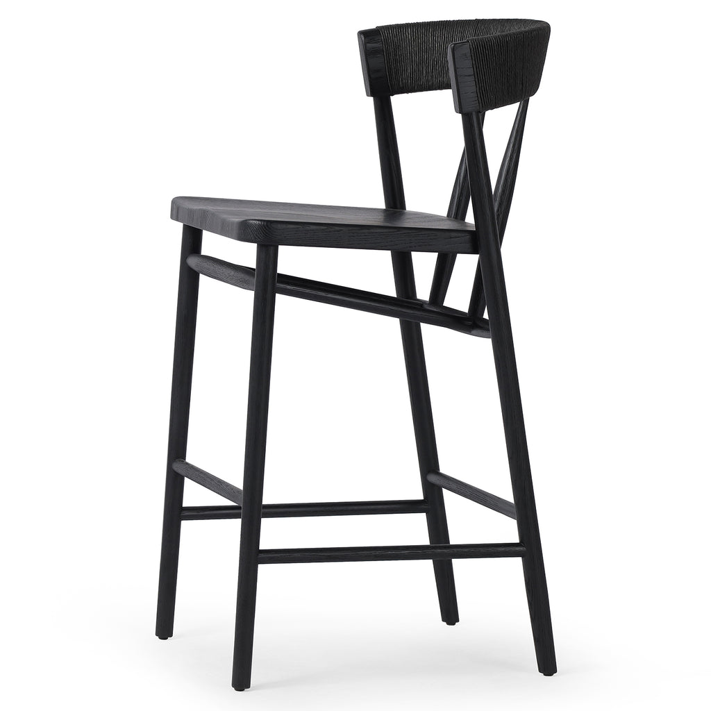 A solid oak bar stool defined by tapered legs and framing gives an updated look to the classic whistler chair. Finished with a paper rush wrapped detail on the back.