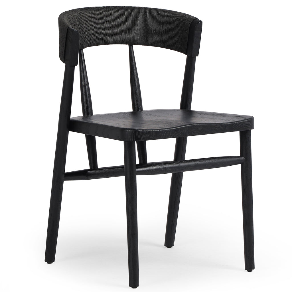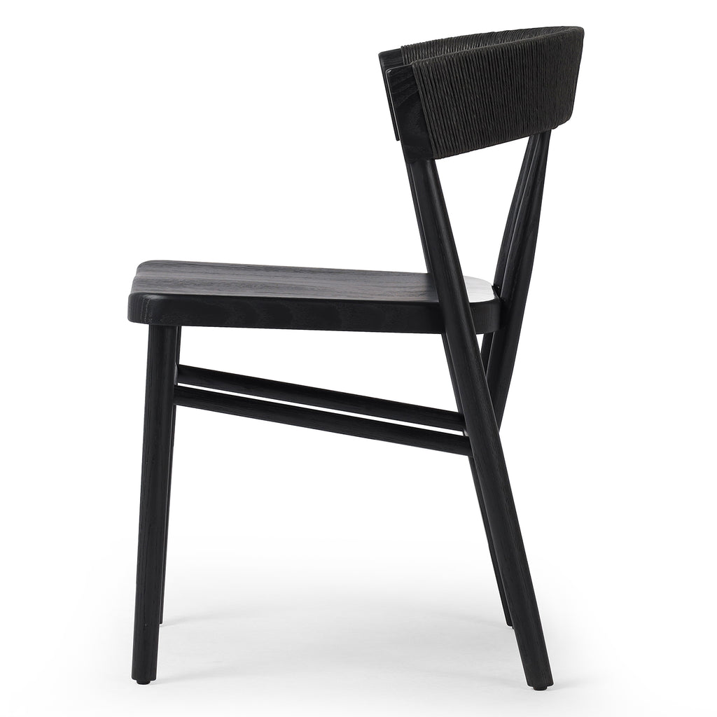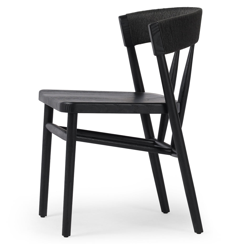A solid oak dining chair defined by tapered legs and framing gives an updated look to the classic whistler chair. Finished with a paper rush wrapped detail on the back.