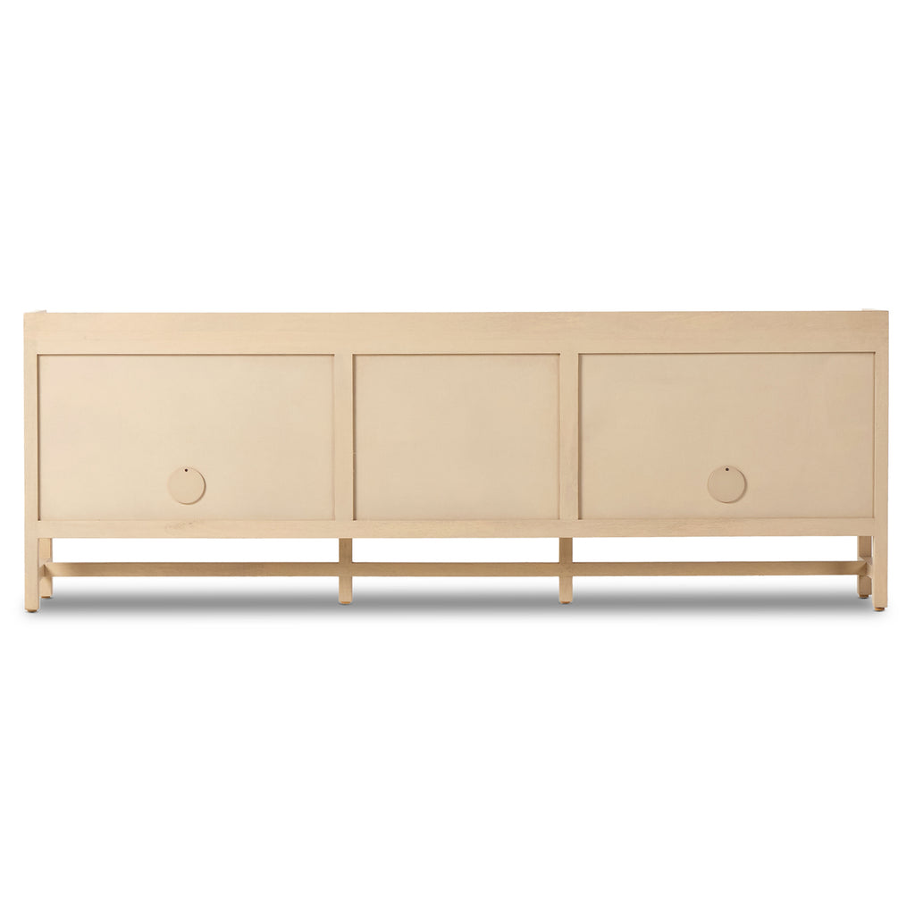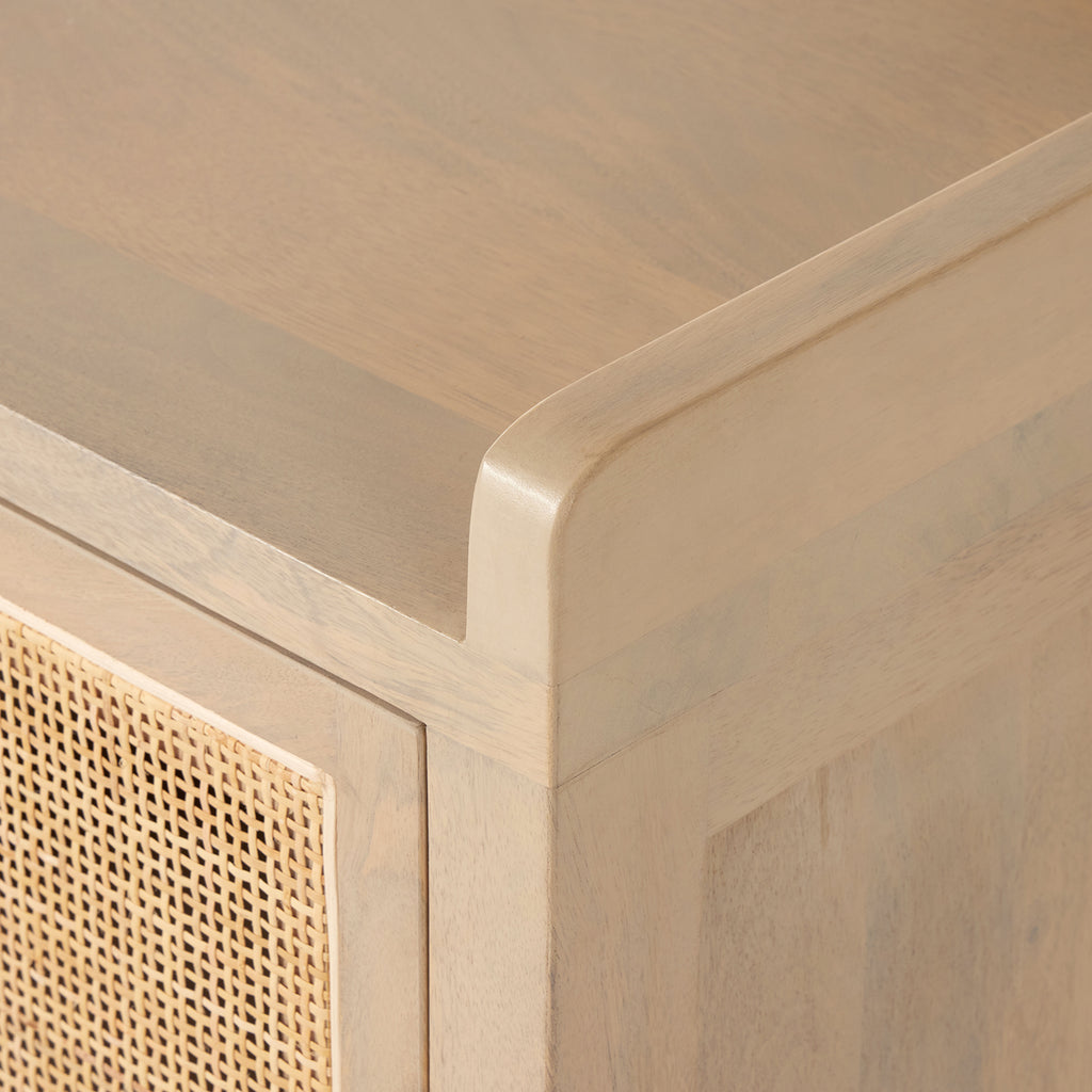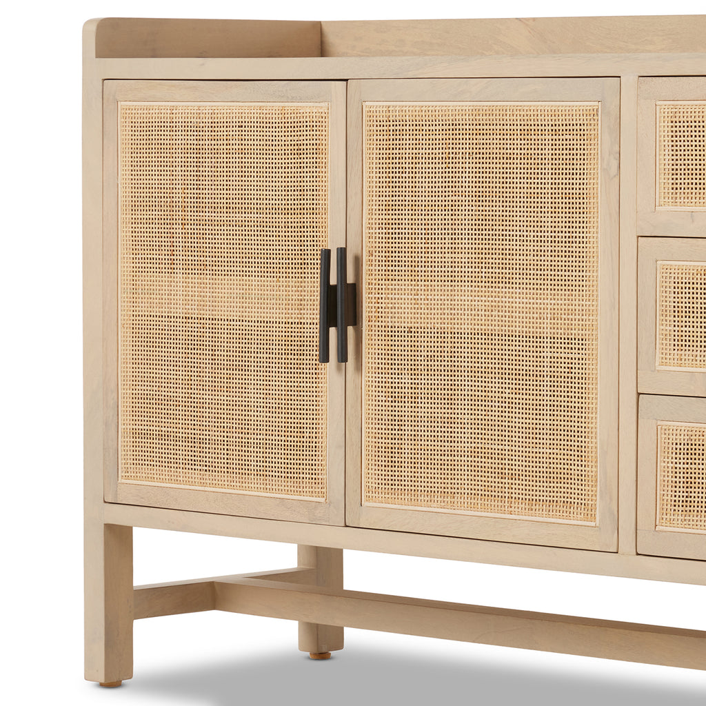 Monochromatic with a textural twist. Natural mango frames woven cane fronts, with black iron hardware for subtle contrast. Inside, spacious shelving and drawer space awaits storage of dinnerware and more.