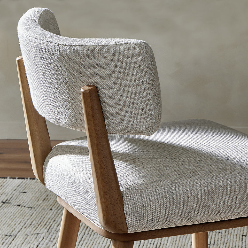 Natural solid parawood forms a curved barrel back on this everyday dining stool. Plush cushioned seat and back are upholstered in a textural woven fabric.