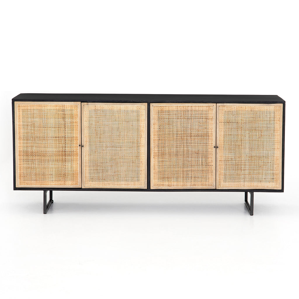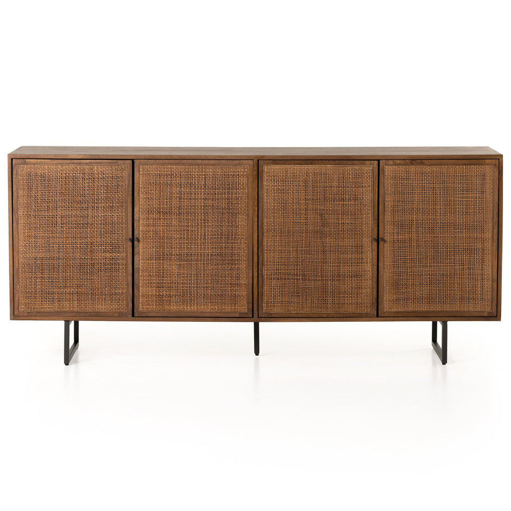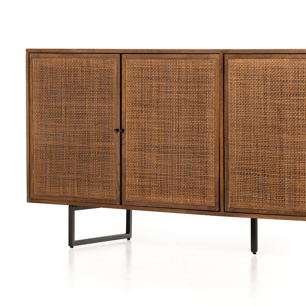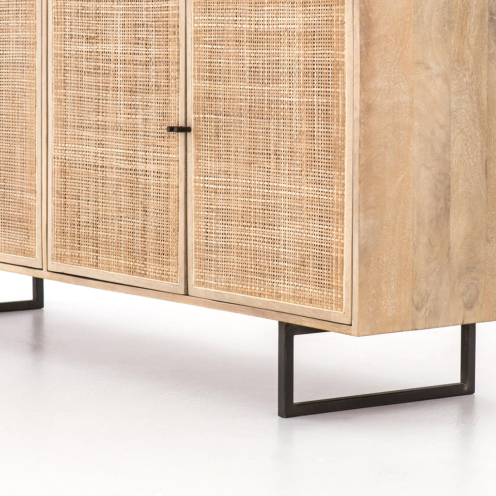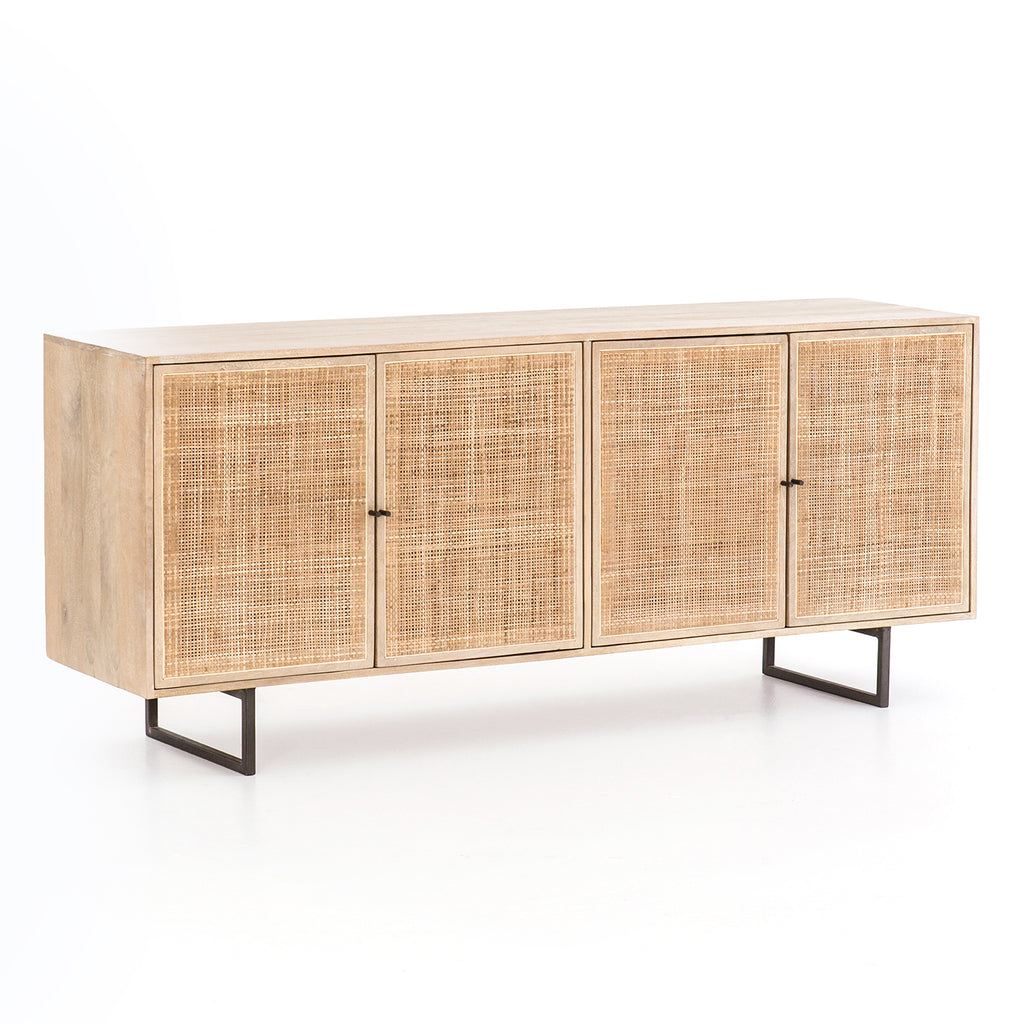 Resolutely modern, Four Hands furniture collection mixes materials and influences for a fresh, inspired look. Mid-century-inspired style with an organic twist. Surrounded by mango casing, light cane weaves for a fresh look with natural depth. Angular finished iron legs offer an intriguing contrast of texture and tone.