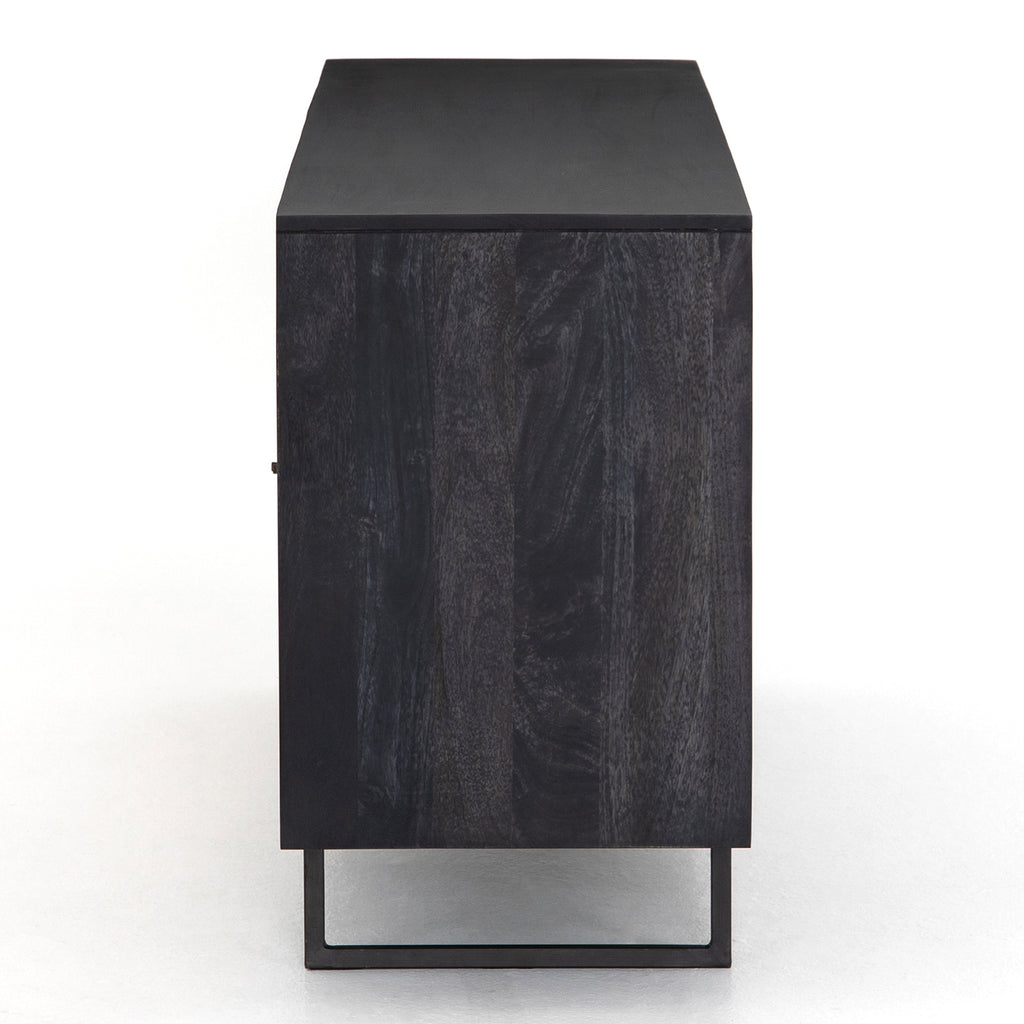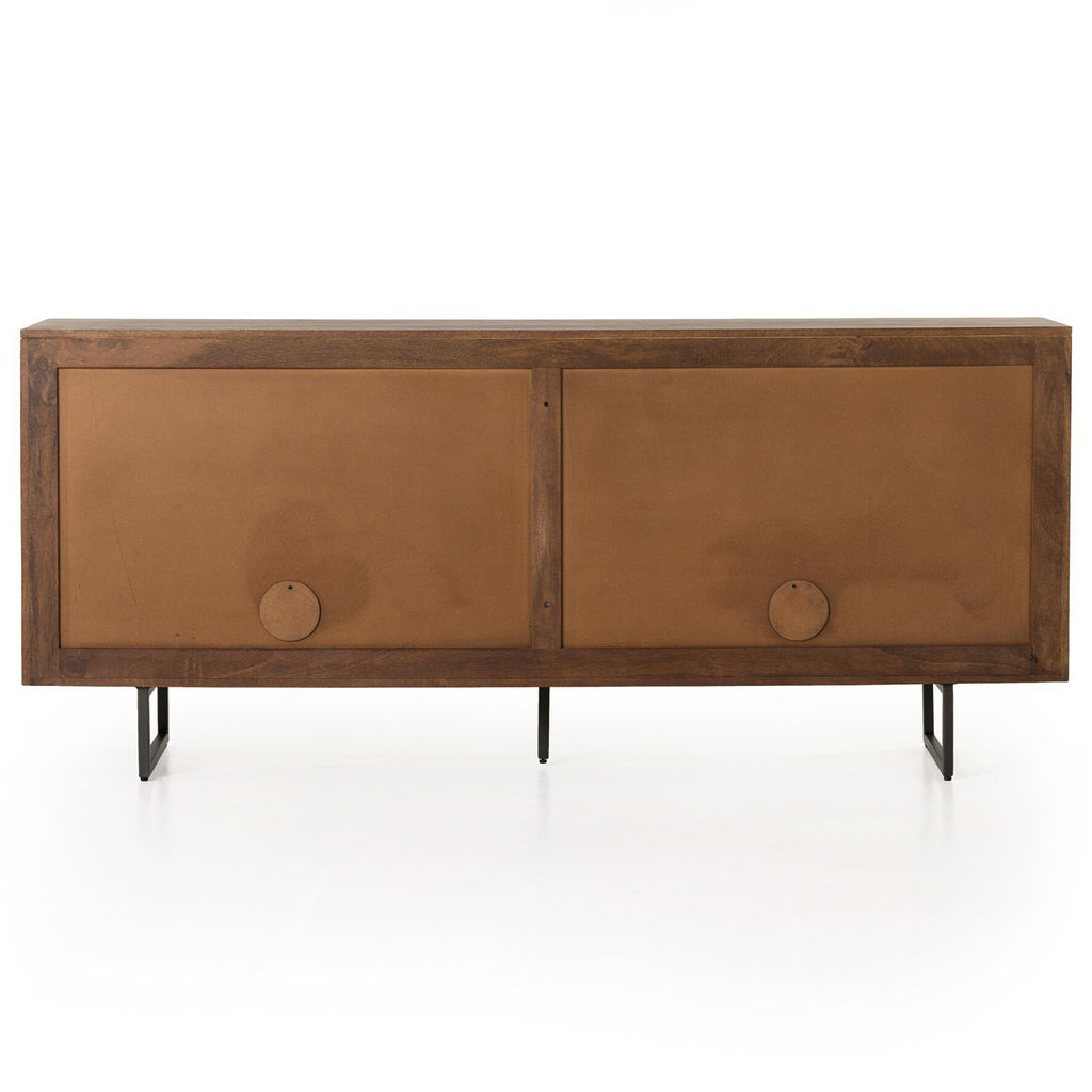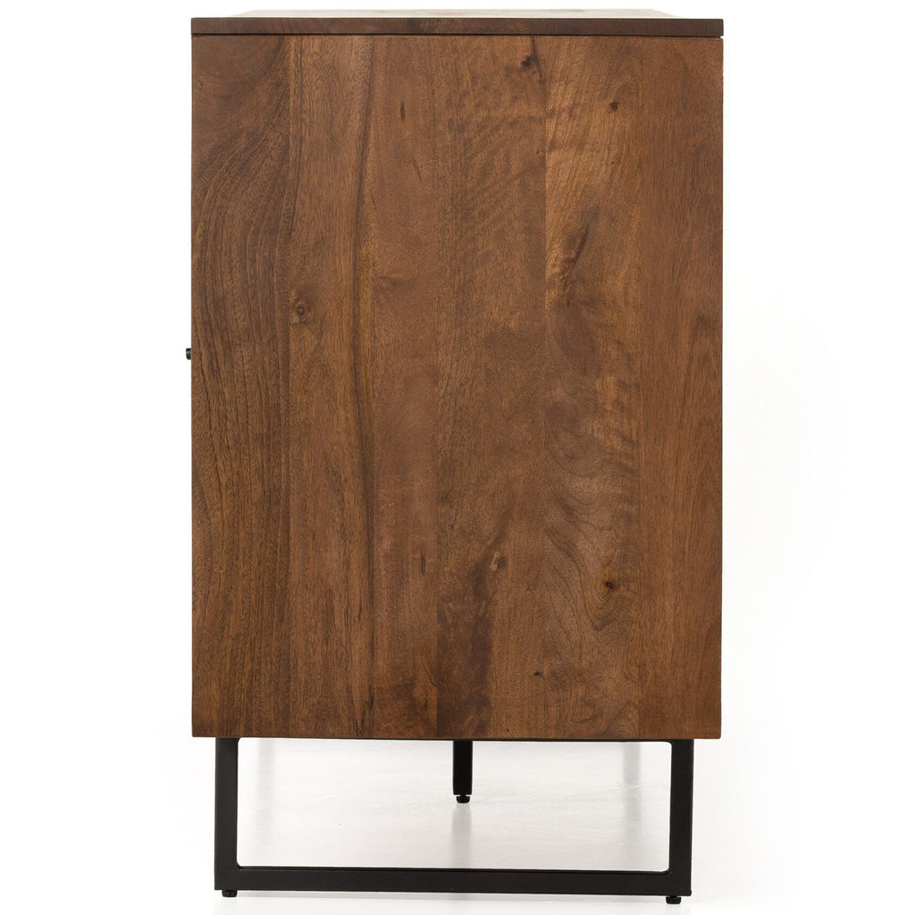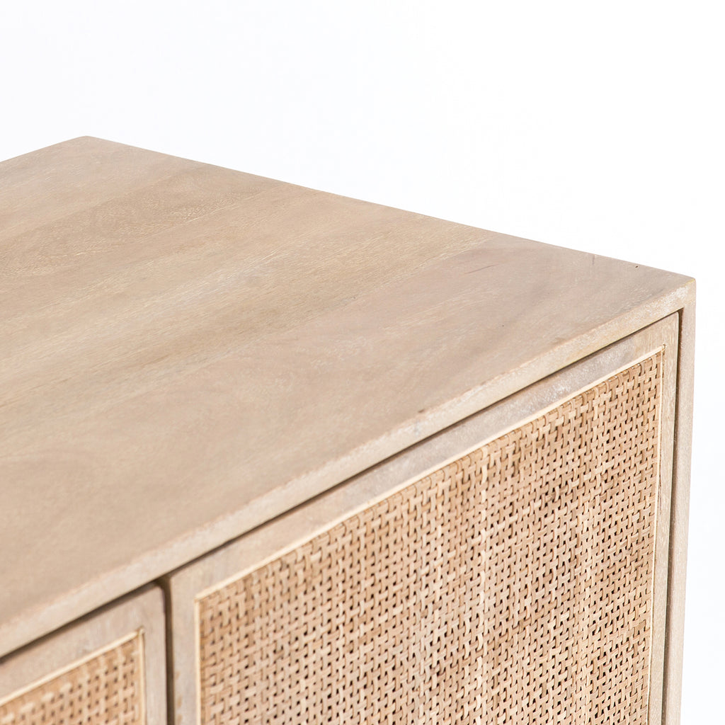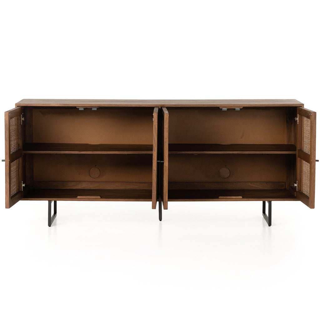 Resolutely modern, Four Hands furniture collection mixes materials and influences for a fresh, inspired look. Mid-century-inspired style with an organic twist. Surrounded by mango casing, light cane weaves for a fresh look with natural depth. Angular finished iron legs offer an intriguing contrast of texture and tone.