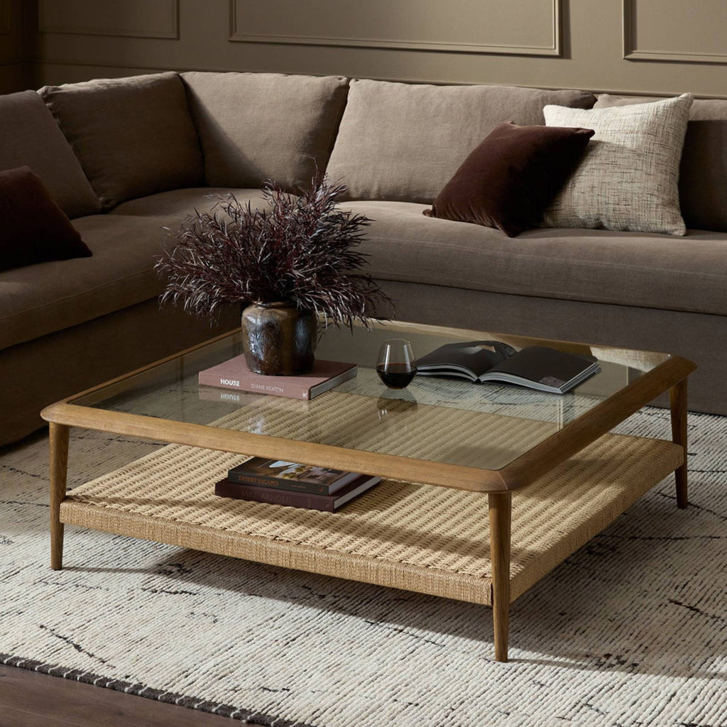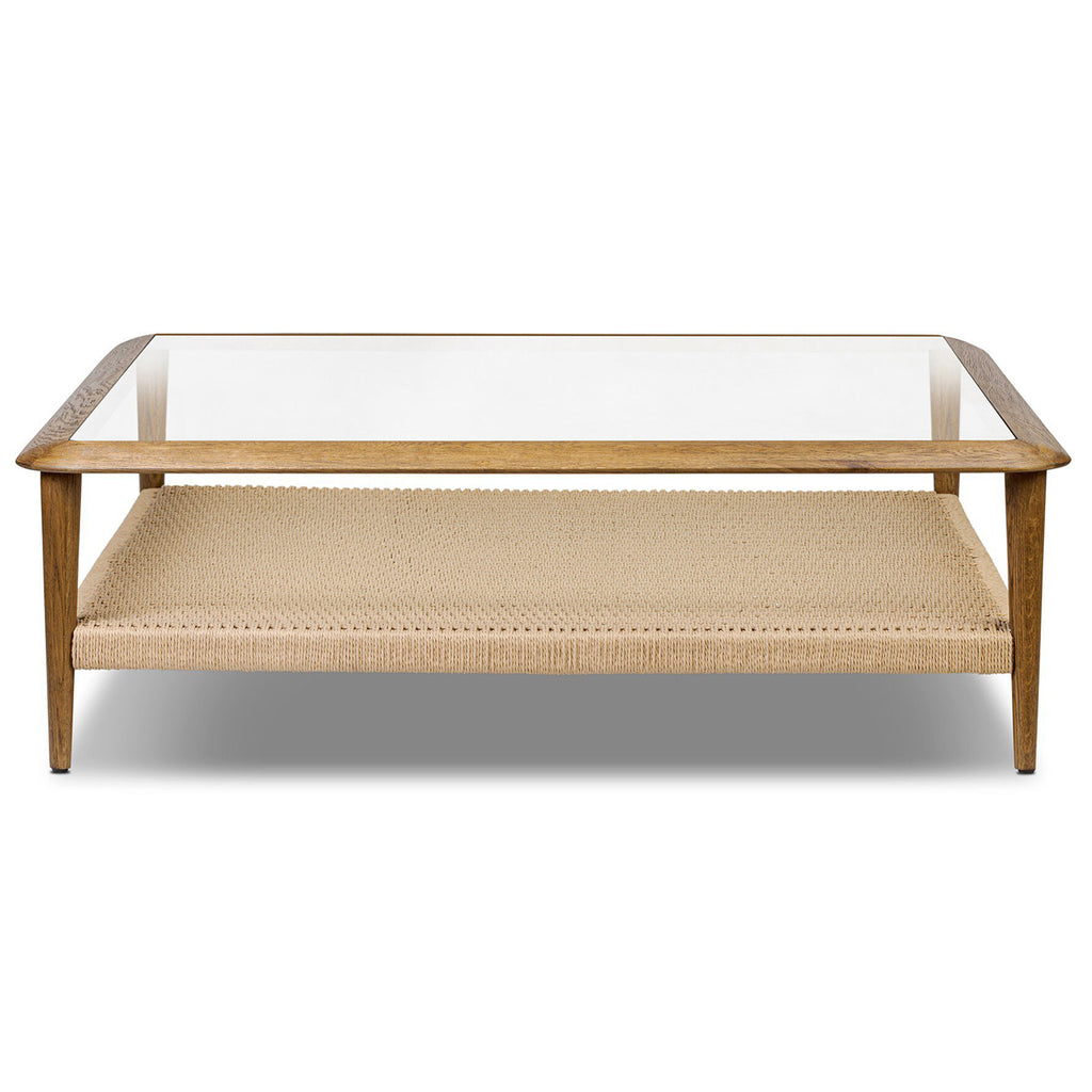 Anchor your space with mixed materials. Made from brown oak, natural paper cord and tempered glass, with shelving for extra storage and display.