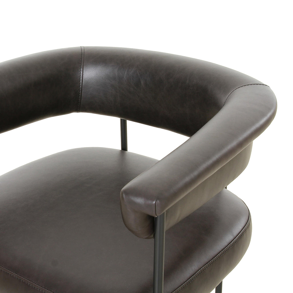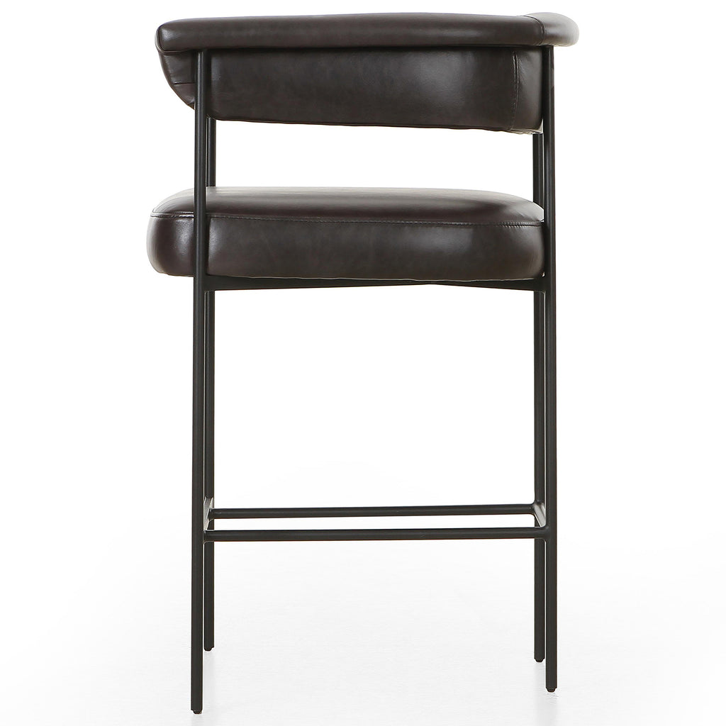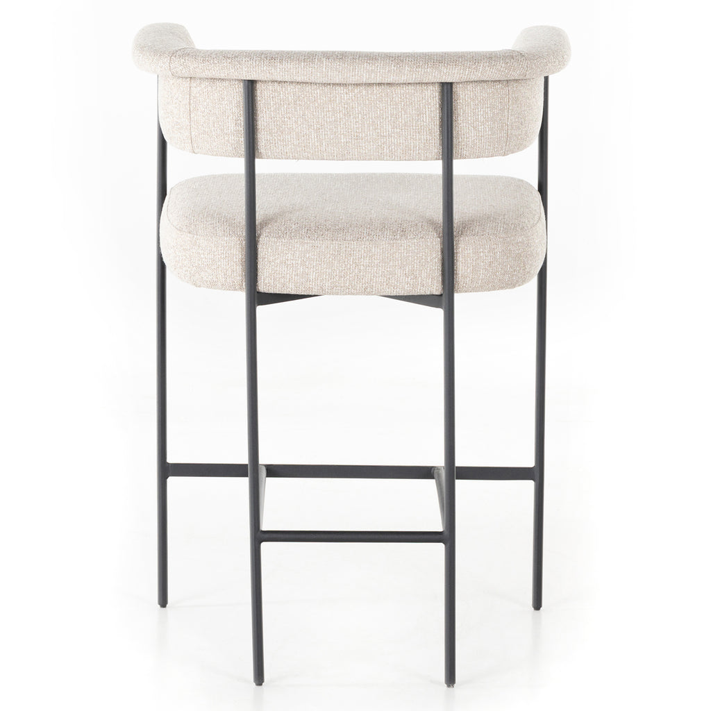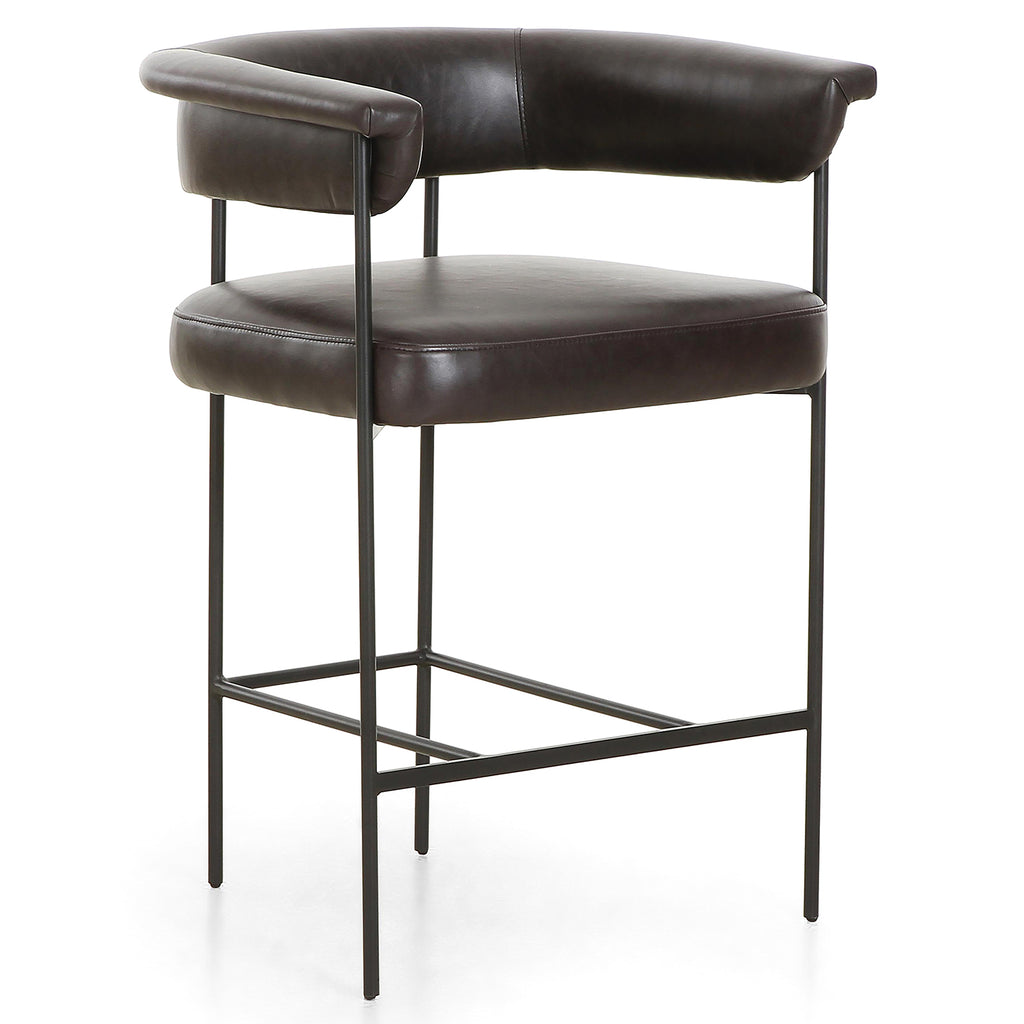 Airy and light with slim, black-finished iron framing, camel-colored upholstery lends texture to a beautifully sculpted counter stool style featuring a yoke back and exterior fold detailing.