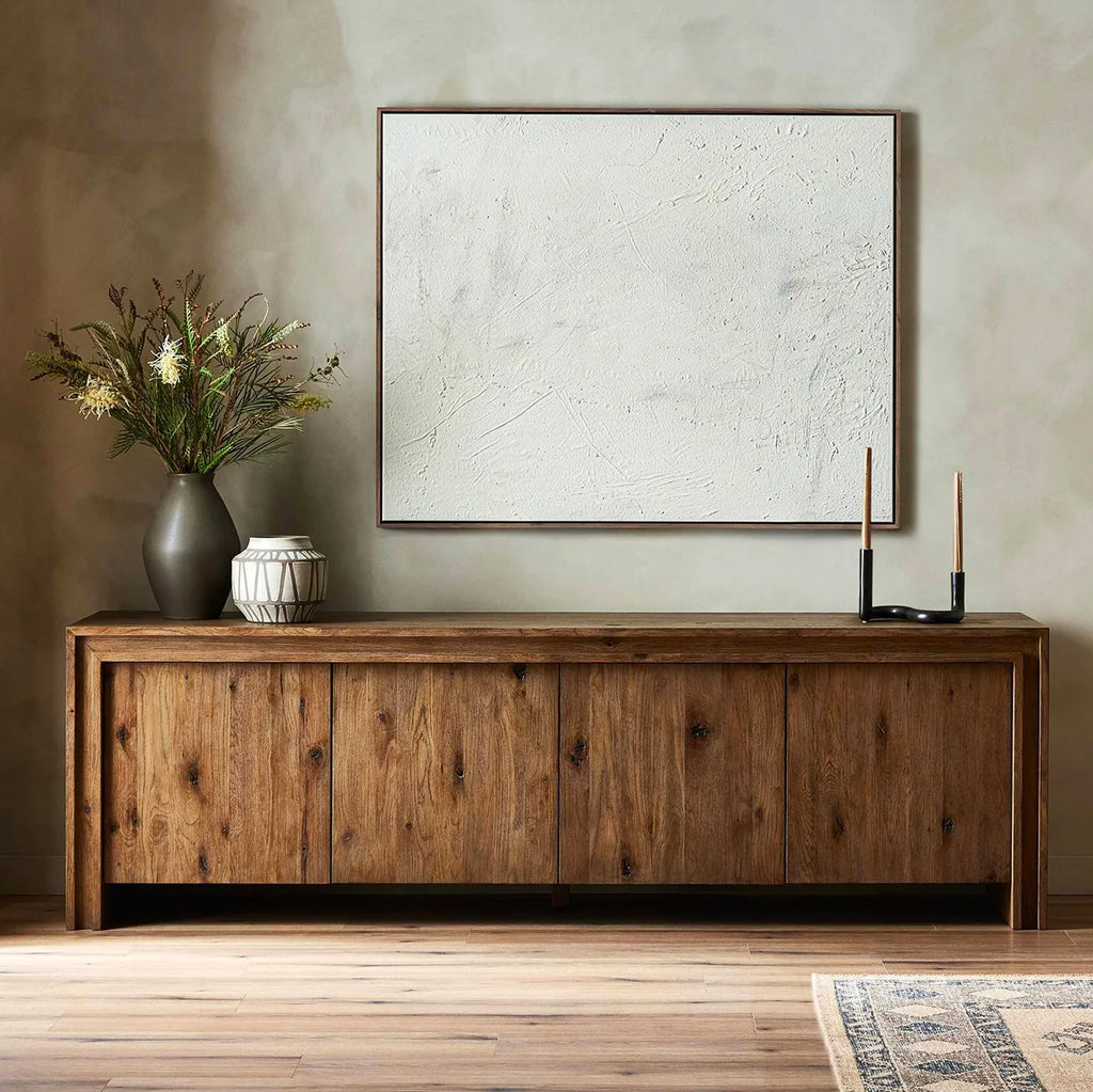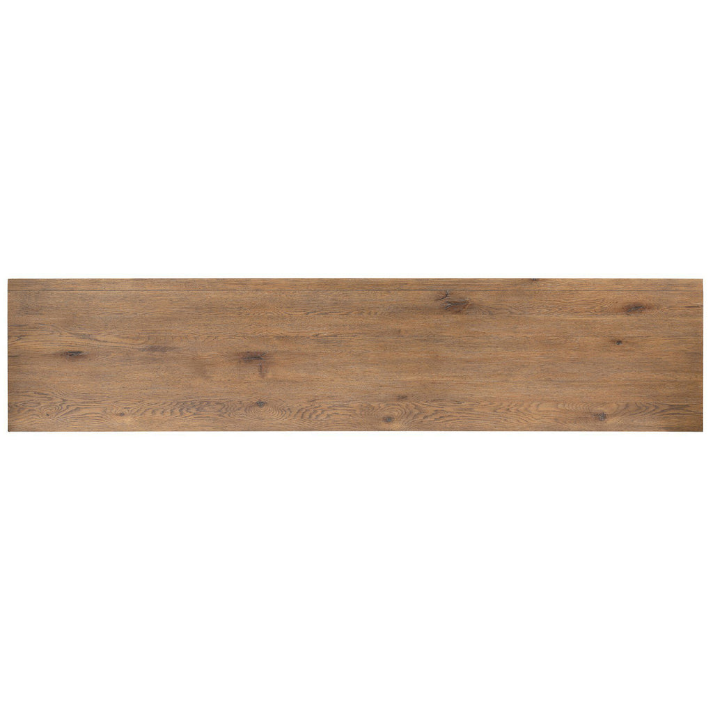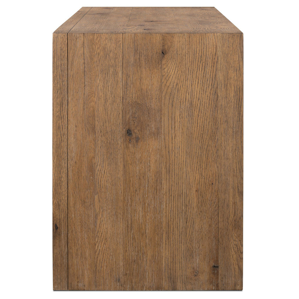 Anchored by a wide, stately frame with clever relief detail, this media console celebrates the natural beauty of oak. Push-latch doors create a clean, modern profile, placing emphasis on a warm, weathered finish.