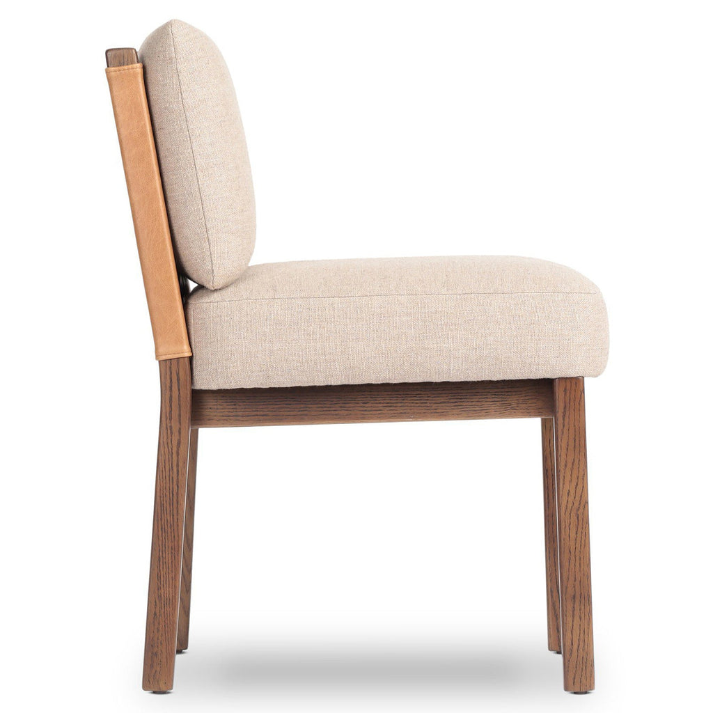 Elevate your dining space with a mixed-material dining chair of solid oak, top-grain leather and high-performance fabric. On the back, small iron detailing completes the look.