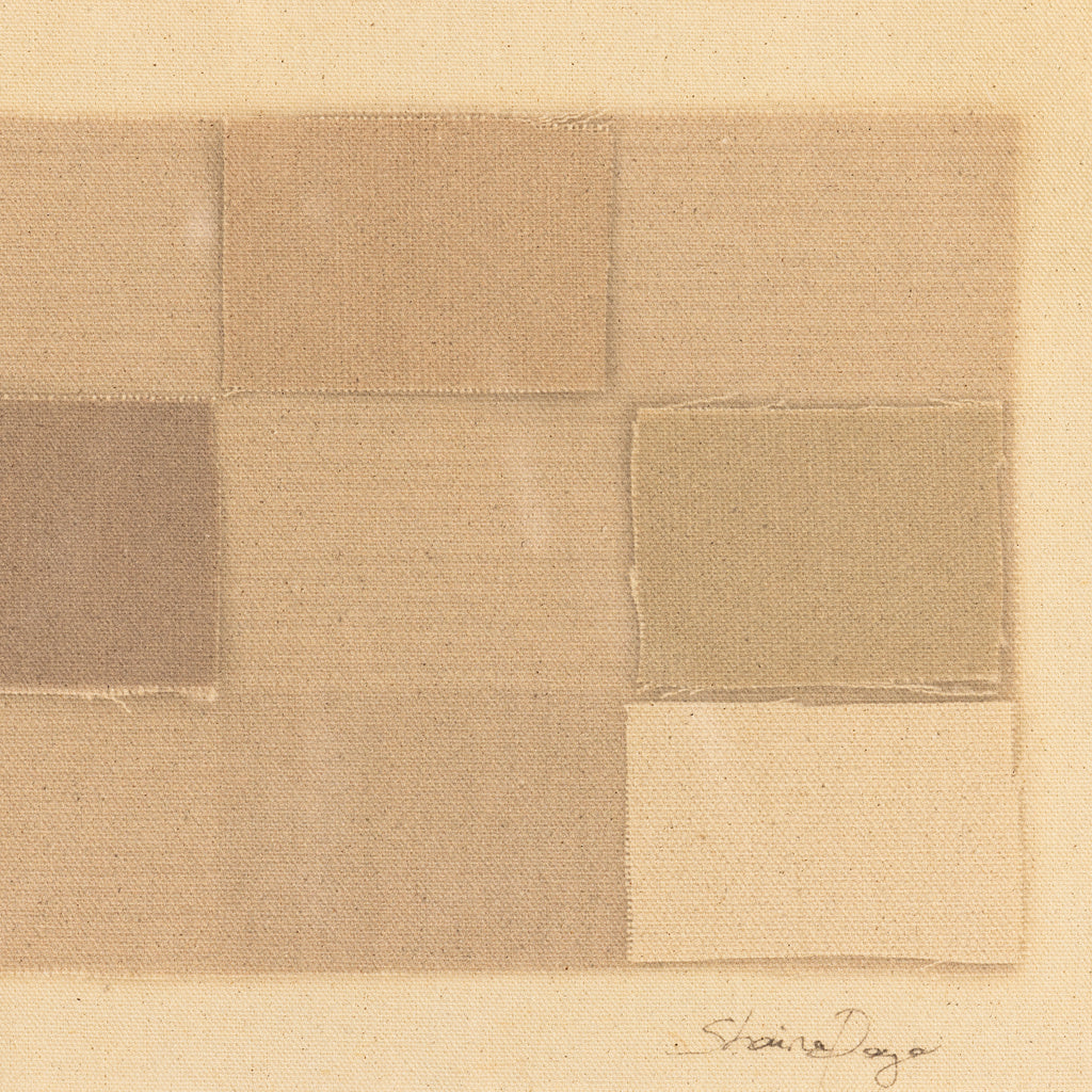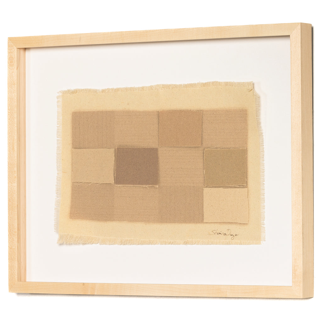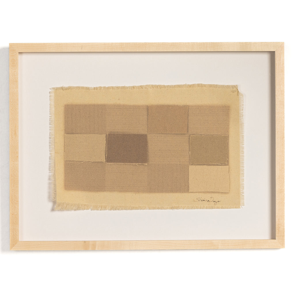 Warm, tonal hues collaged together. Artist Shaina Page crafts visual interest with fiber work that allows the eye to bounce around. Printed raw canvas with a stringed edge, loose mounted on a linen backer. If not currently in stock, this piece ships within three weeks. Handmade in Austin, Texas.