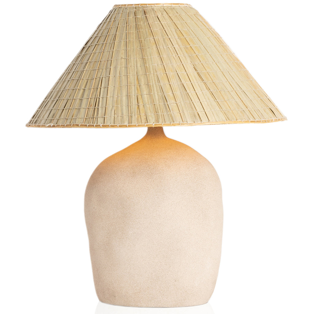 Finished in a neutral sand, a shapely talavera table lamp is topped with a natural palm shade, for a light, textural look.