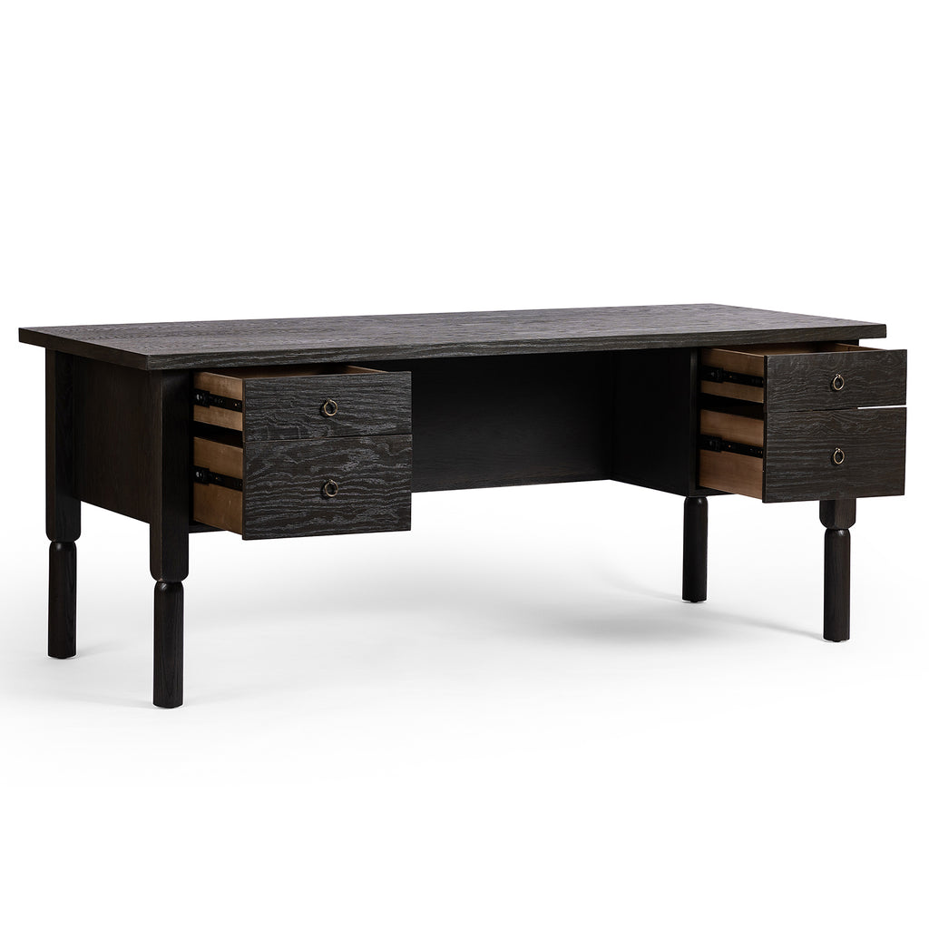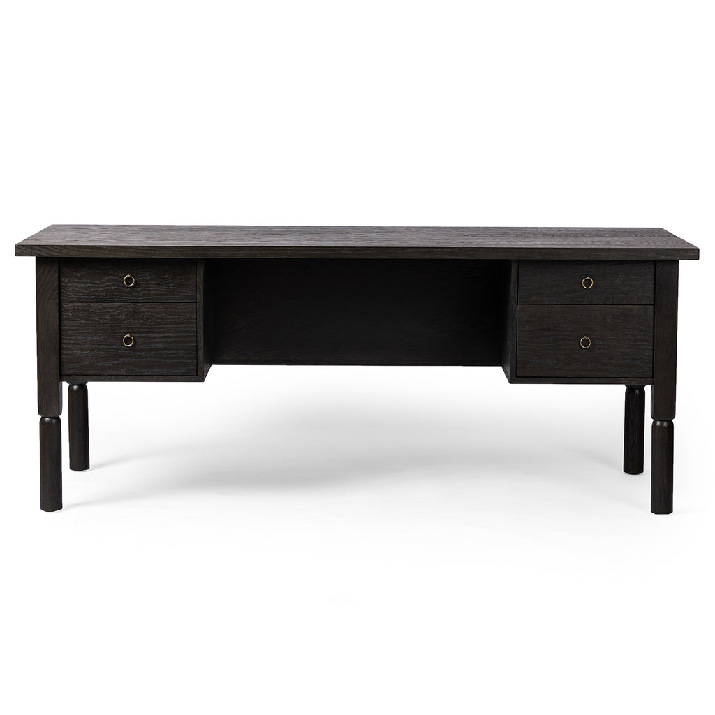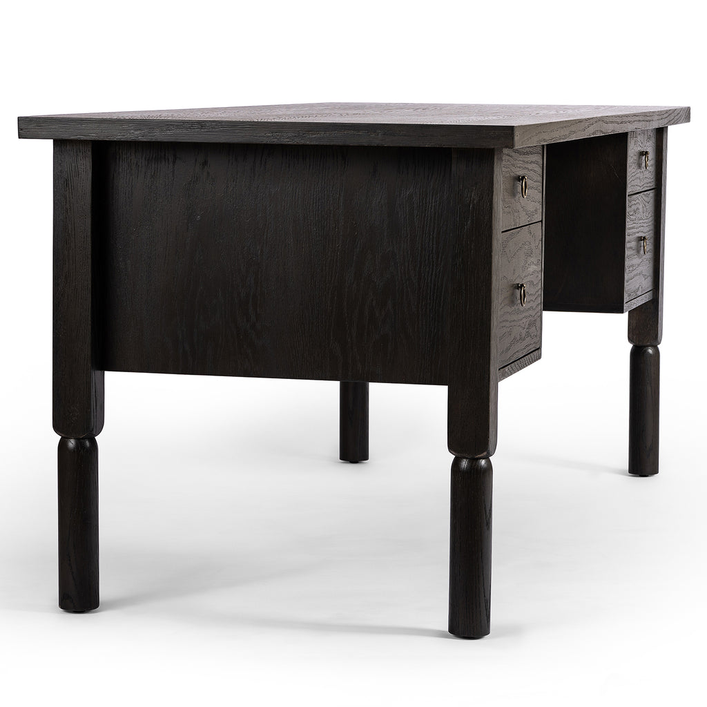 Made from oak veneer with a deep charcoal finish, this executive-size desk delivers ultimate storage, including four drawers on one side plus six open cubbies on the other, granting the option to float-style in a room. Partially turned legs add a design-forward finishing touch.