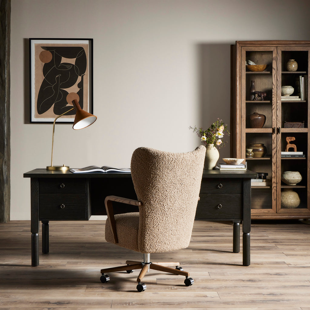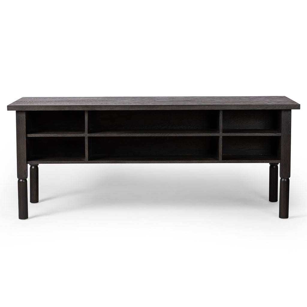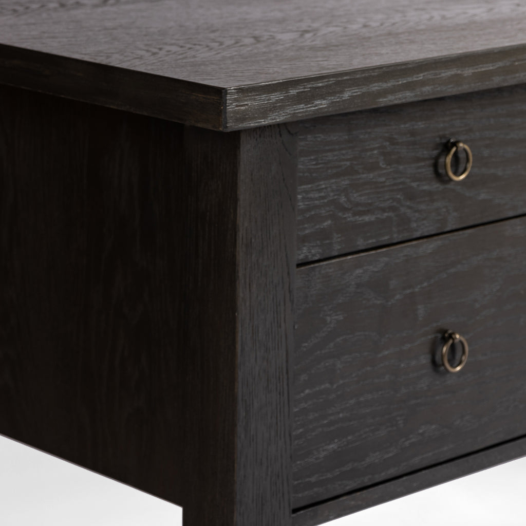 Made from oak veneer with a deep charcoal finish, this executive-size desk delivers ultimate storage, including four drawers on one side plus six open cubbies on the other, granting the option to float-style in a room. Partially turned legs add a design-forward finishing touch.