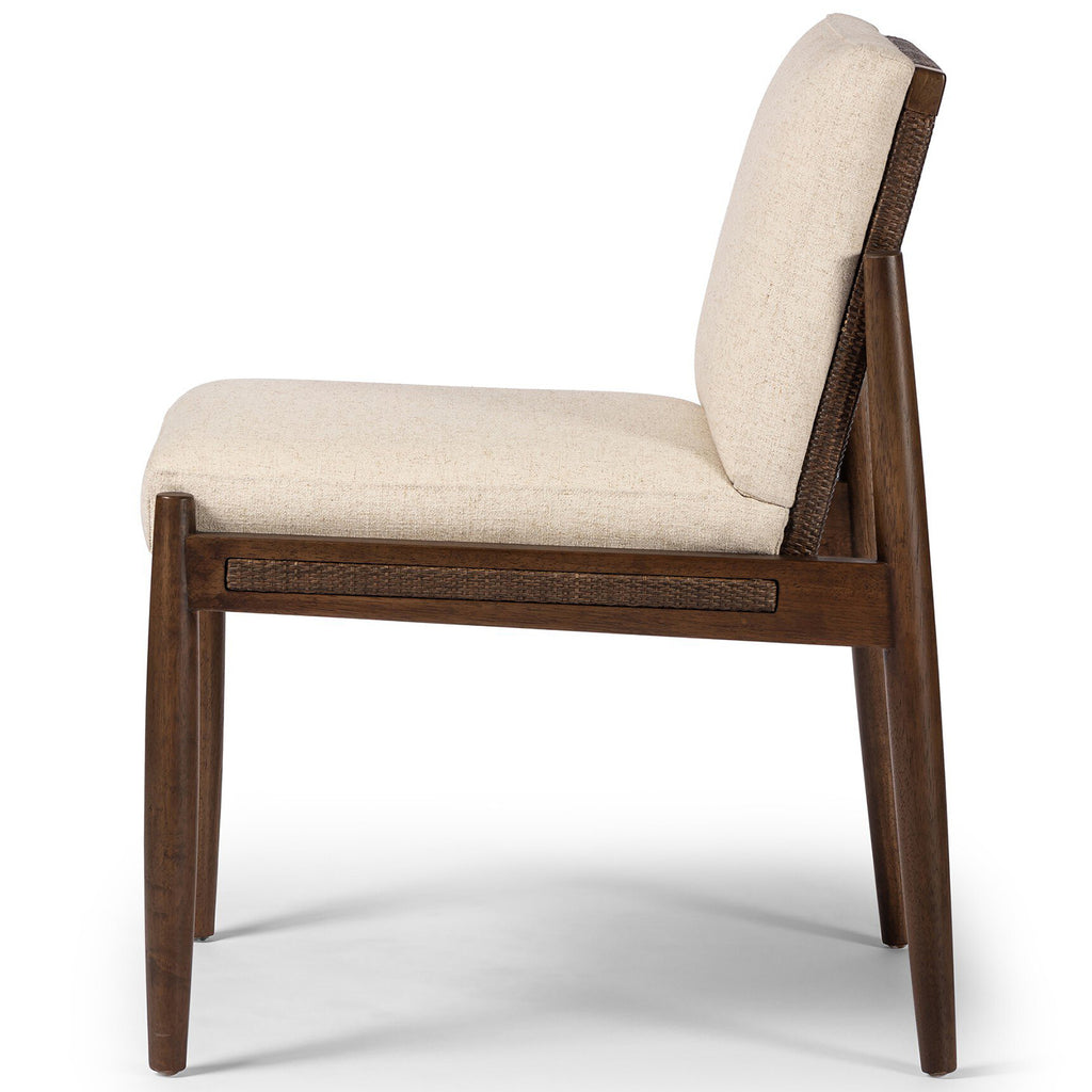 The traditional rattan chair gets an elevated look in this heritage-inspired dining seat. Clean lines create a sleek wood frame that provides a simple backdrop to mixed materials. Designed with rattan accents on the side, while natural performance linen provides practical seating for everyday use. Performance fabrics are specially created to withstand spills, stains, high traffic and wear, ensuring long-term comfort and unmatched durability.