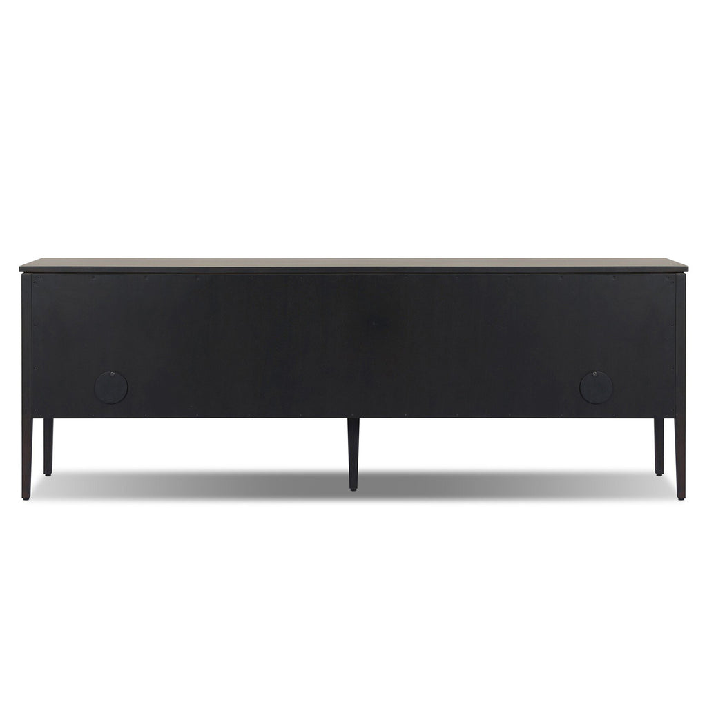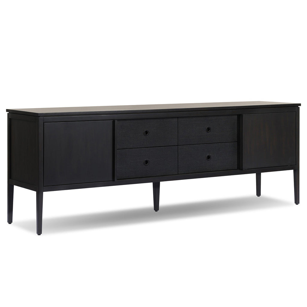 Black raffia brings texture to a traditional media console of black-finished mahogany. Two sliding doors and four drawers create generous storage options, while rear cutouts keep cords out of sight.