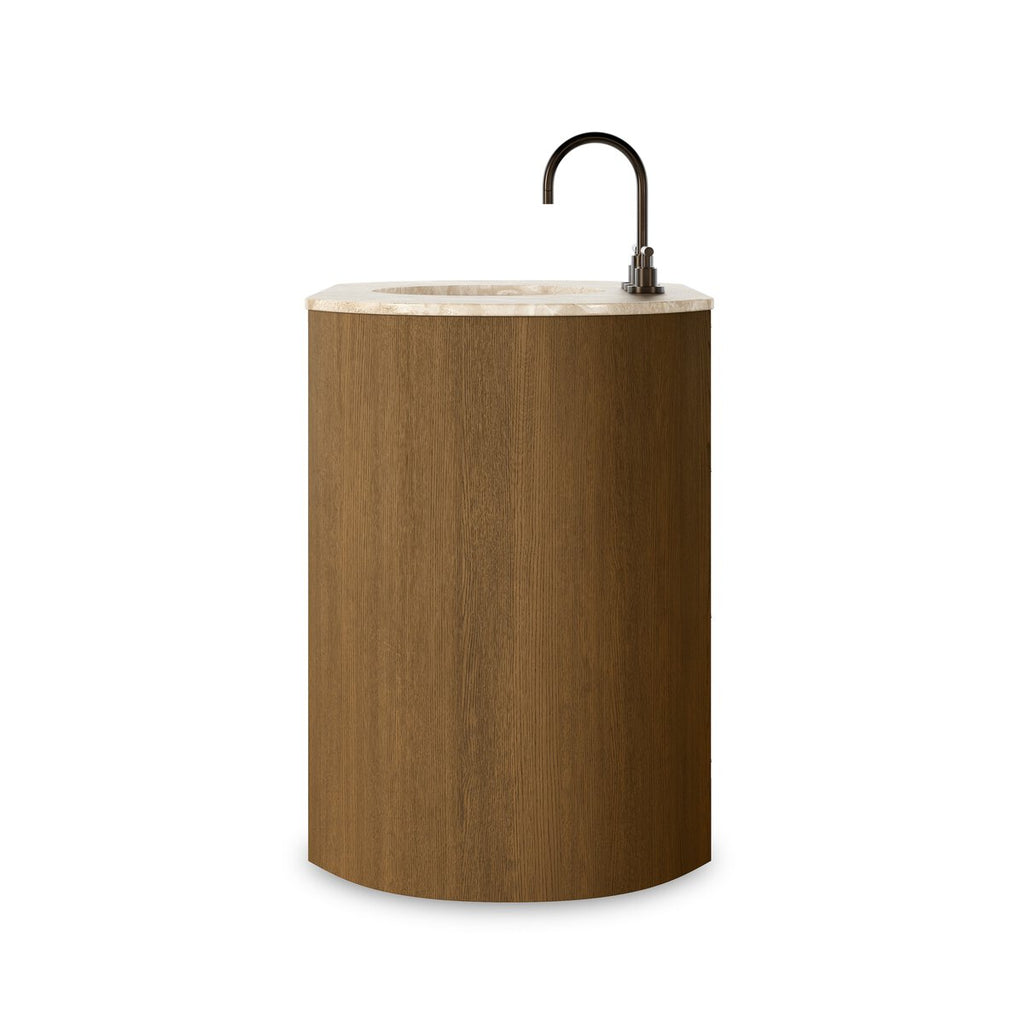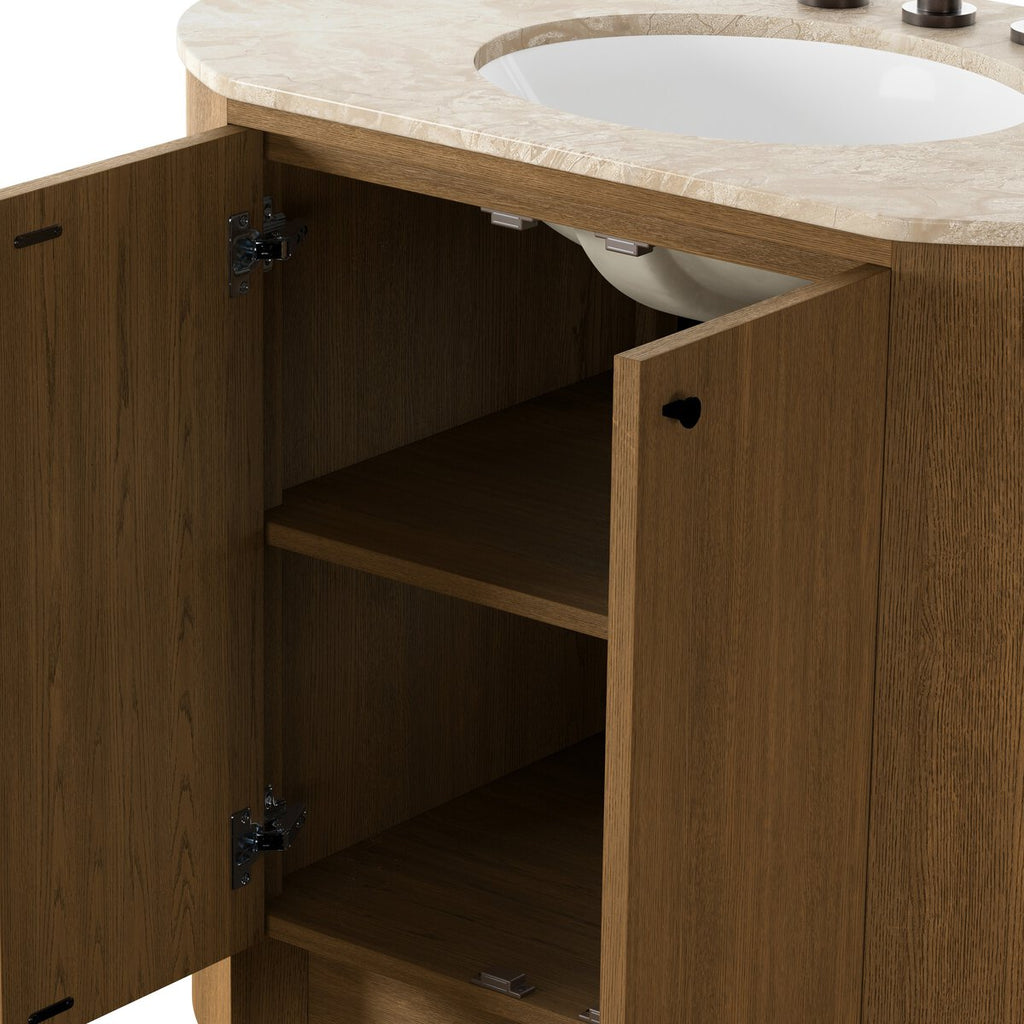 Sleek and softly curved, this pill-shaped bath vanity pairs a monochromatic base with a natural marble top. Complemented by rounded hardware and a set back base board, with adjustable and removable shelves inside for ample storage. Finished with a bath-safe sealant for moisture resistance. Designed to accommodate 8in-widespread faucets and standard-size hardware for easy customization. Removable back with cutouts for plumbing; fits standard P-trap. Professional installation required. Faucet shown not included. Sink and backsplash included; backsplash ships separately.