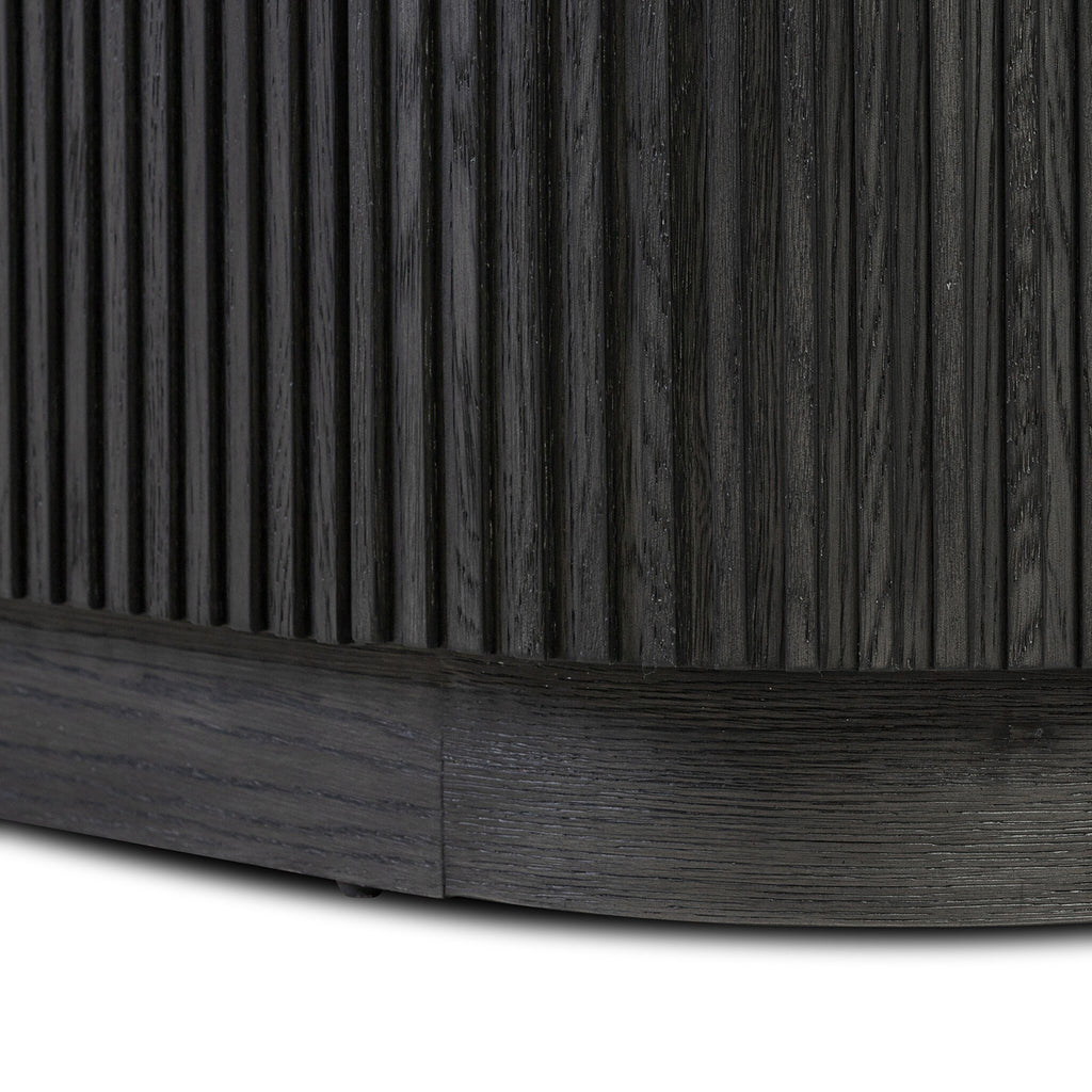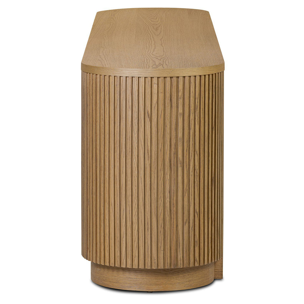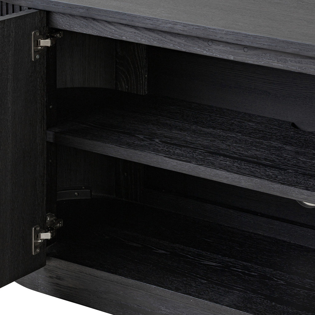 Crafted from desert oak solids and veneers with a plinth-style base, rounded sides and linear reeding, this sideboard exudes midcentury vibes. Fully finished interior and shelves for quality detailing inside and out.