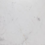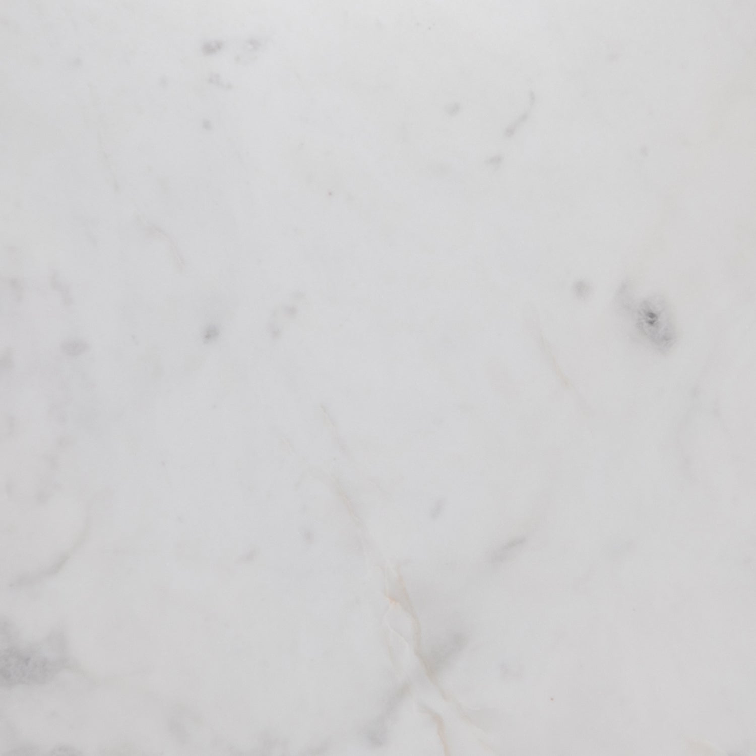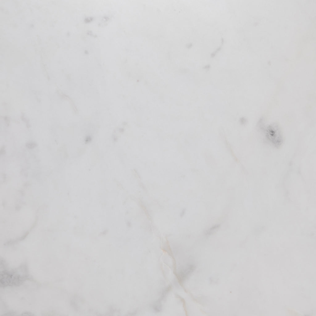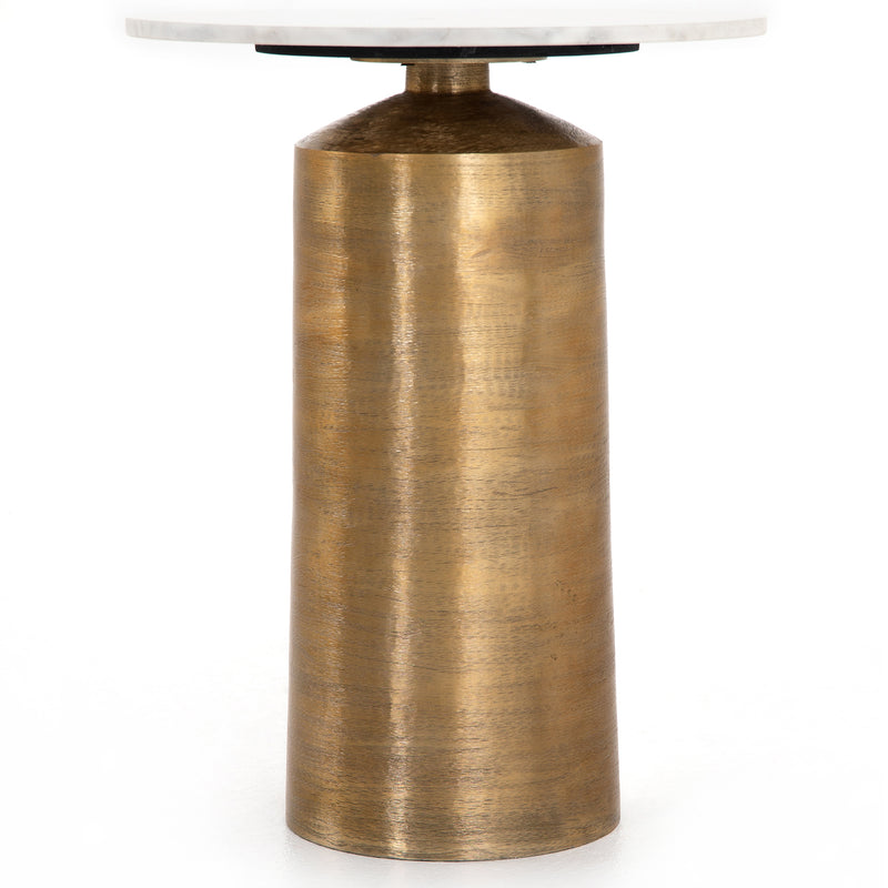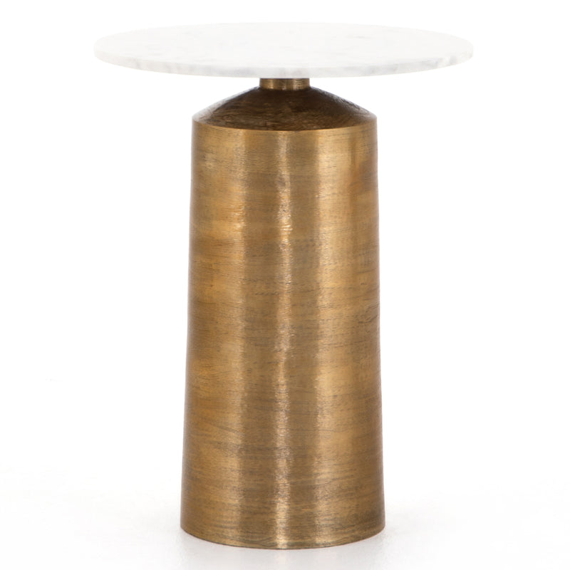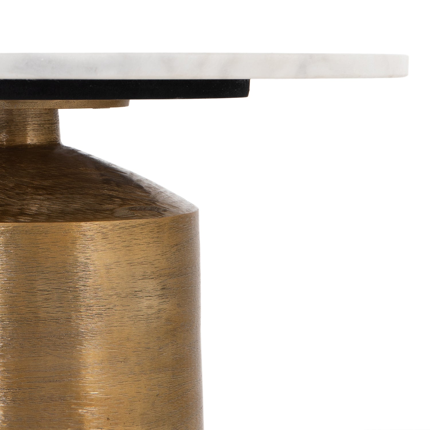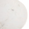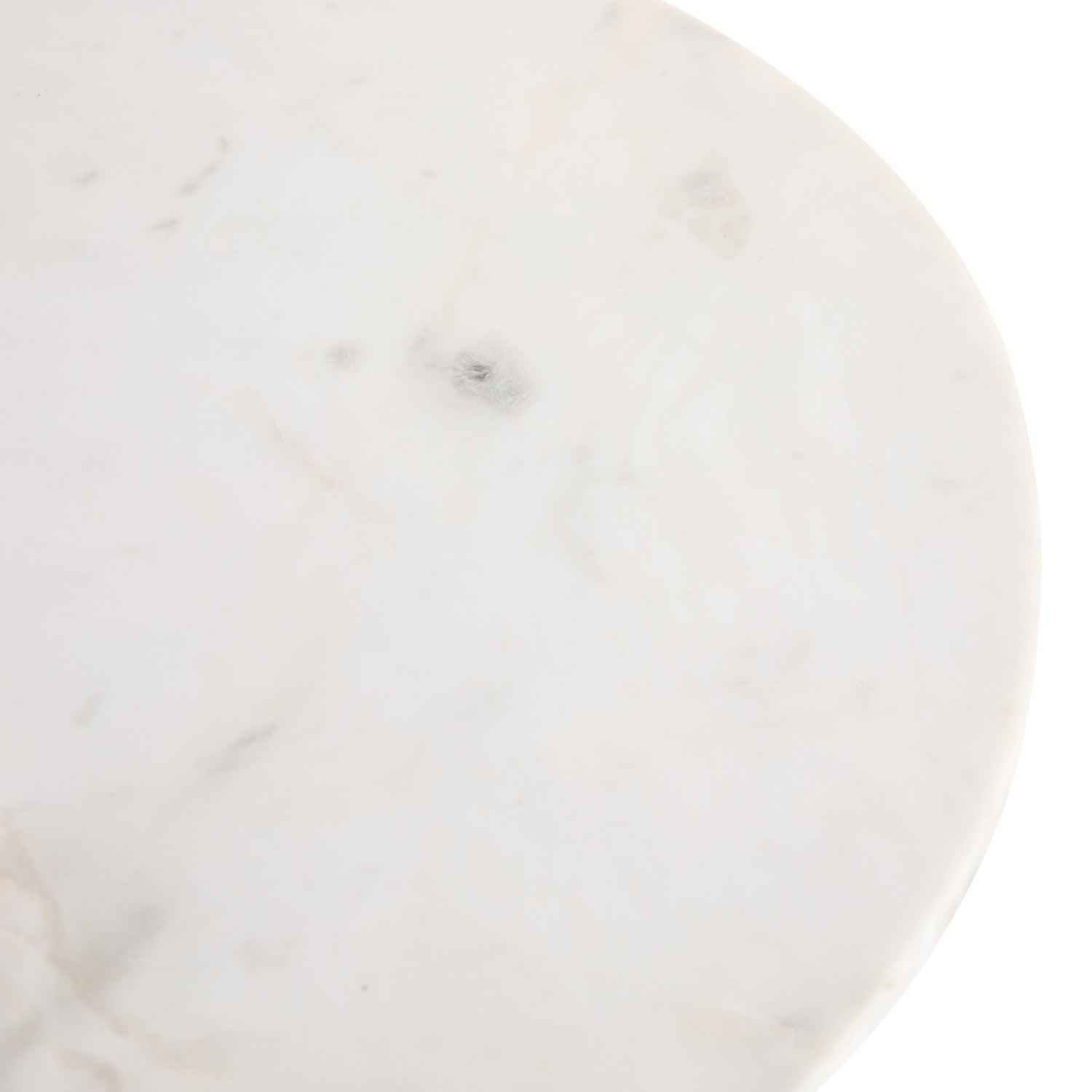 Sculptural intrigue. A dramatically scaled pedestal table features a shapely aluminum base and rounded tabletop of polished white marble.