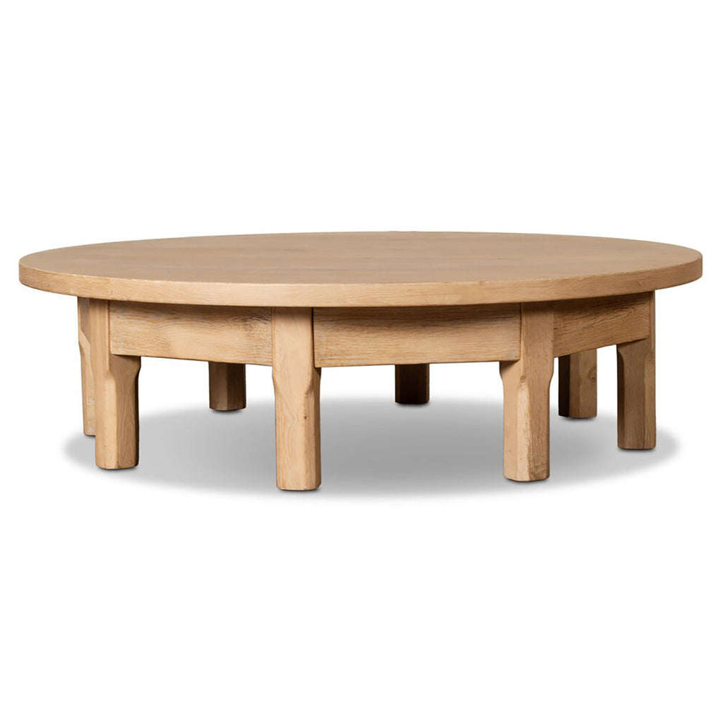 Made from bleached oak, a unique eight-leg base supports a rounded tabletop. Inspired by a "found object" aesthetic, this piece works a nomadic vibe into any room.