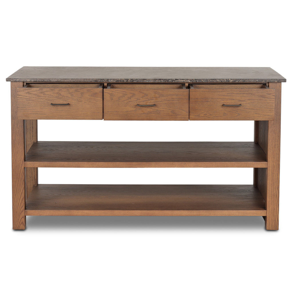 A kitchen island and waterfall dining table in one. Crafted from oak, the island system features two large shelves and three drawers on each side, all topped with by warm gray marble. The pullout table extends and fits inside the frame with ease.