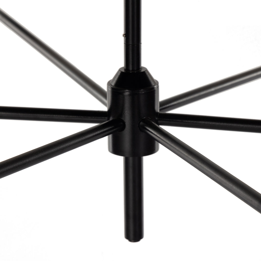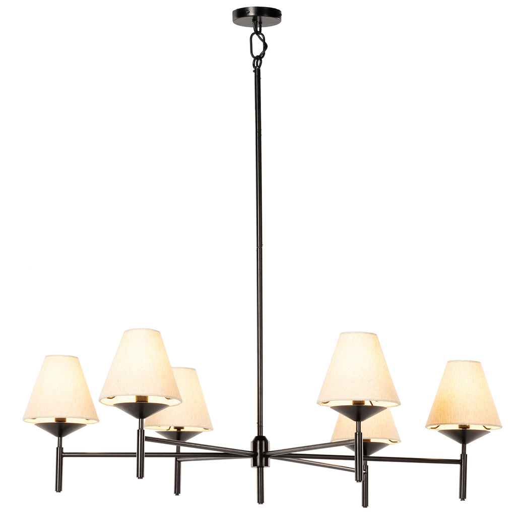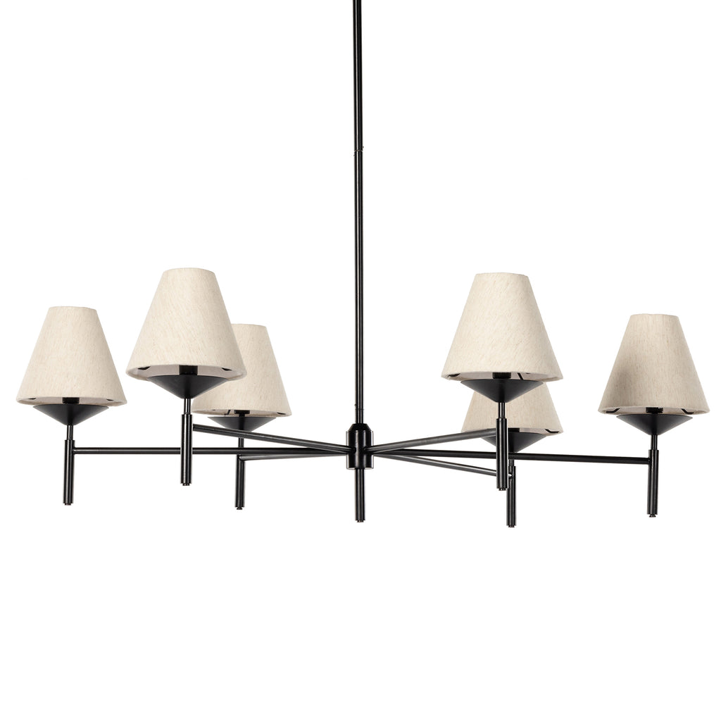 This modern-meets-traditional chandelier features a smooth jet black iron frame that contrasts perfectly with tapered, 100% cotton linen shades. Includes additional piping for adjustability from 49.75" to maximum hanging length of 85.75".