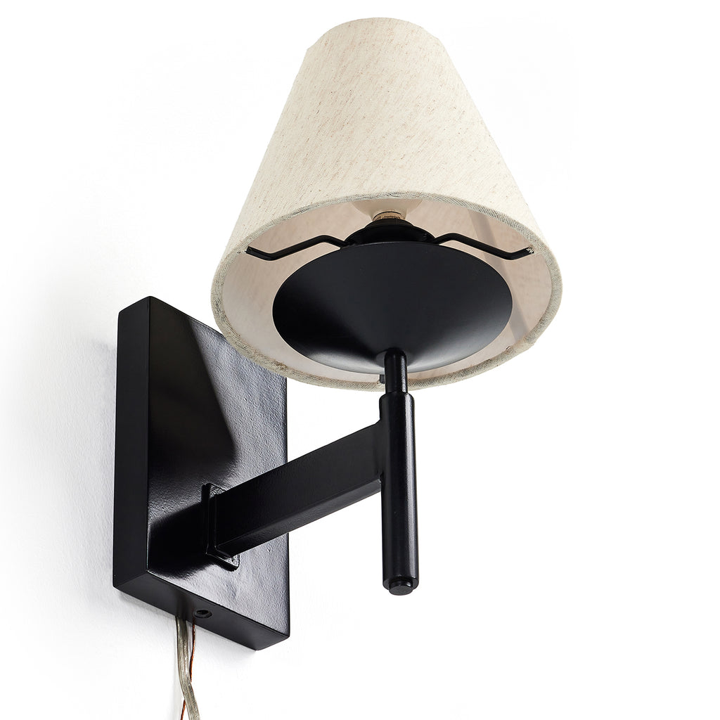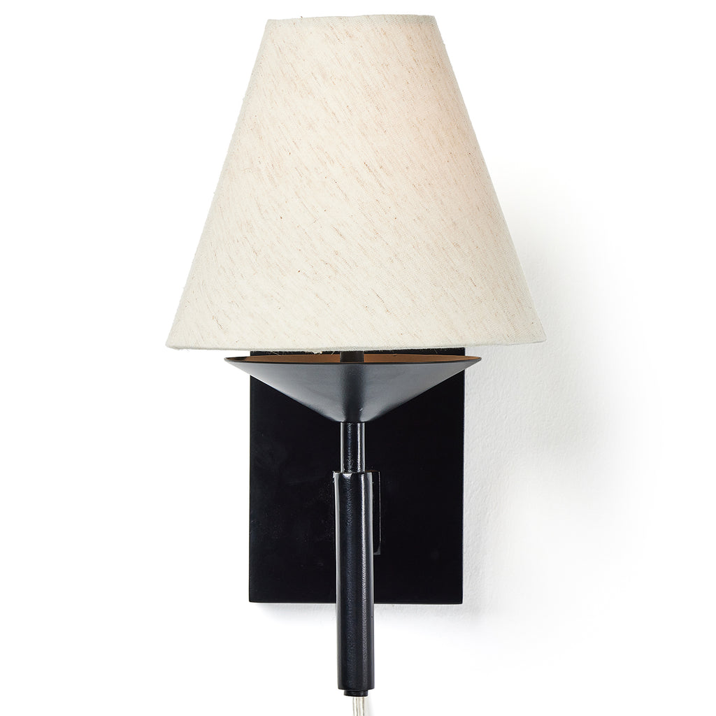 This modern-meets-traditional sconce features a smooth jet black iron frame that contrasts perfectly with tapered, 100% cotton linen shade.