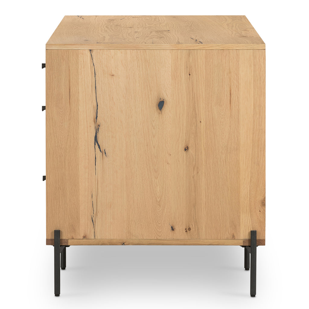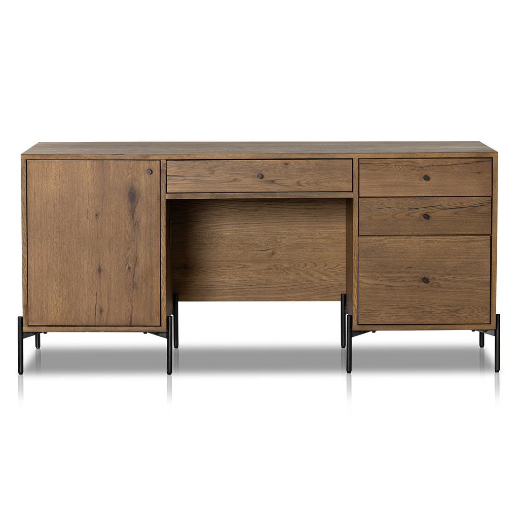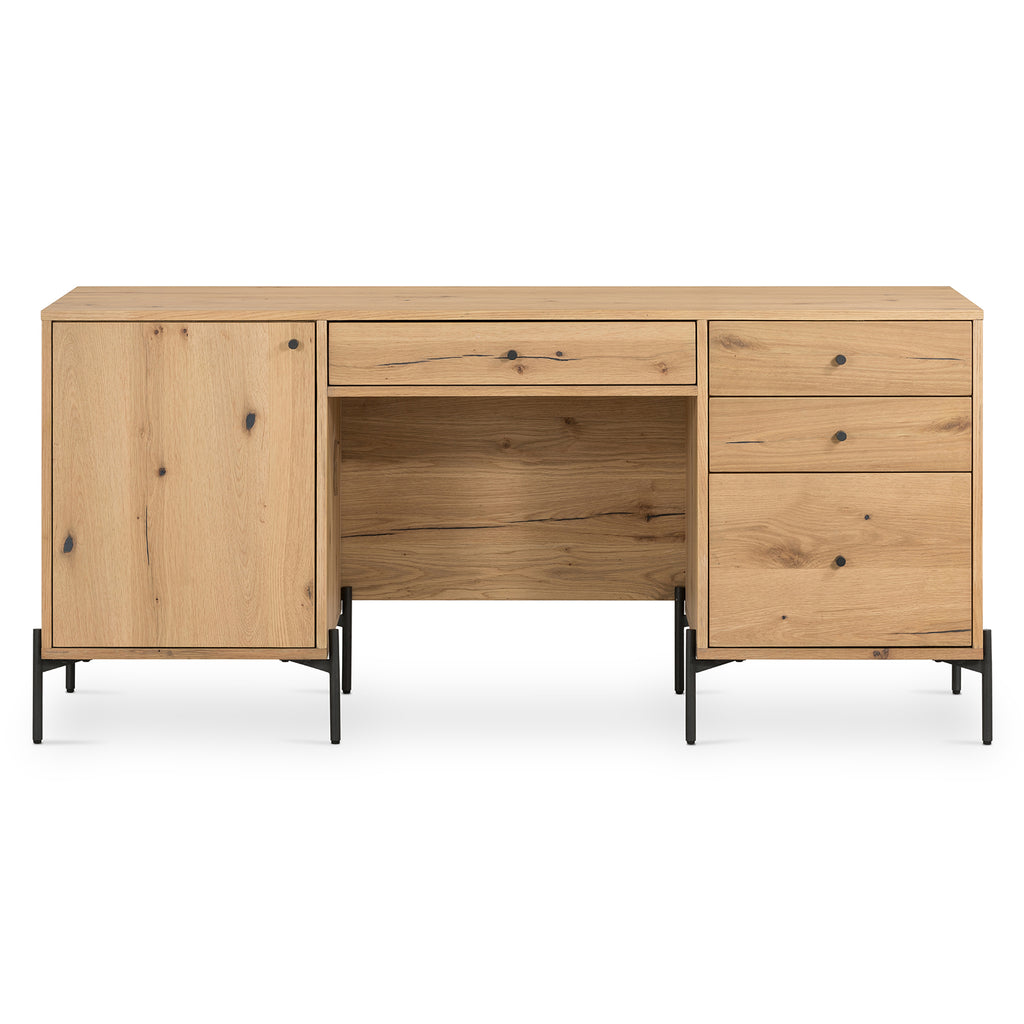Streamlined and stylish. Light-finished oak and contrasting resin form a fashionable executive desk with roomy cabinetry plus four total drawers for ample storage space. A modesty panel and fully finished back grant the option to style anywhere in the room.