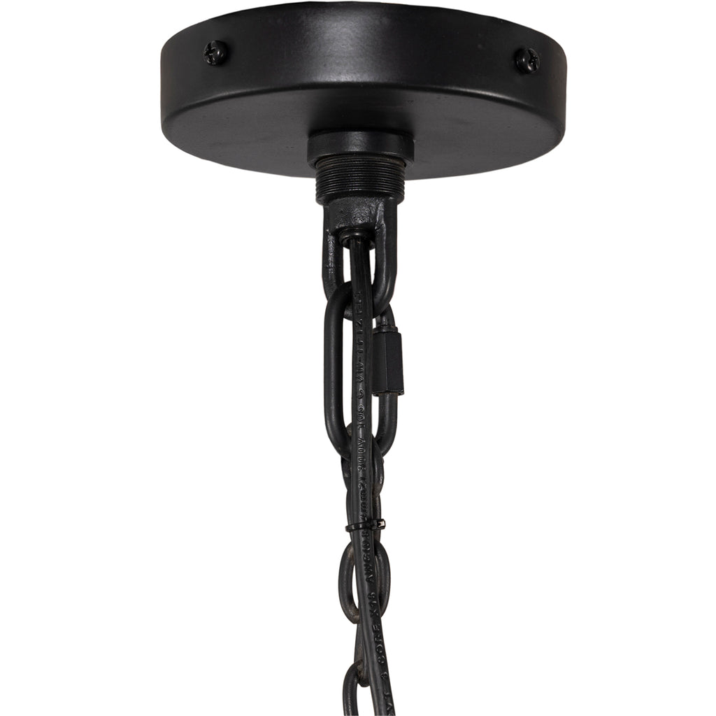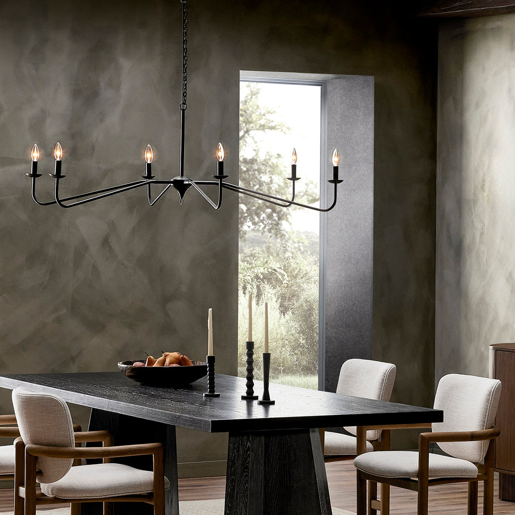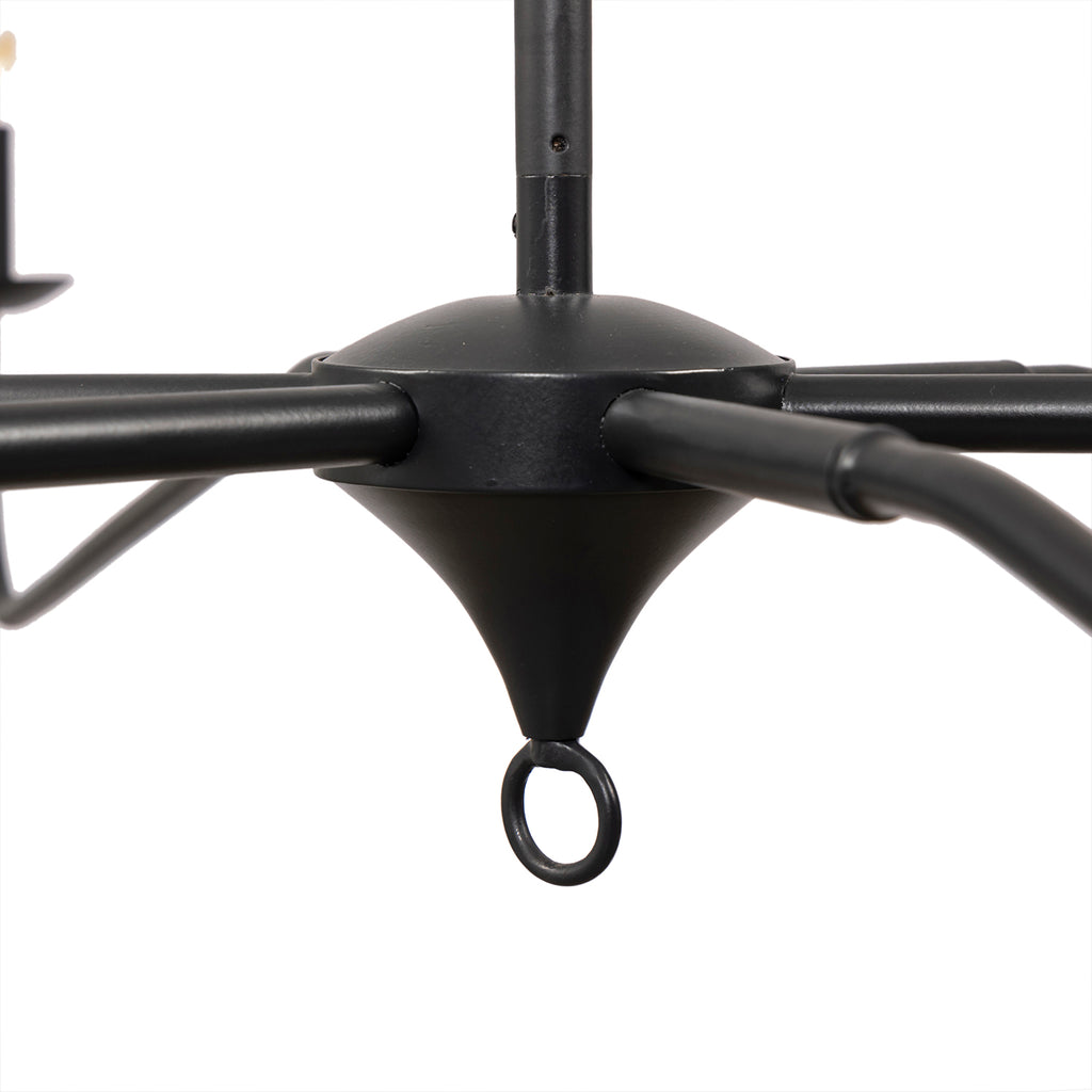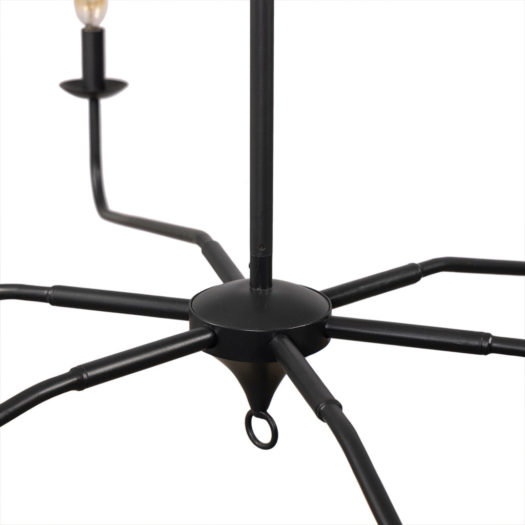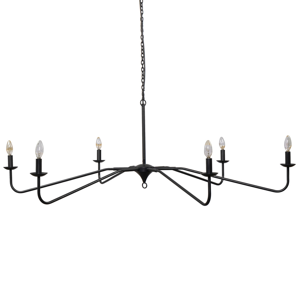 A grand statement piece, this French industrial-inspired, candelabra-style chandelier features slim lines of antique iron and tapered bobeches all around.