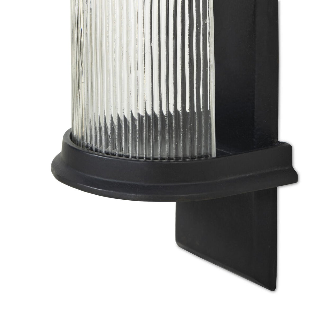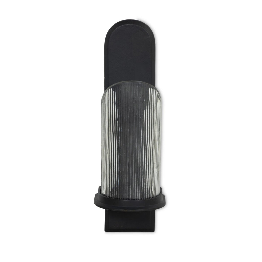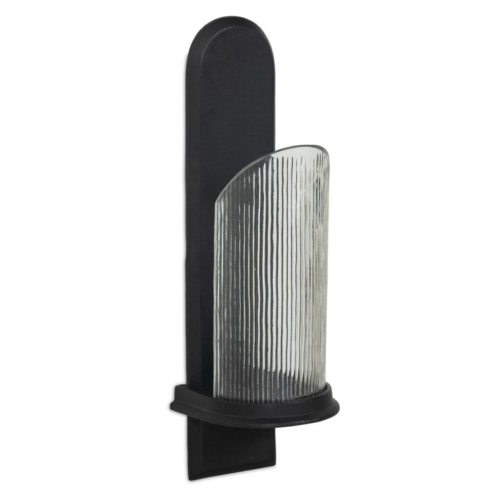 Arches of cast aluminum intersect to support a column of curved, reeded glass designed to diffuse and refract the light. A large-scale statement, this pair of wall-mounted candle holders brings a subtly dark and moody feel to any space.