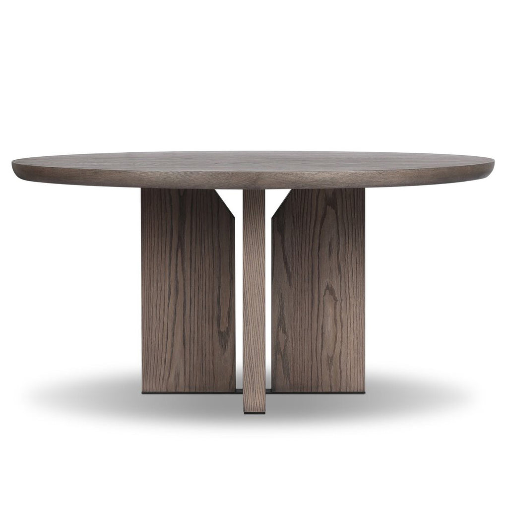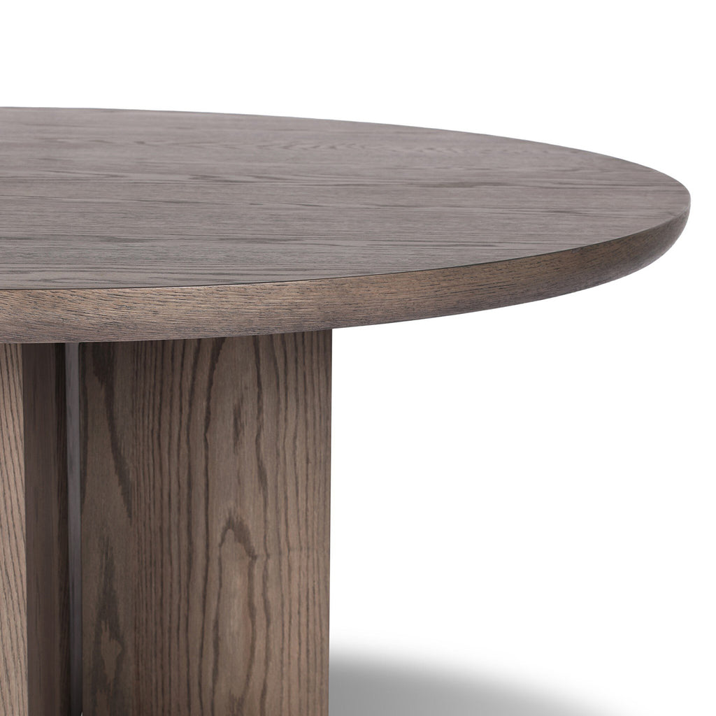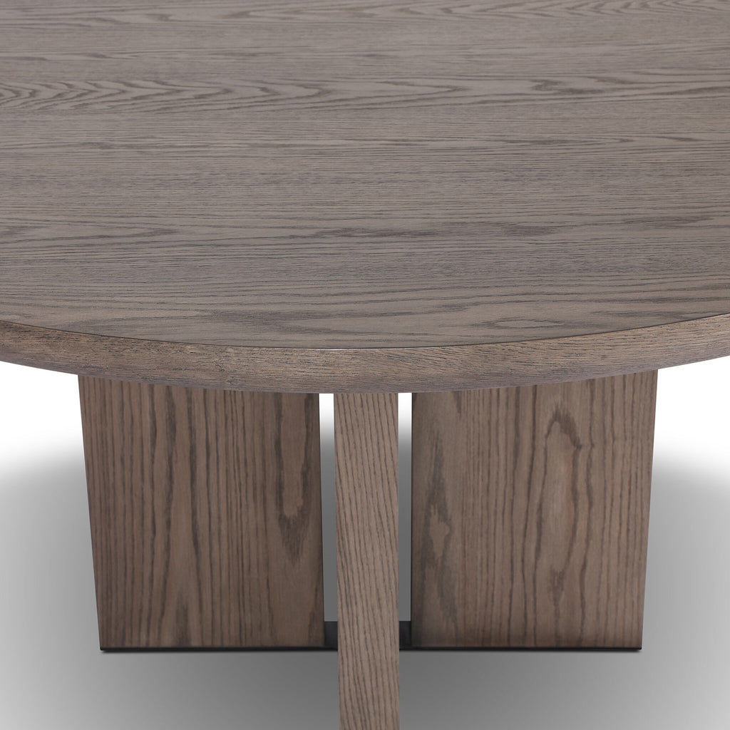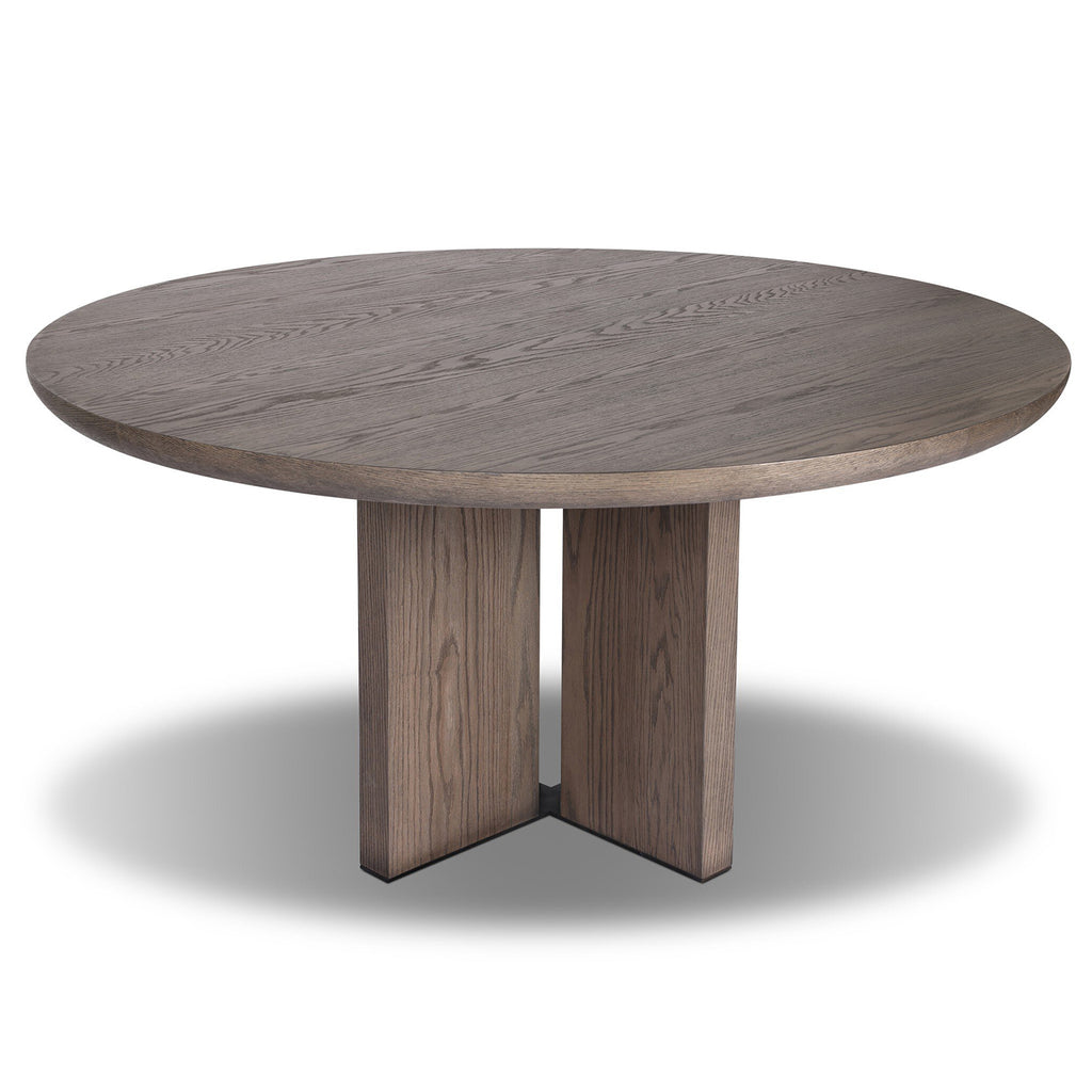 Inspired by minimalist Nordic design, a grey-finished oak dining table has a base of four plinth legs for a simple but impactful detail.