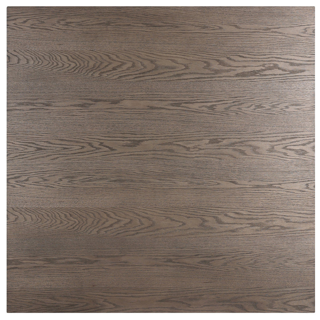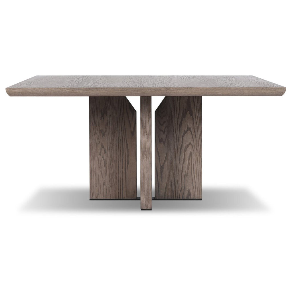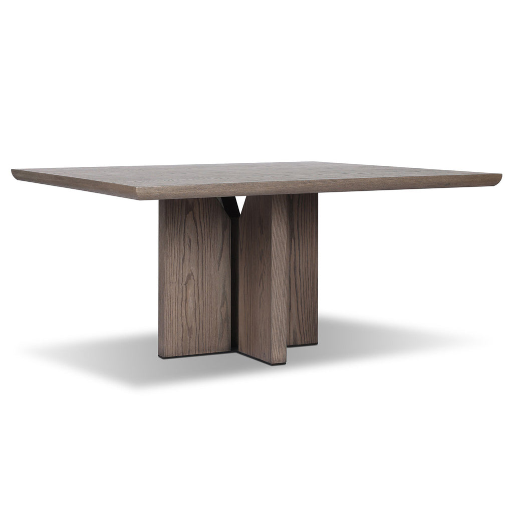 Inspired by minimalist Nordic design, an oak dining table has a base of four plinth legs for a simple but impactful detail. Finished in gray-brown oak.