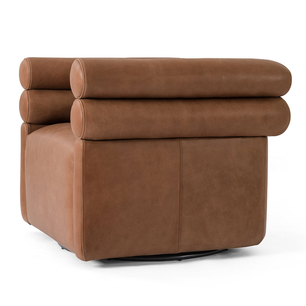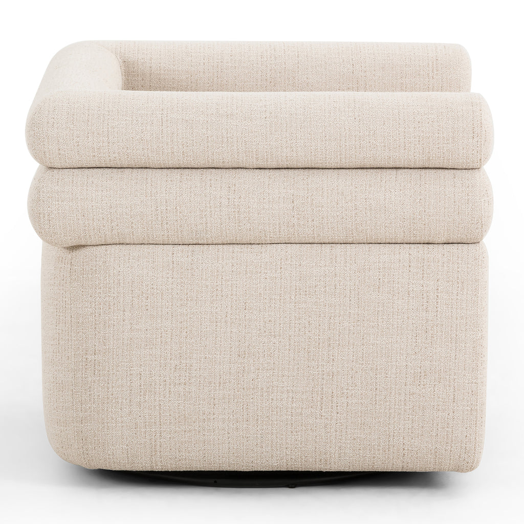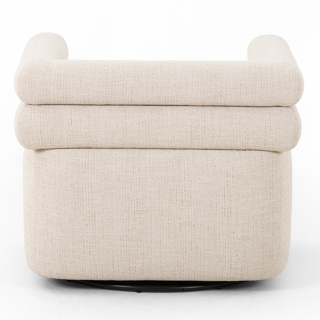 Atop a 360-degree swivel, cleanly shaped seating is upholstered in cream-colored high-performance fabric or ltop grain leather, for a sensible spin on modern styling.