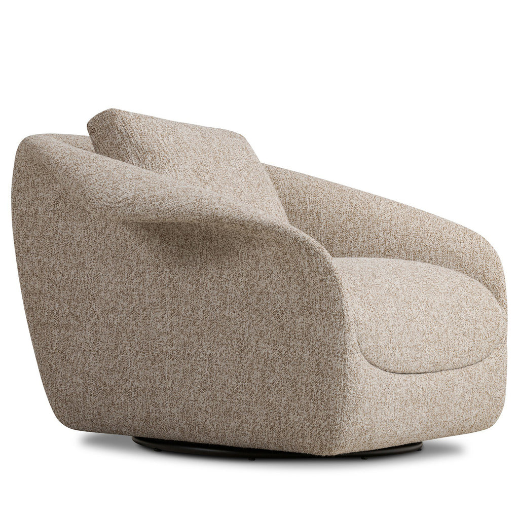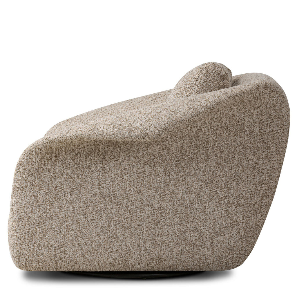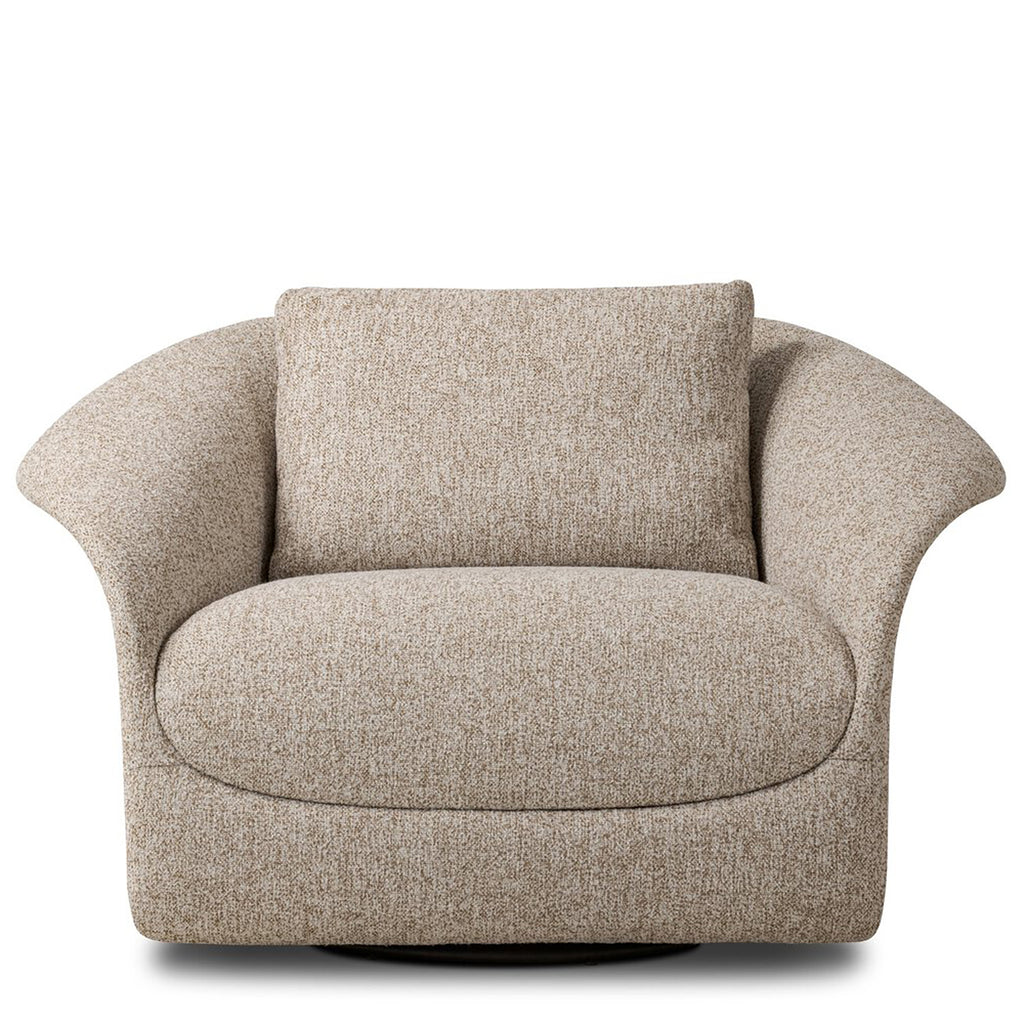 Curved lines and a swivel function make this accent chair equal parts style and substance. Winged arms add sculptural drama, while plush seating and back cushions deliver understated comfort. Upholstered in a slightly heathered fabric with subtle highs and lows throughout.