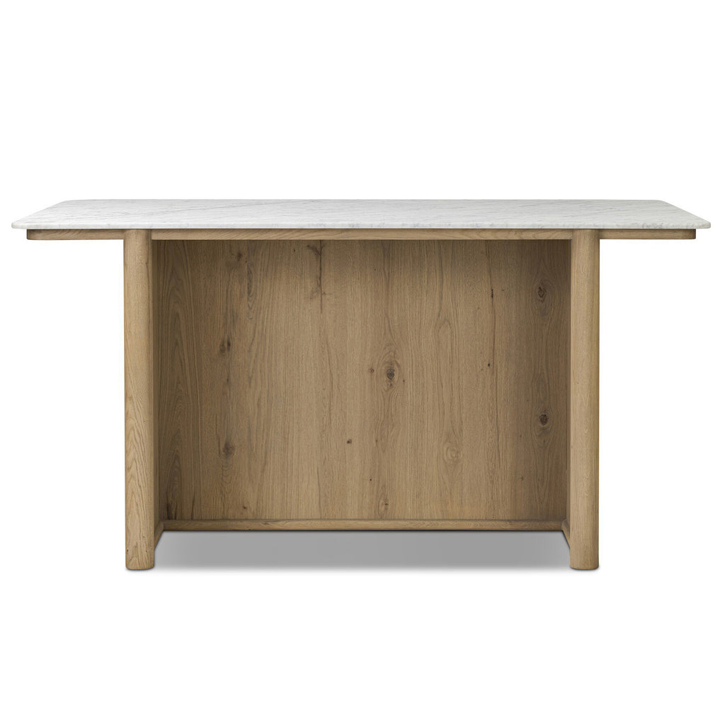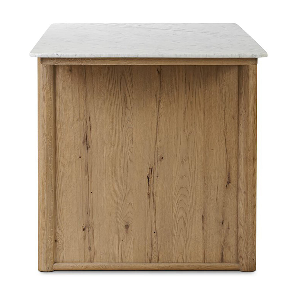Bring bonus storage space to your kitchen with a mixed-material island of Carrara marble and aged natural oak. With closed construction to mimic a built-in piece, lower cabinetry with shelving plus dual drawers up top create endless options for storage of your servingware or appliances. Plus, it's a natural centerpoint for conversation while cooking or entertaining.
