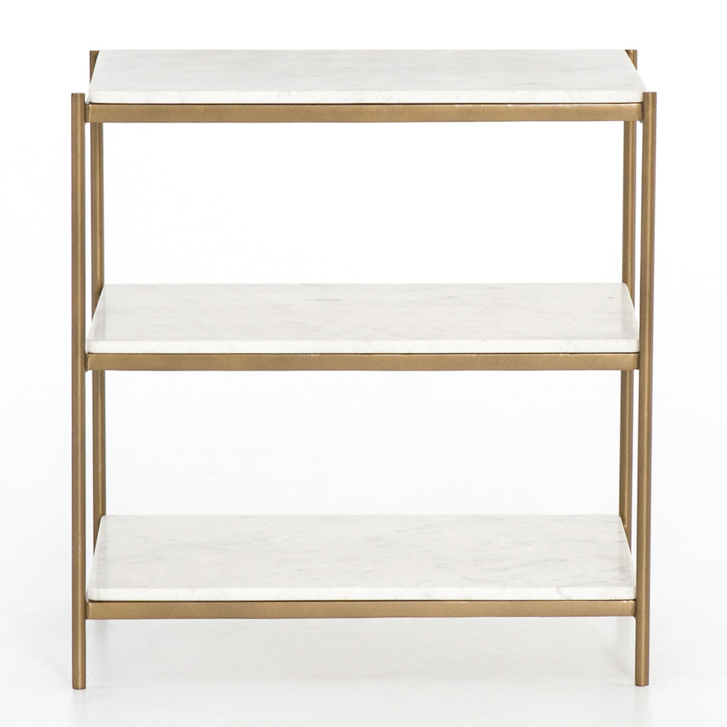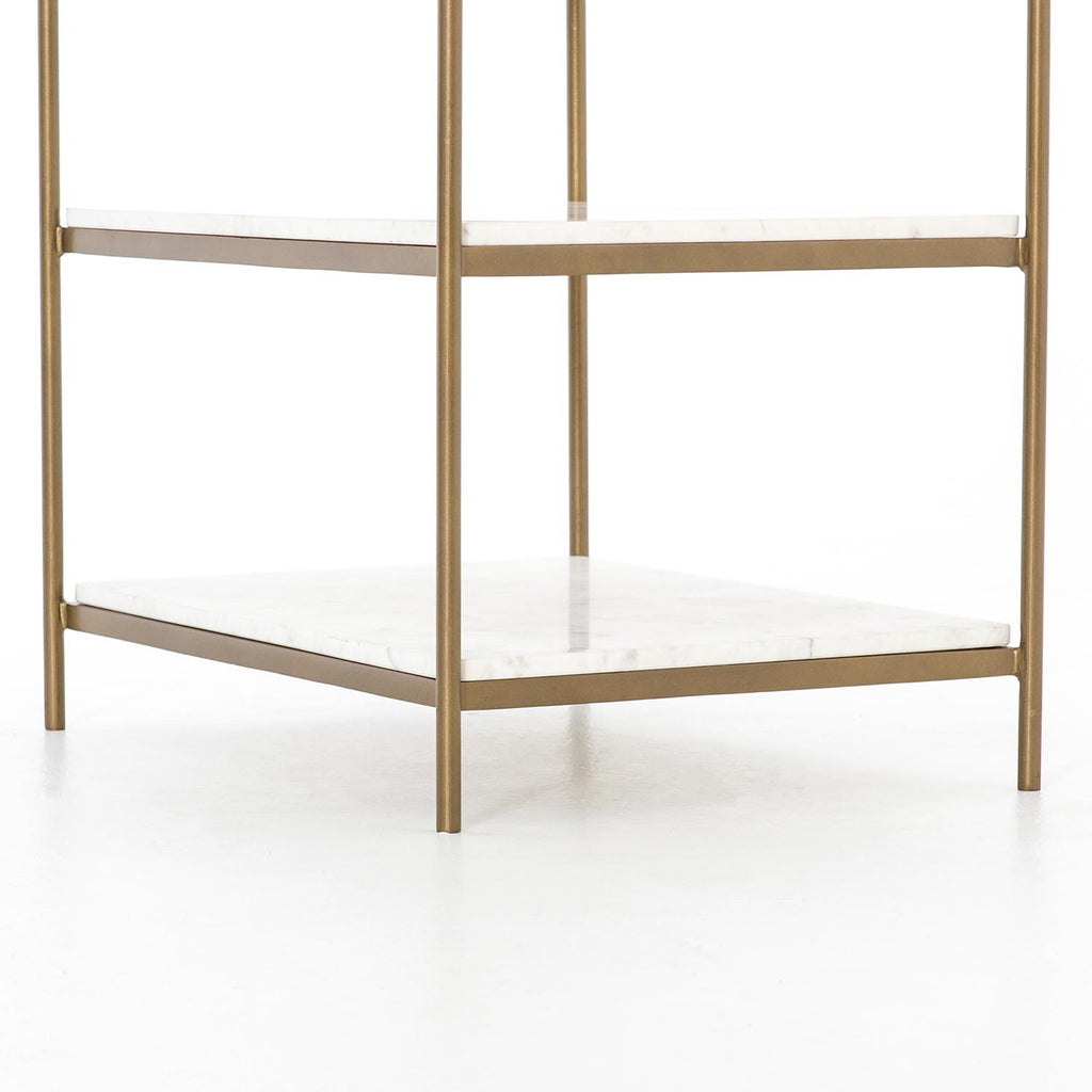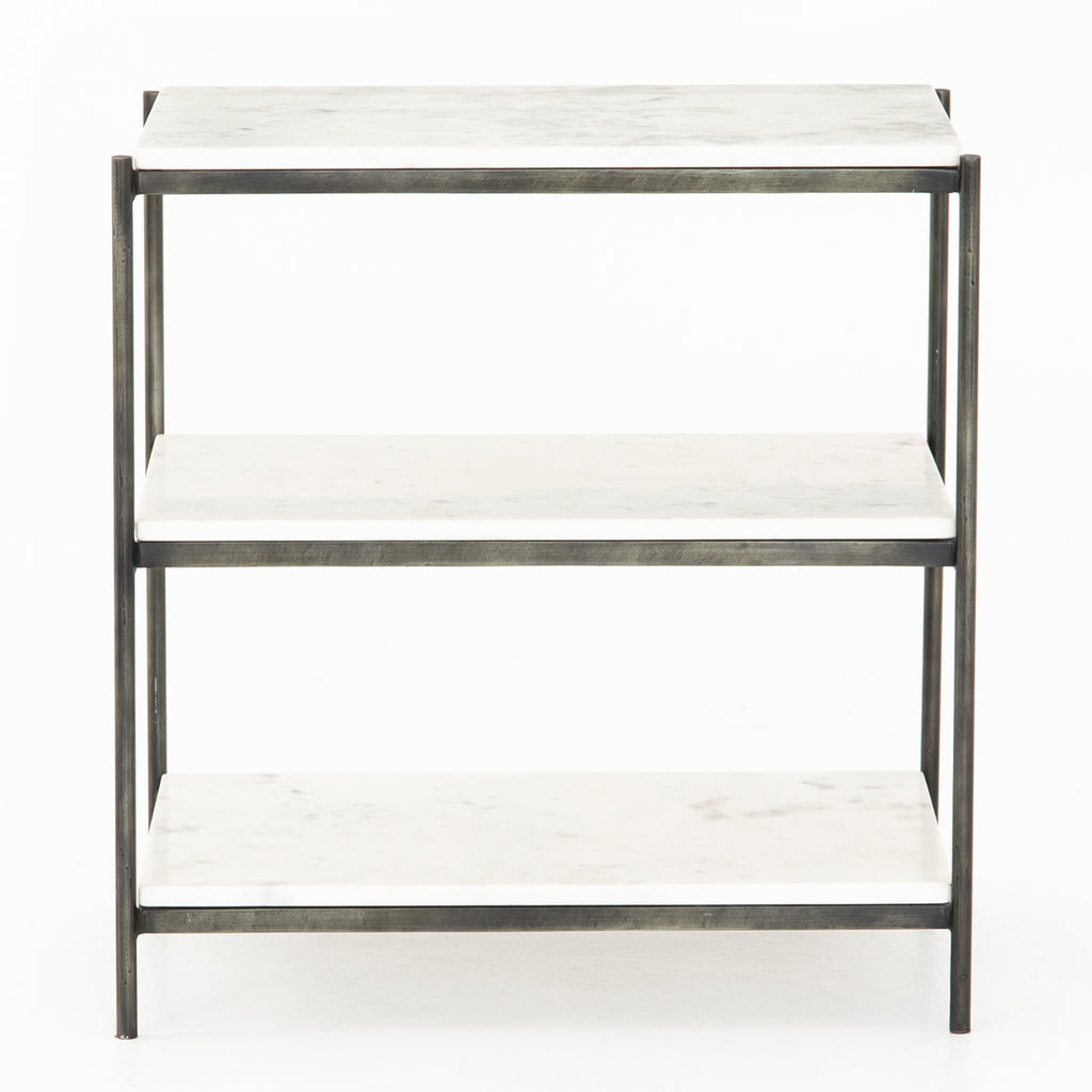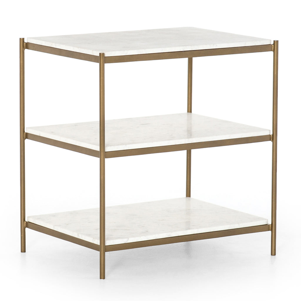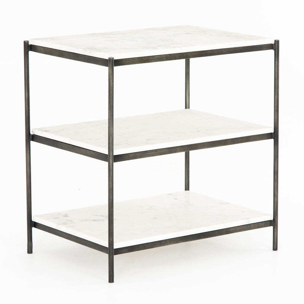 Resolutely modern, Four Hands furniture collection mixes materials and influences for a fresh, inspired look. Add a pop of sophistication to any space. Classic white marble lays three tiers of smooth shelving for plenty of space, while antique brass-or hammered gray finished iron framing places a feminine spin on bedside storage.