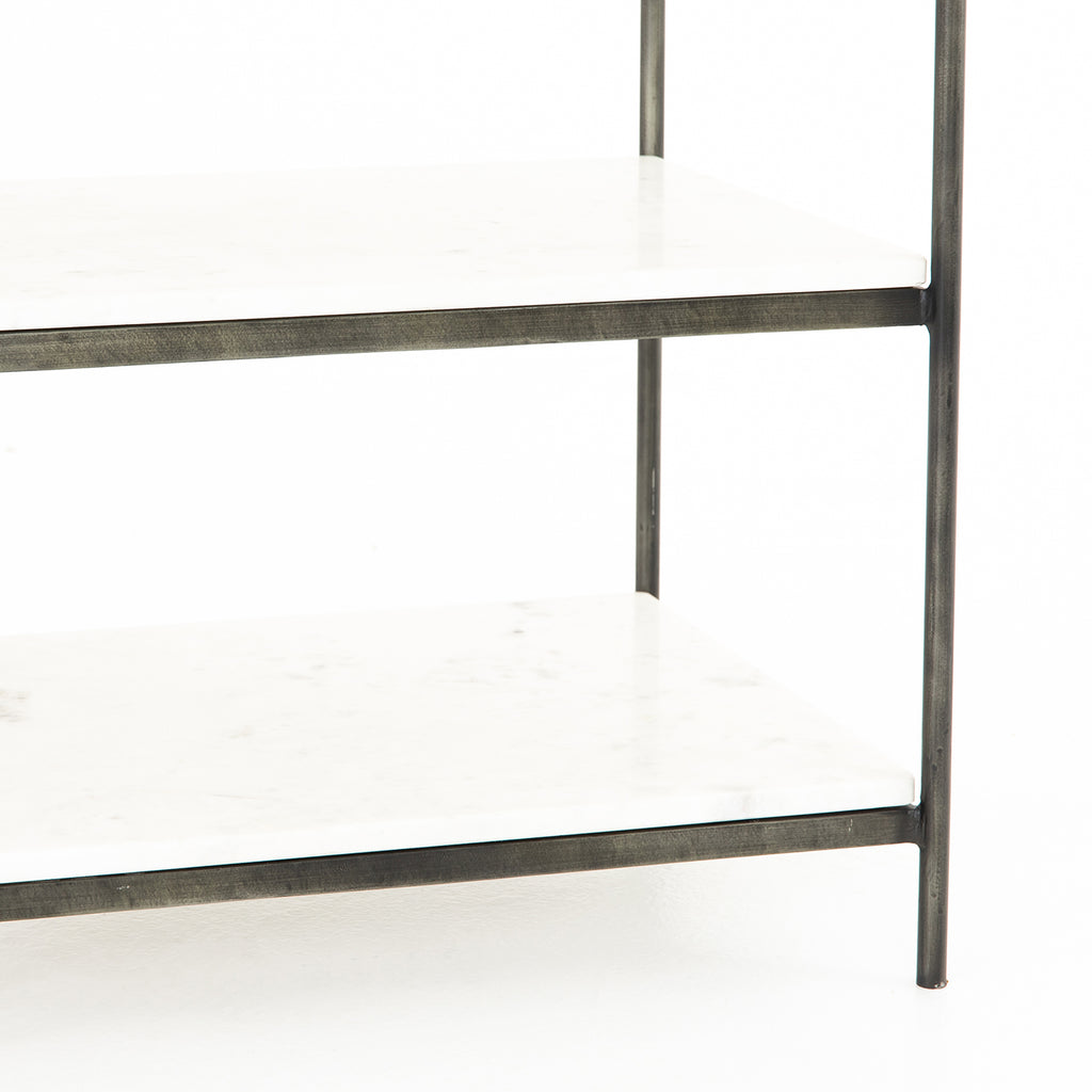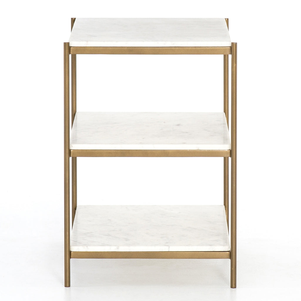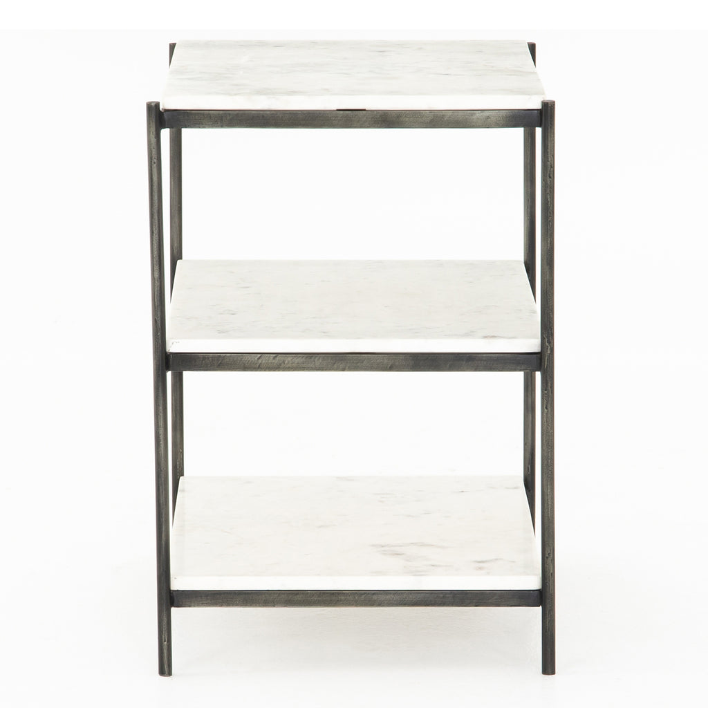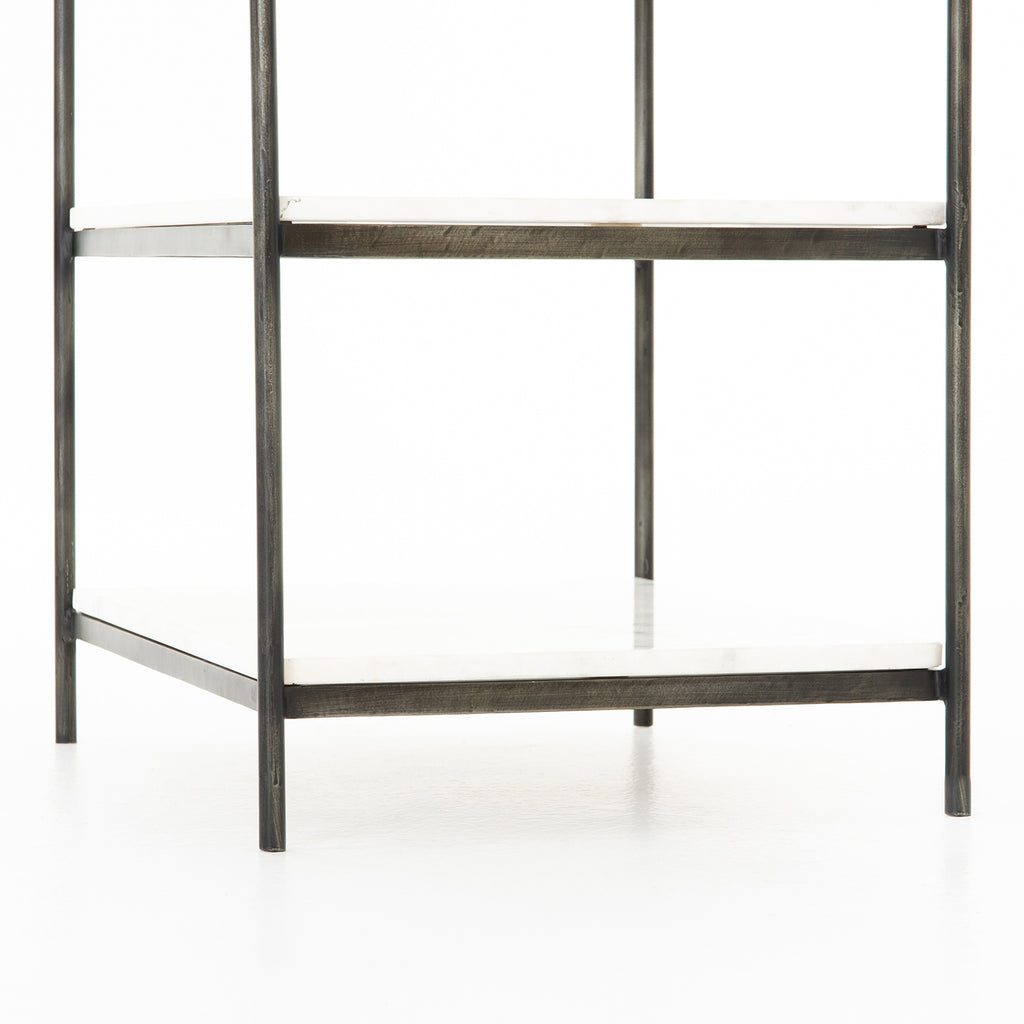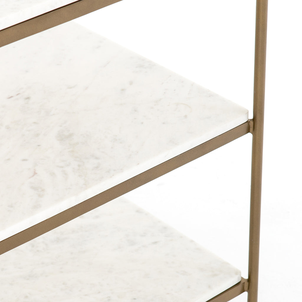Resolutely modern, Four Hands furniture collection mixes materials and influences for a fresh, inspired look. Add a pop of sophistication to any space. Classic white marble lays three tiers of smooth shelving for plenty of space, while antique brass-or hammered gray finished iron framing places a feminine spin on bedside storage.