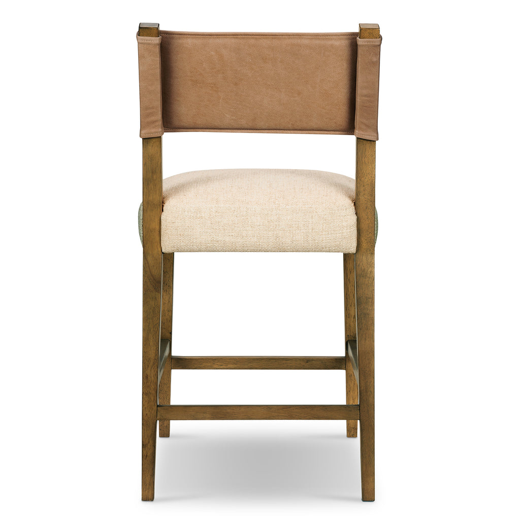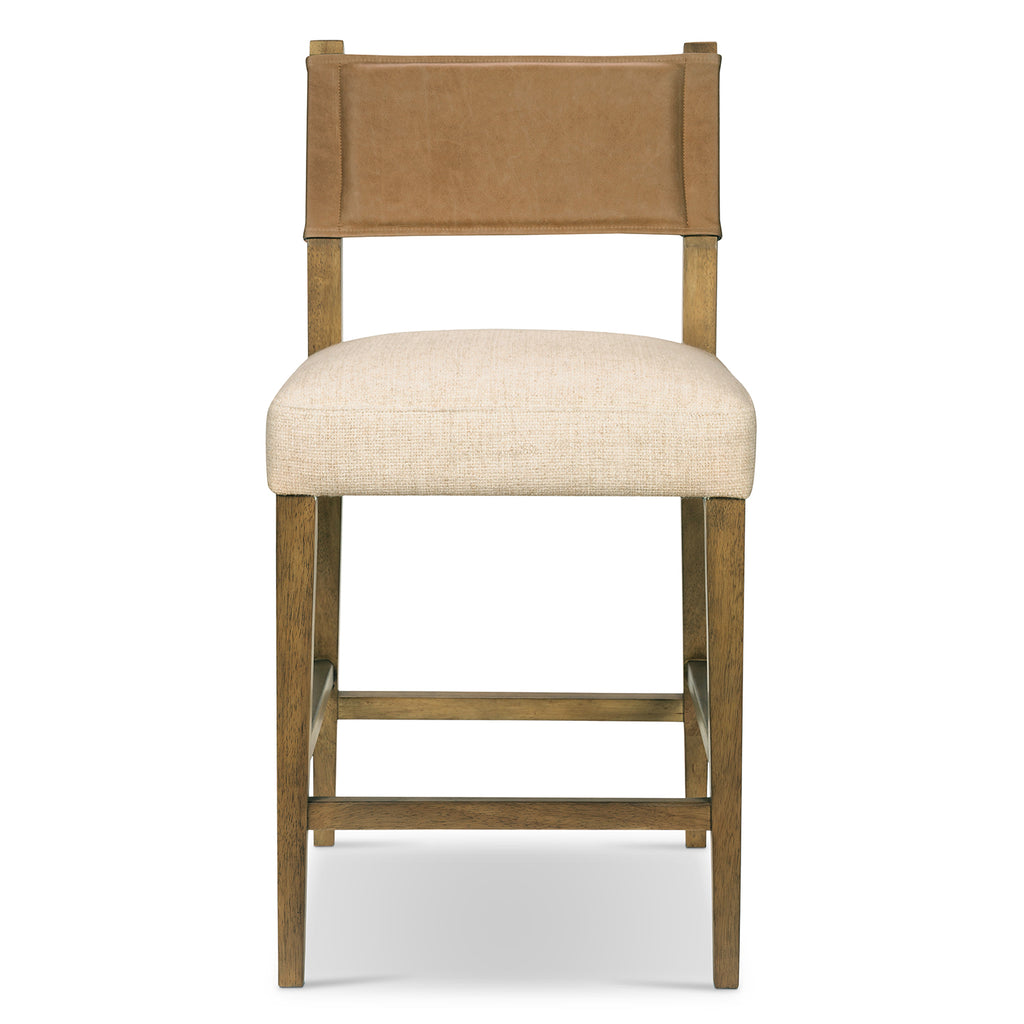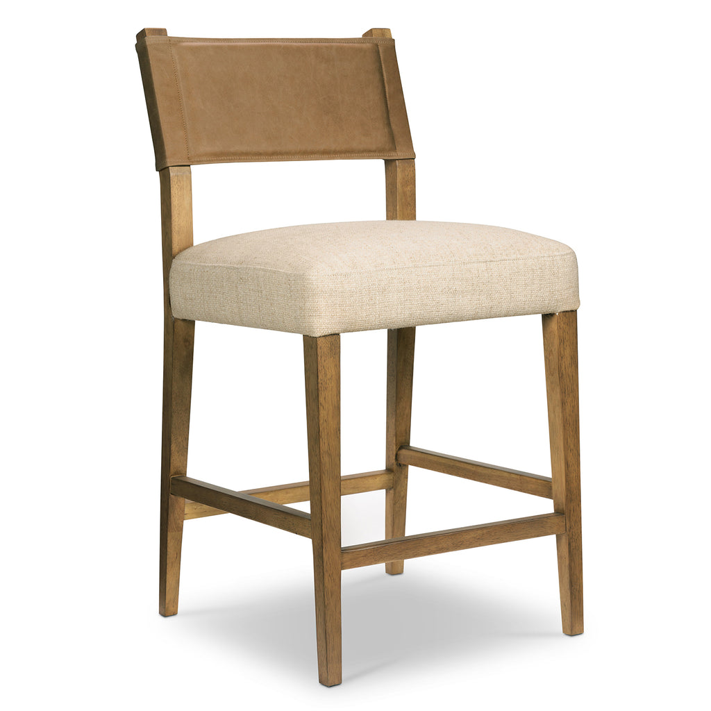 Mixed materials at their finest. Solid, burnished parawood frame with squared seating is upholstered in high-performance fabric. Beige top-grain leather backing takes this modern-minded stool to the next level. Performance fabrics are specially created to withstand spills, stains, high traffic and wear, ensuring long-term comfort and unmatched durability.