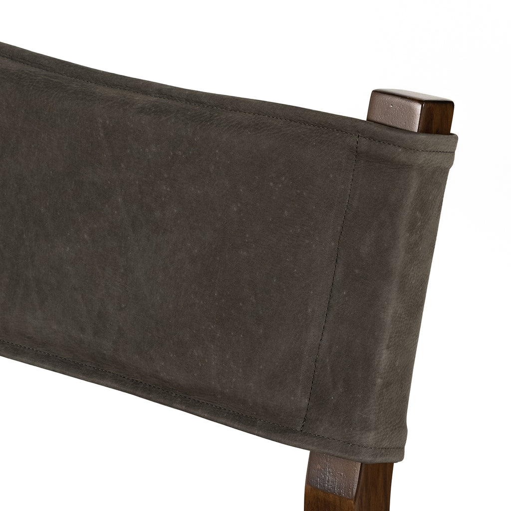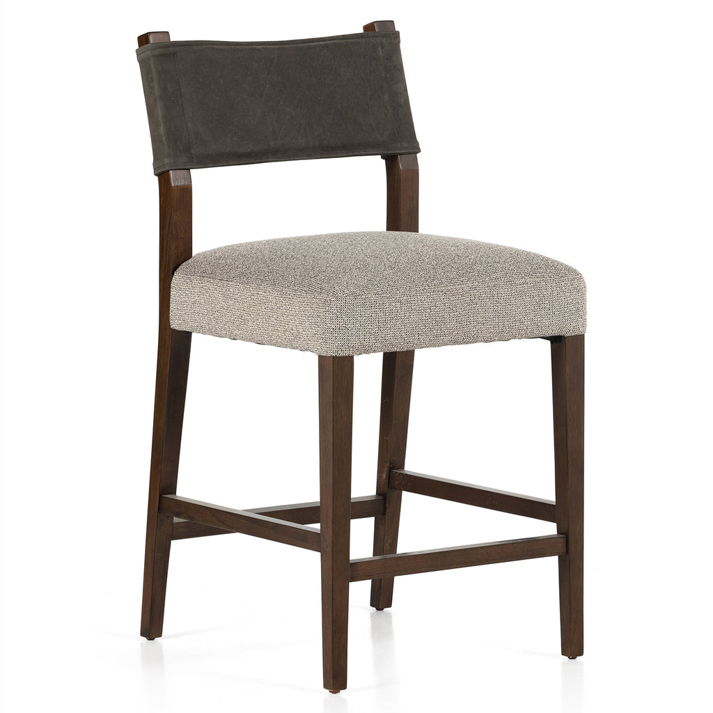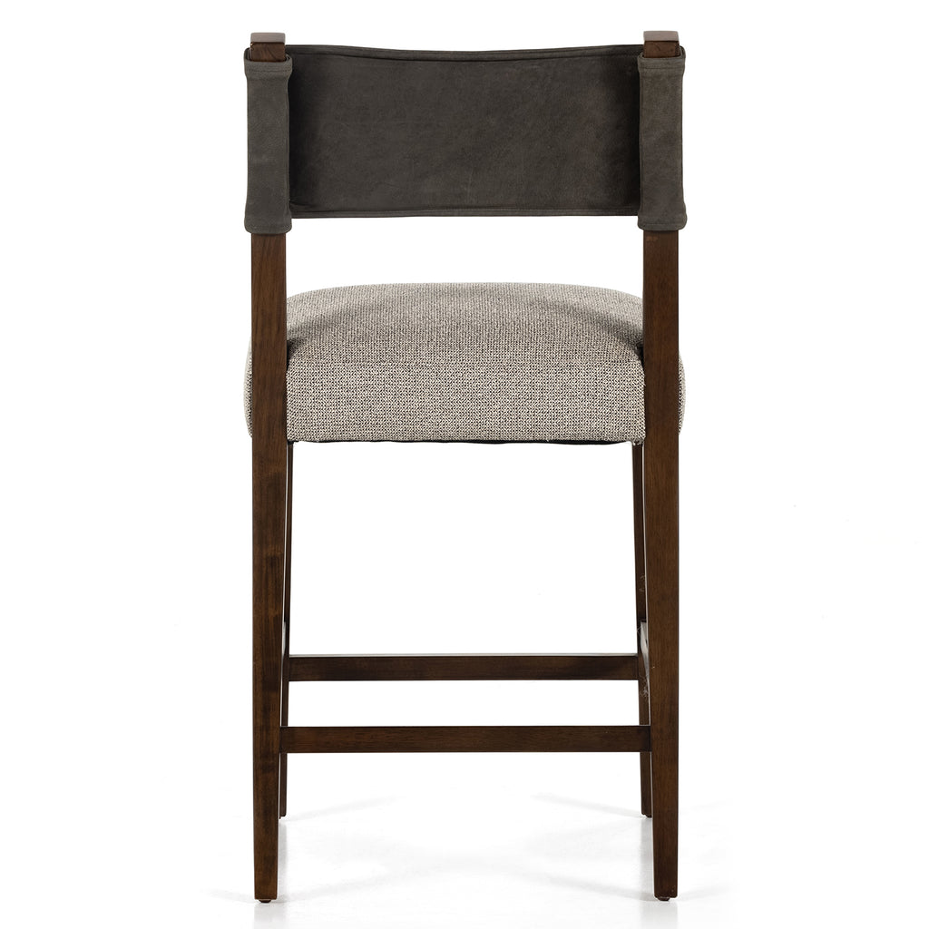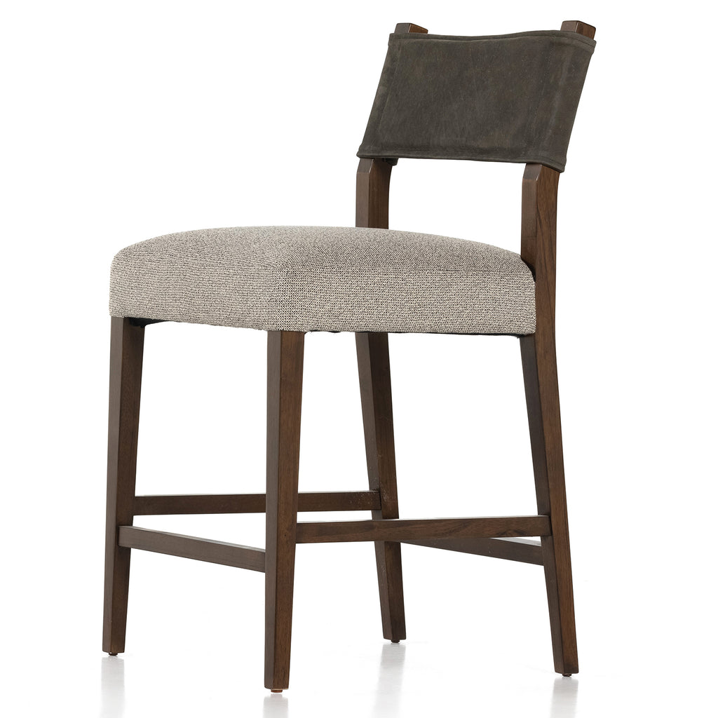 Mixed materials at their finest. Solid, burnished parawood frame with squared seating is upholstered in high-performance fabric. Beige top-grain leather backing takes this modern-minded stool to the next level. Performance fabrics are specially created to withstand spills, stains, high traffic and wear, ensuring long-term comfort and unmatched durability.
