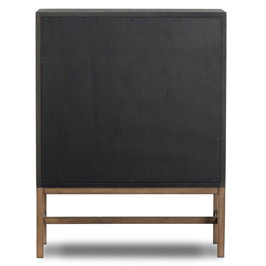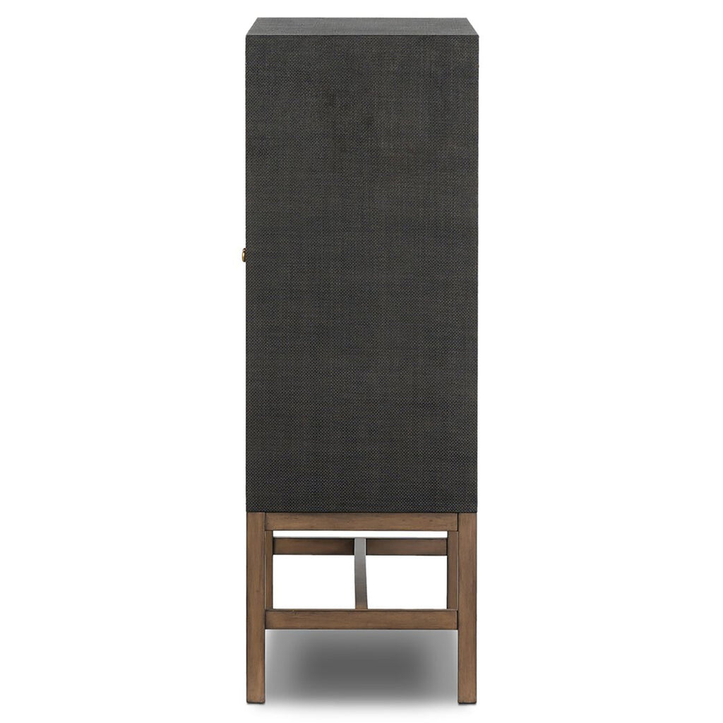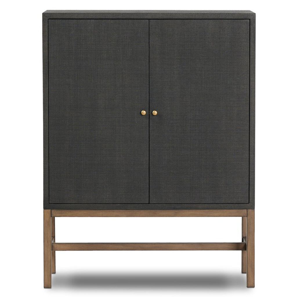 Woven black raffia places a texture-driven twist on cabinetry. Simple hardware finished in an antique brass, all supported by an open, airy base of solid mahogany.