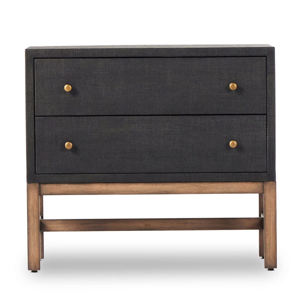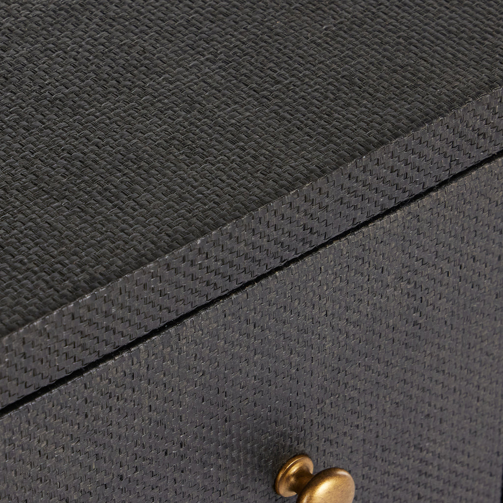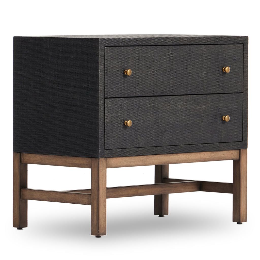 Woven black raffia offers a texture-driven take on bedside storage. Antique brass-finished iron hardware adorns dual drawers supported by a solid mahogany base.