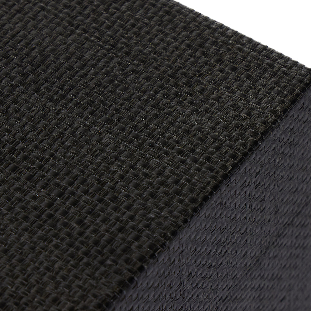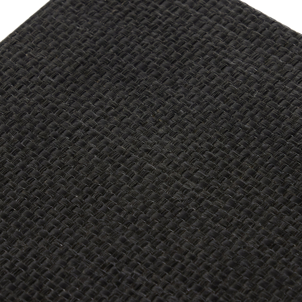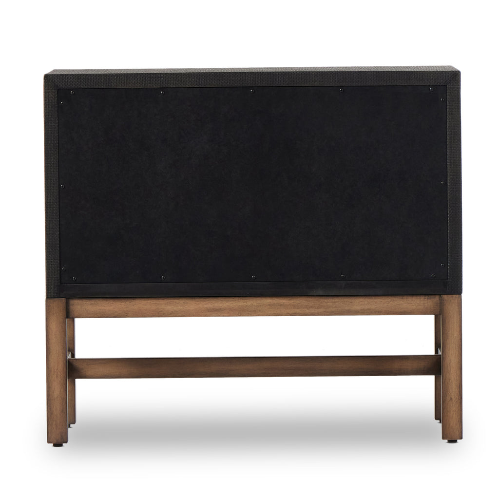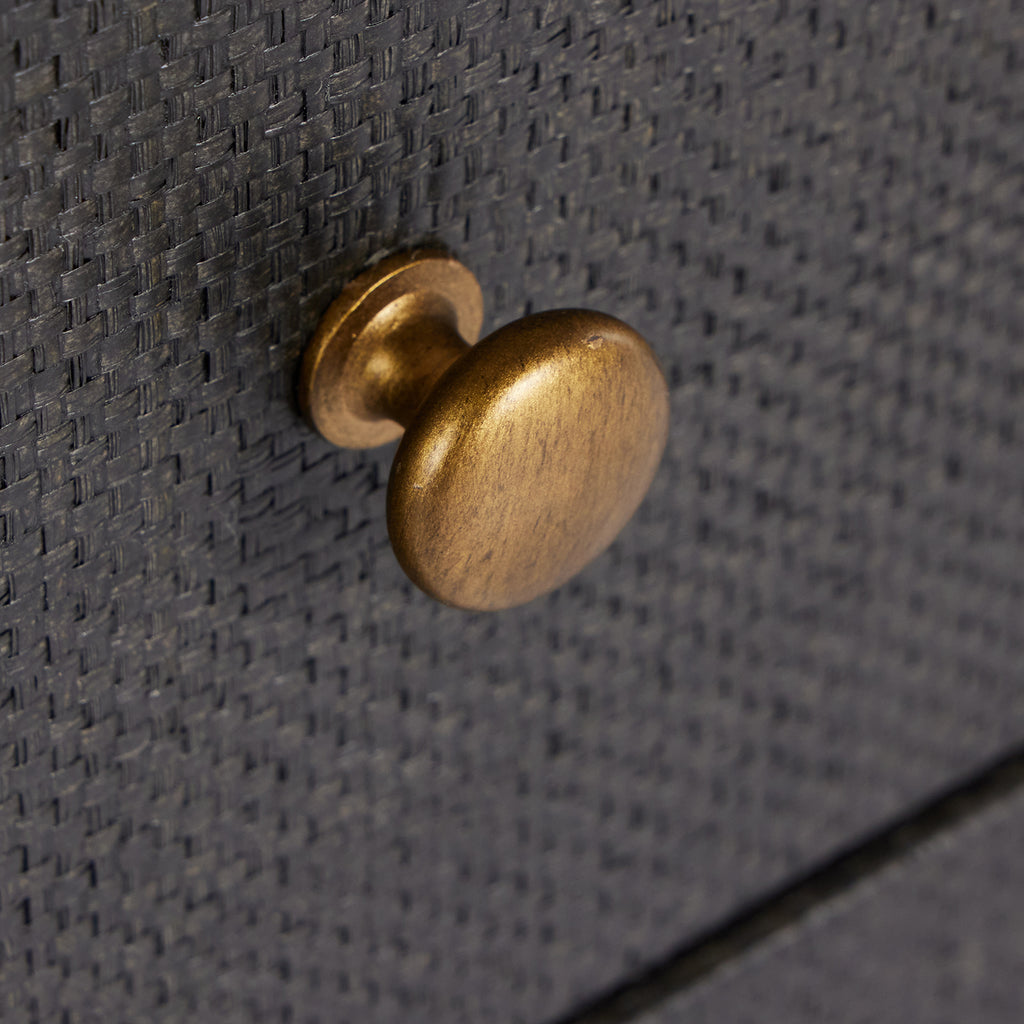 Woven black raffia offers a texture-driven take on bedside storage. Antique brass-finished iron hardware adorns dual drawers supported by a solid mahogany base.
