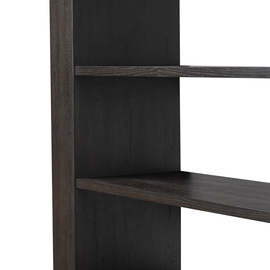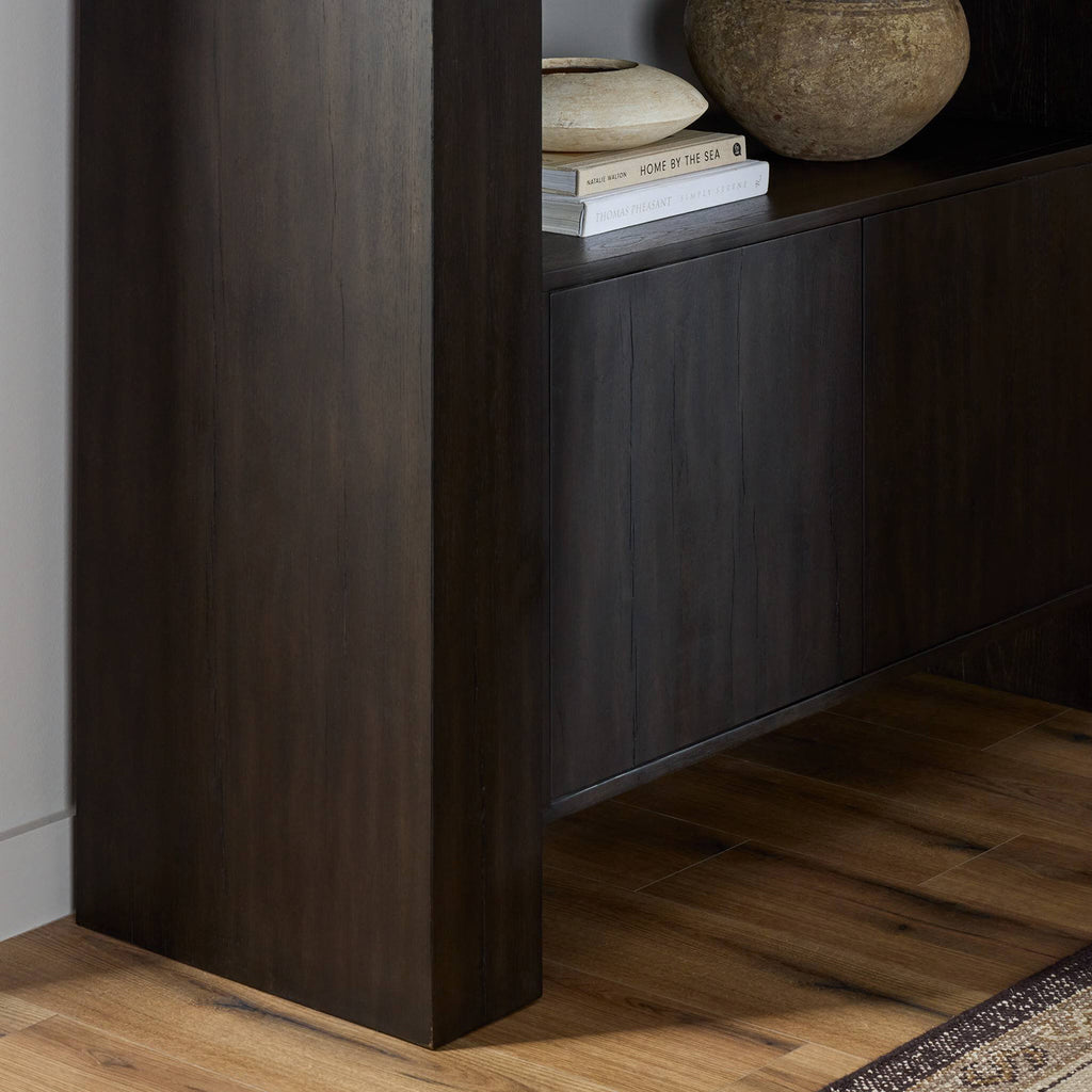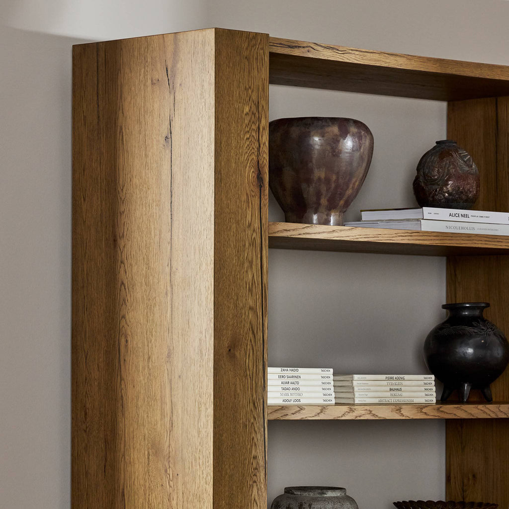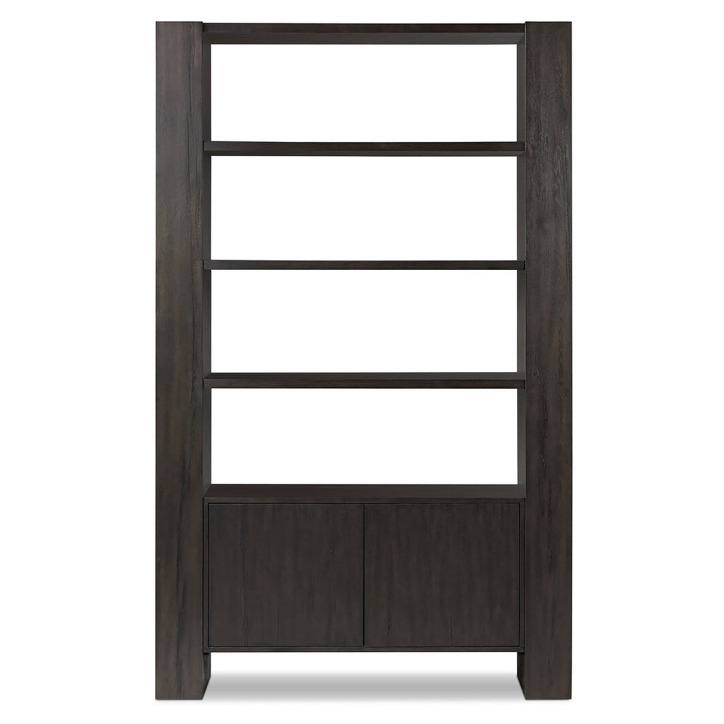 Organize your favorite books and belongings in this stately bookcase of solid oak and thick oak veneer. Rich with natural cracks and wood graining, with long, oversized legs flanking wide open shelves. Lower cabinetry brings bonus storage to this timeless, versatile piece.