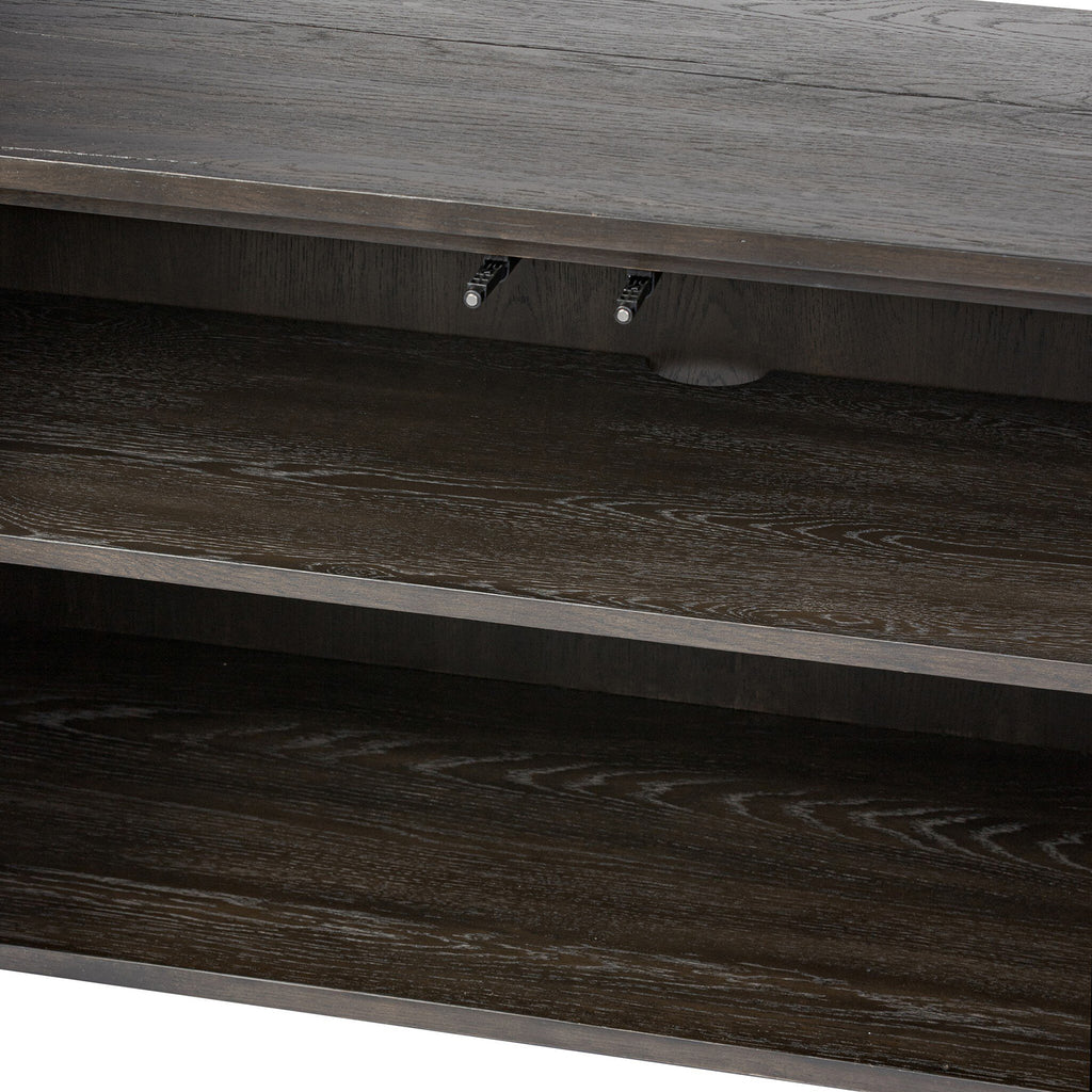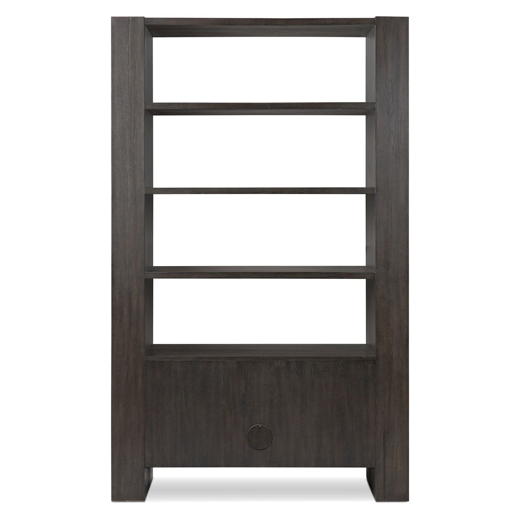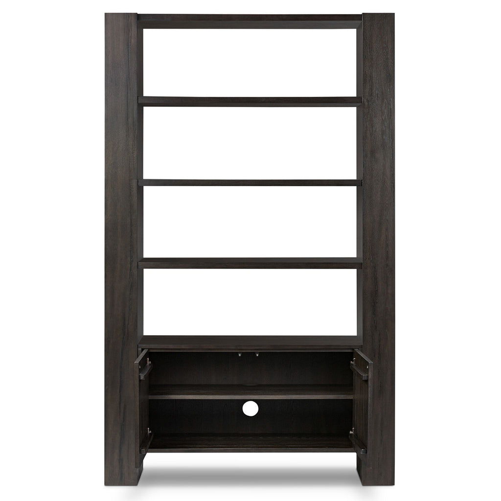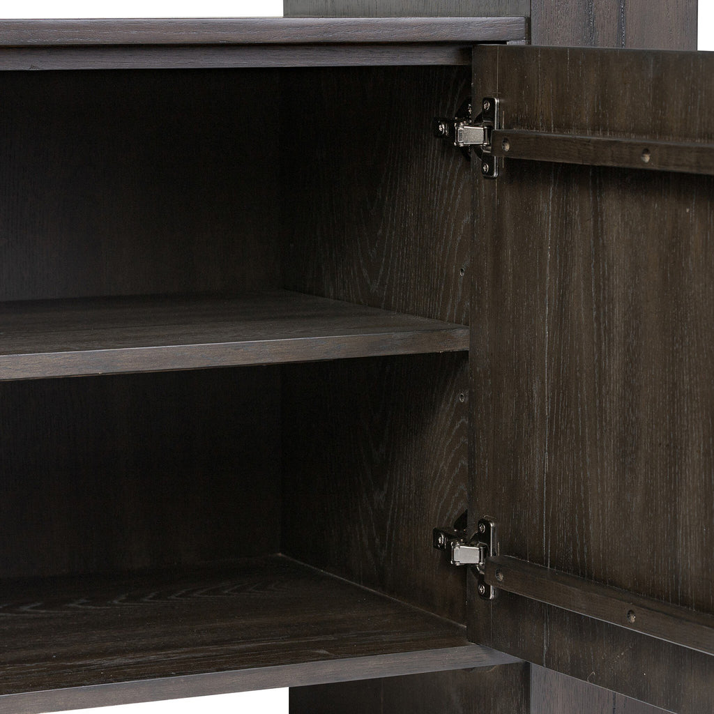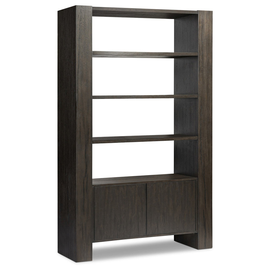 Organize your favorite books and belongings in this stately bookcase of solid oak and thick oak veneer. Rich with natural cracks and wood graining, with long, oversized legs flanking wide open shelves. Lower cabinetry brings bonus storage to this timeless, versatile piece.