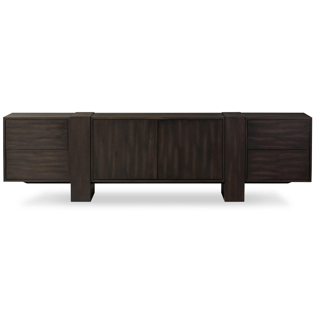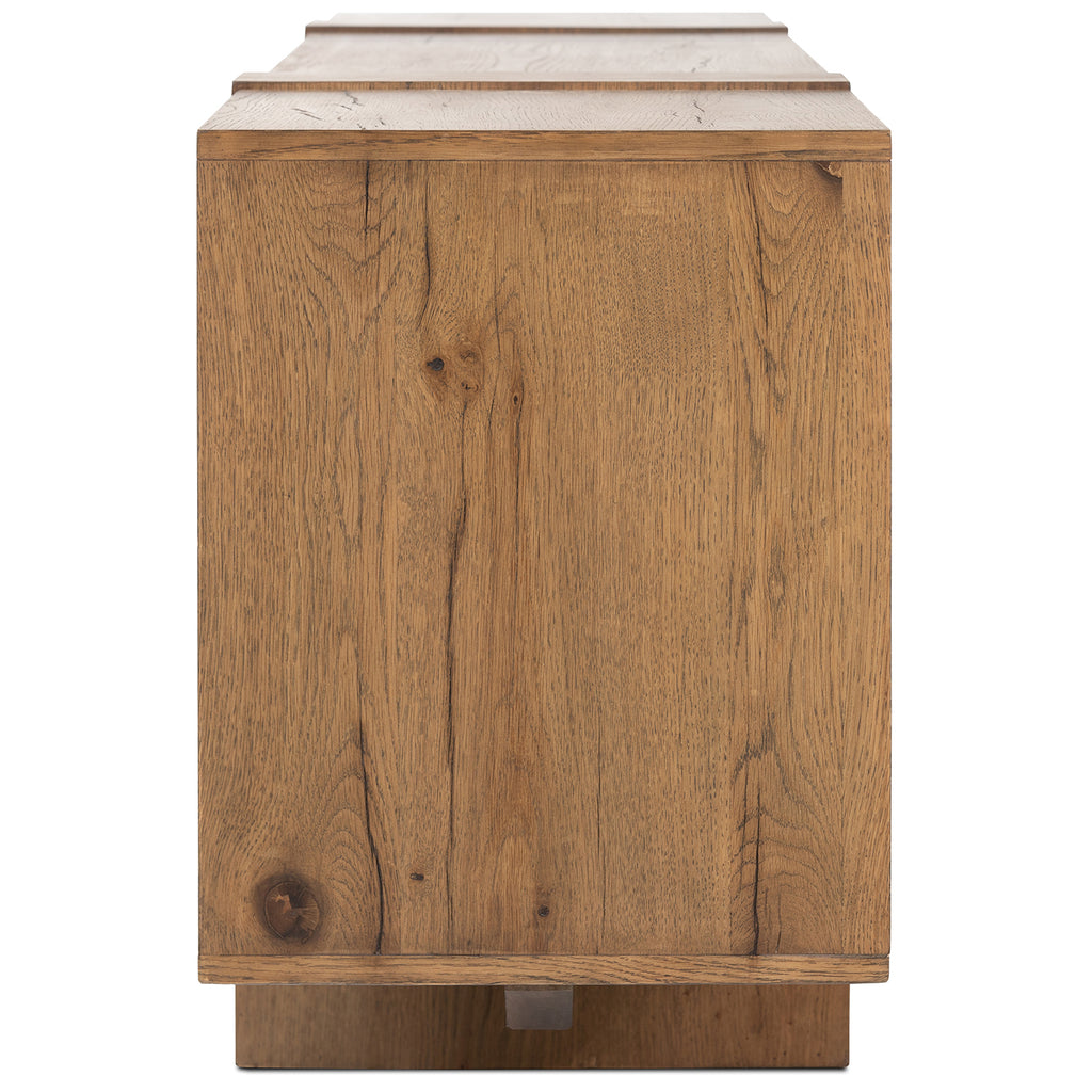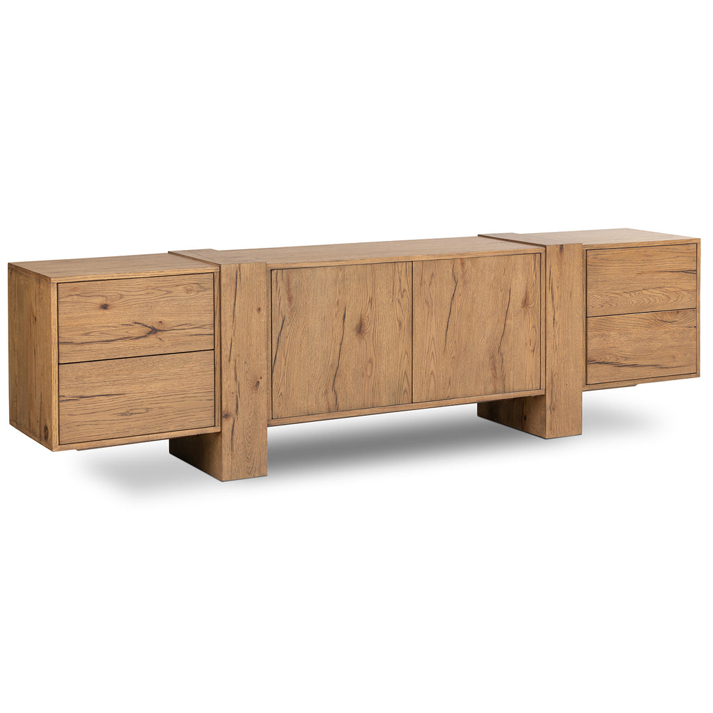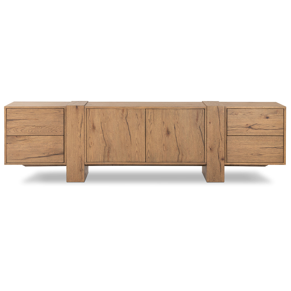Crafted from a mix of solid oak and thick oak veneer, the contemporary shaping of this grand-scale media console lets the natural graining, cracking and character of the woods take center stage. Designed with oversized legs and cantilevered doors, with push latch doors.