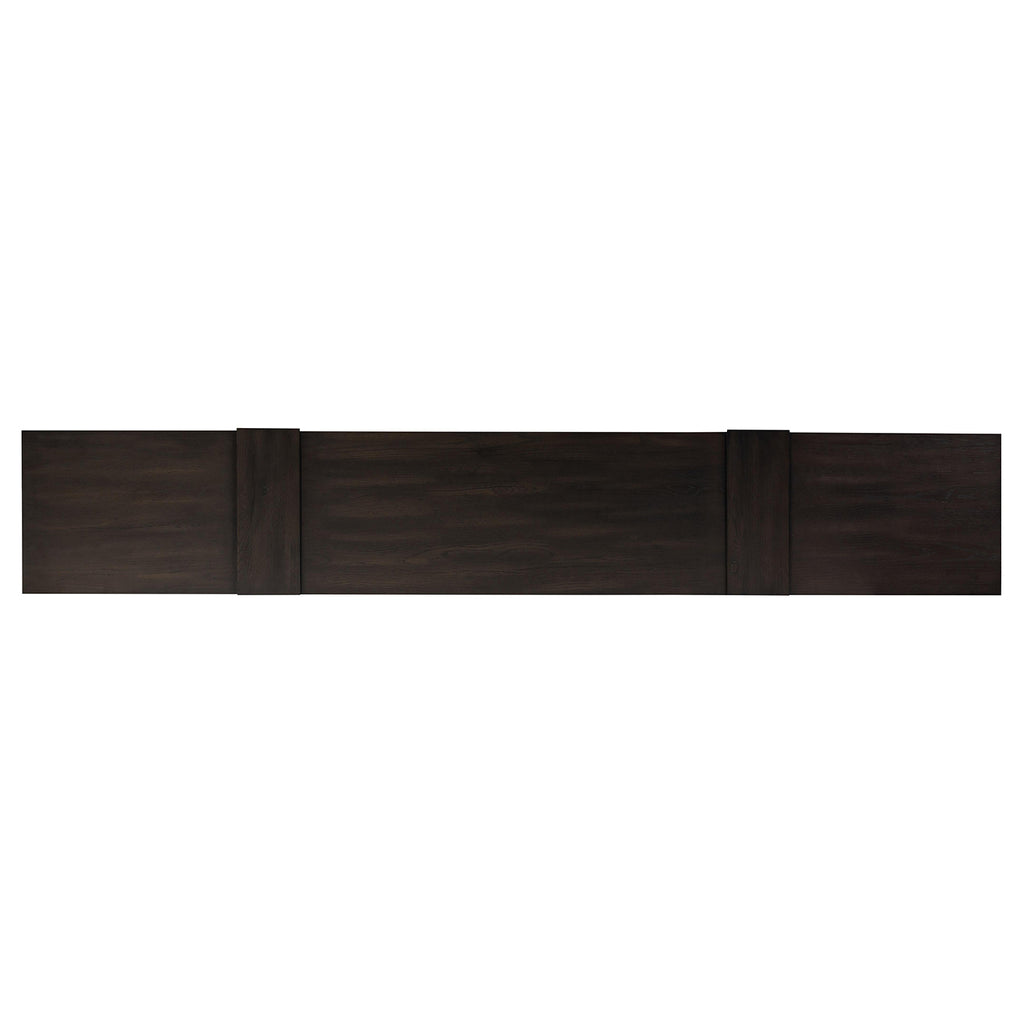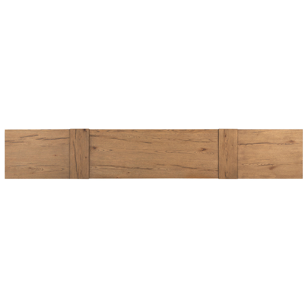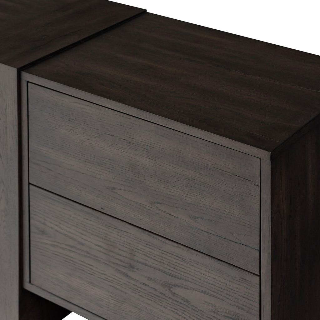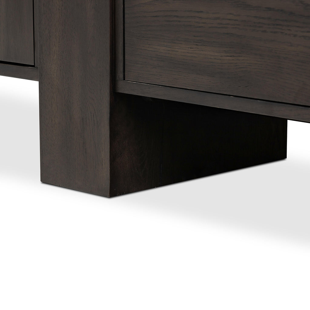 Crafted from a mix of solid oak and thick oak veneer, the contemporary shaping of this grand-scale media console lets the natural graining, cracking and character of the woods take center stage. Designed with oversized legs and cantilevered doors, with push latch doors.