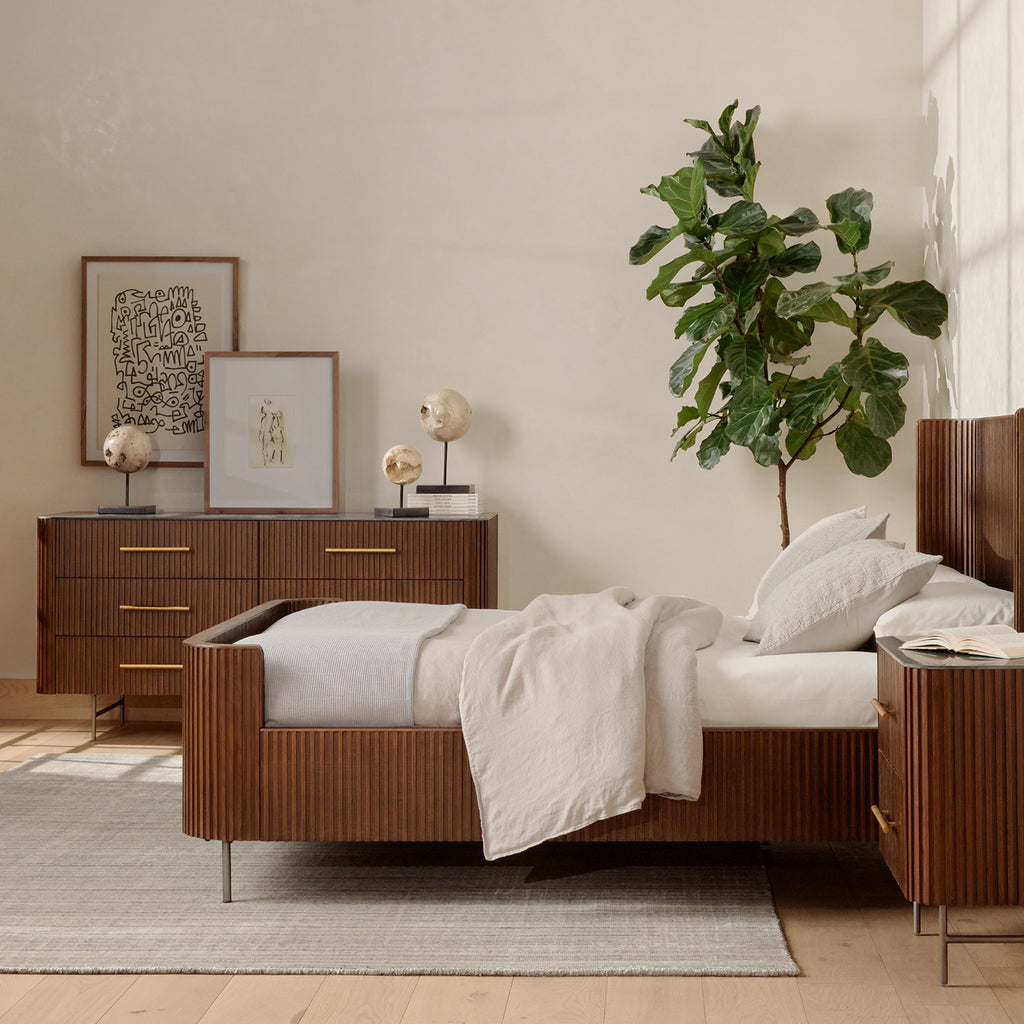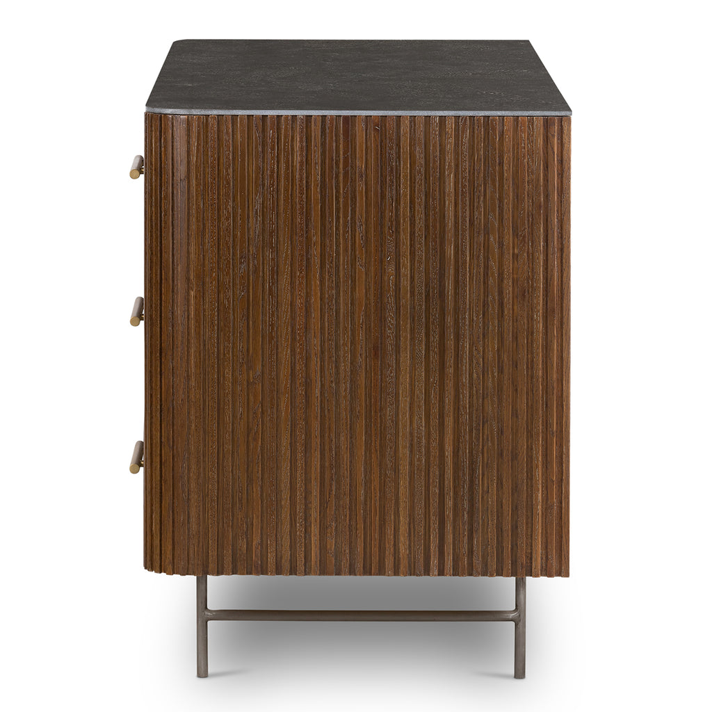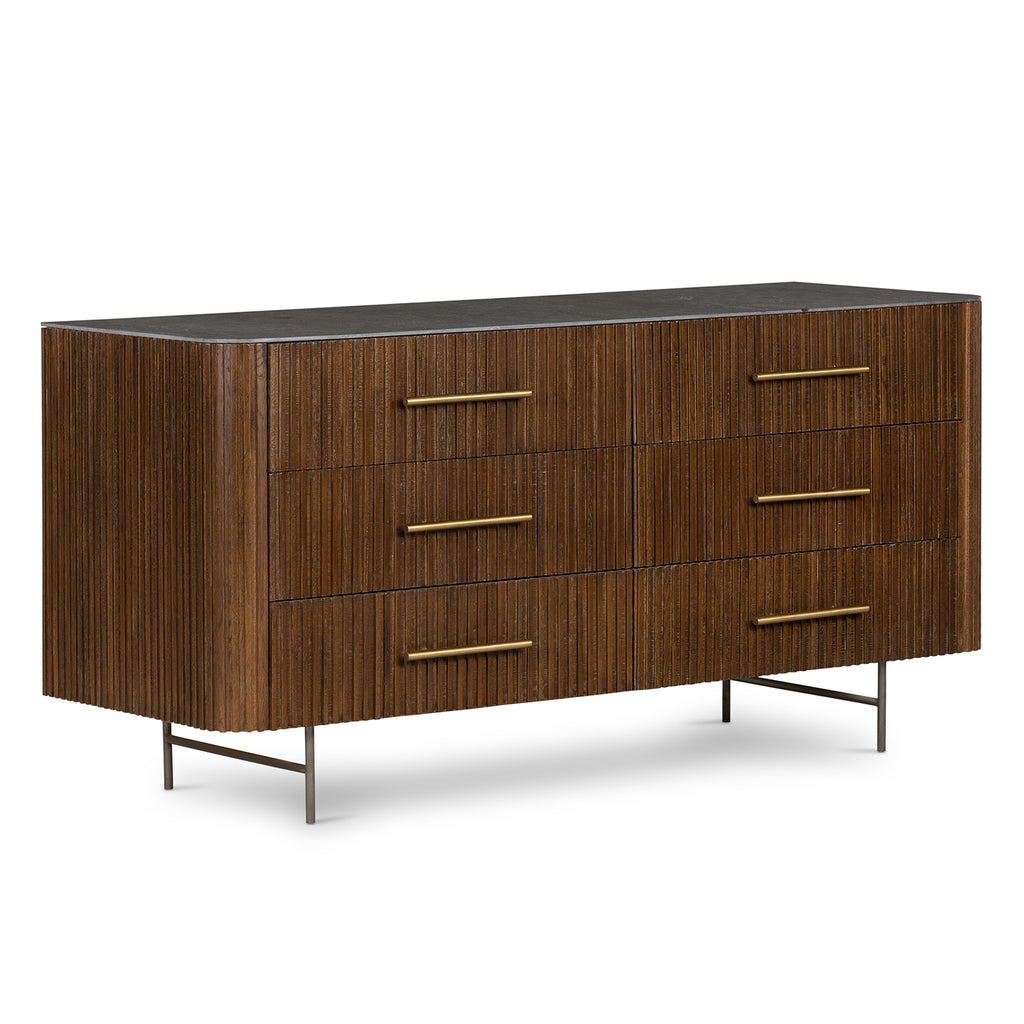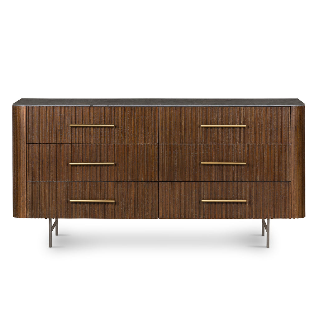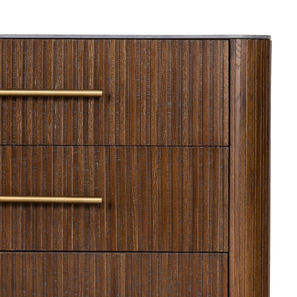 Rich with reeding for great texture and a linear look, brown-finished solid oak flaunts six spacious drawers with polished brass hardware and coolly curved corners, while a bluestone top brings a beautifully complementary material mix to bedroom storage.