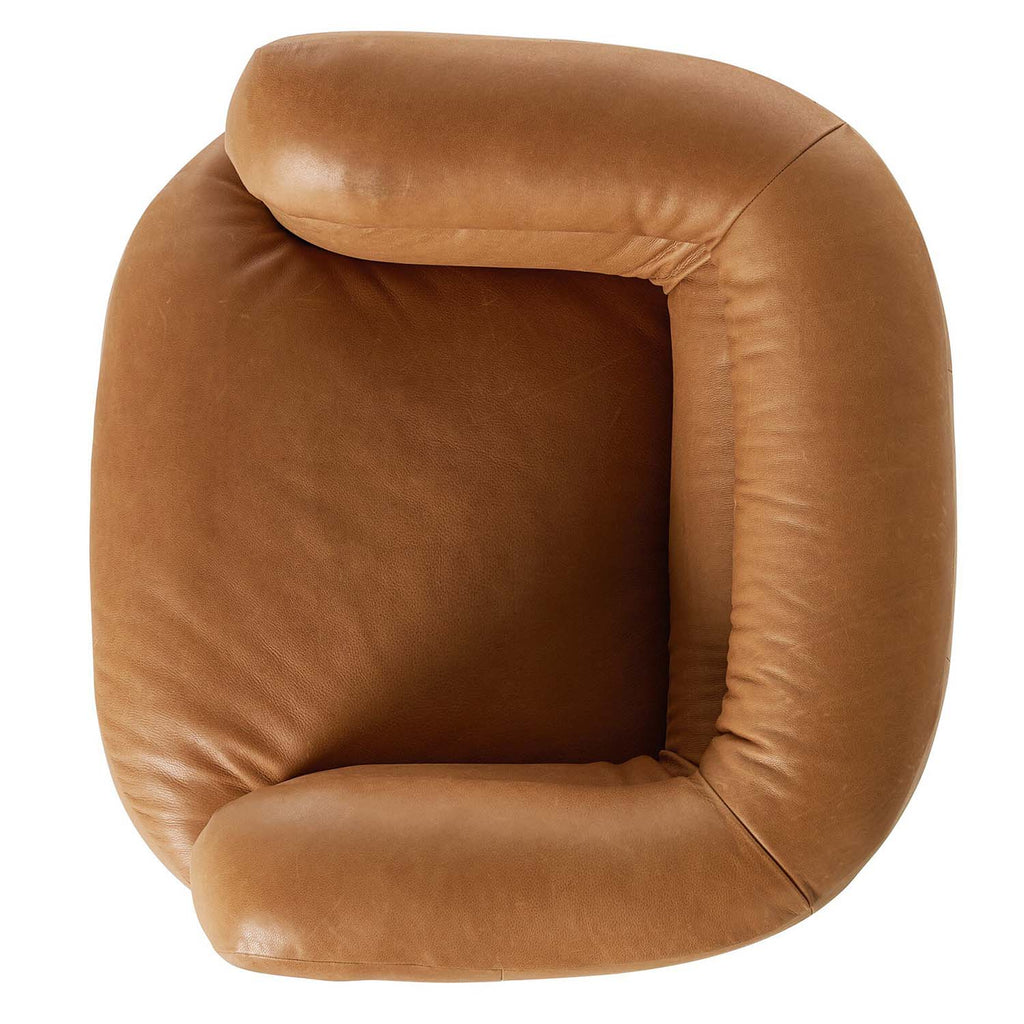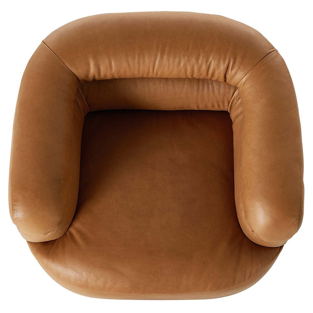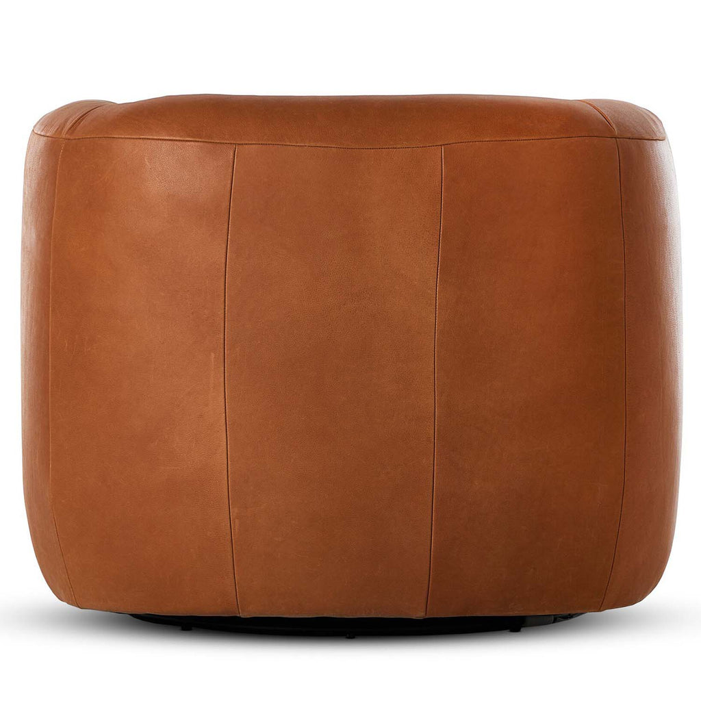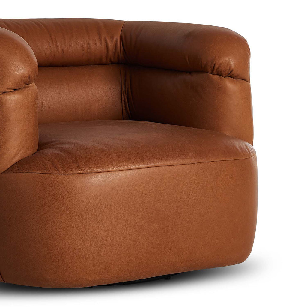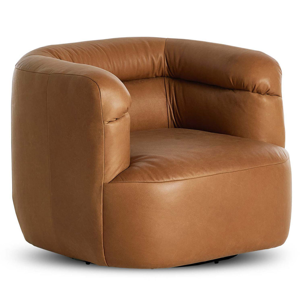 A vintage-inspired swivel chair meets comfort. Upholstered in butterscotch leather, the piece pairs purposely imperfect back channels with S-spring suspension for supportive, comfortable seating. Subtle gathers and folds add character. Upholstered in a soft, supple Brazilian-made leather with subtle texture throughout.